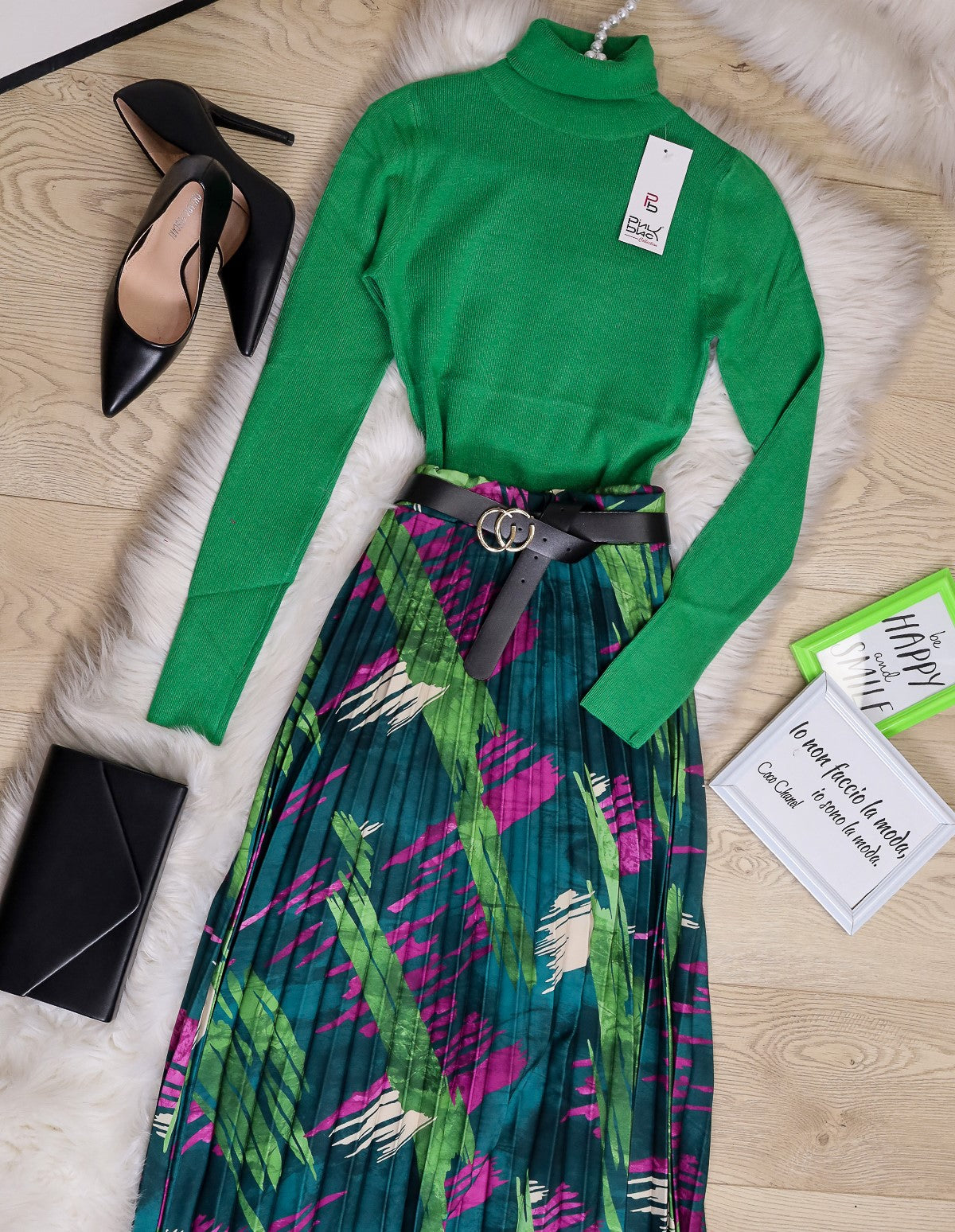 Gonna lunga plissè in tessuto strutturato con fantasia astratta, fascia elastica in vita e cintura inclusa. Fabbricato in Italia.