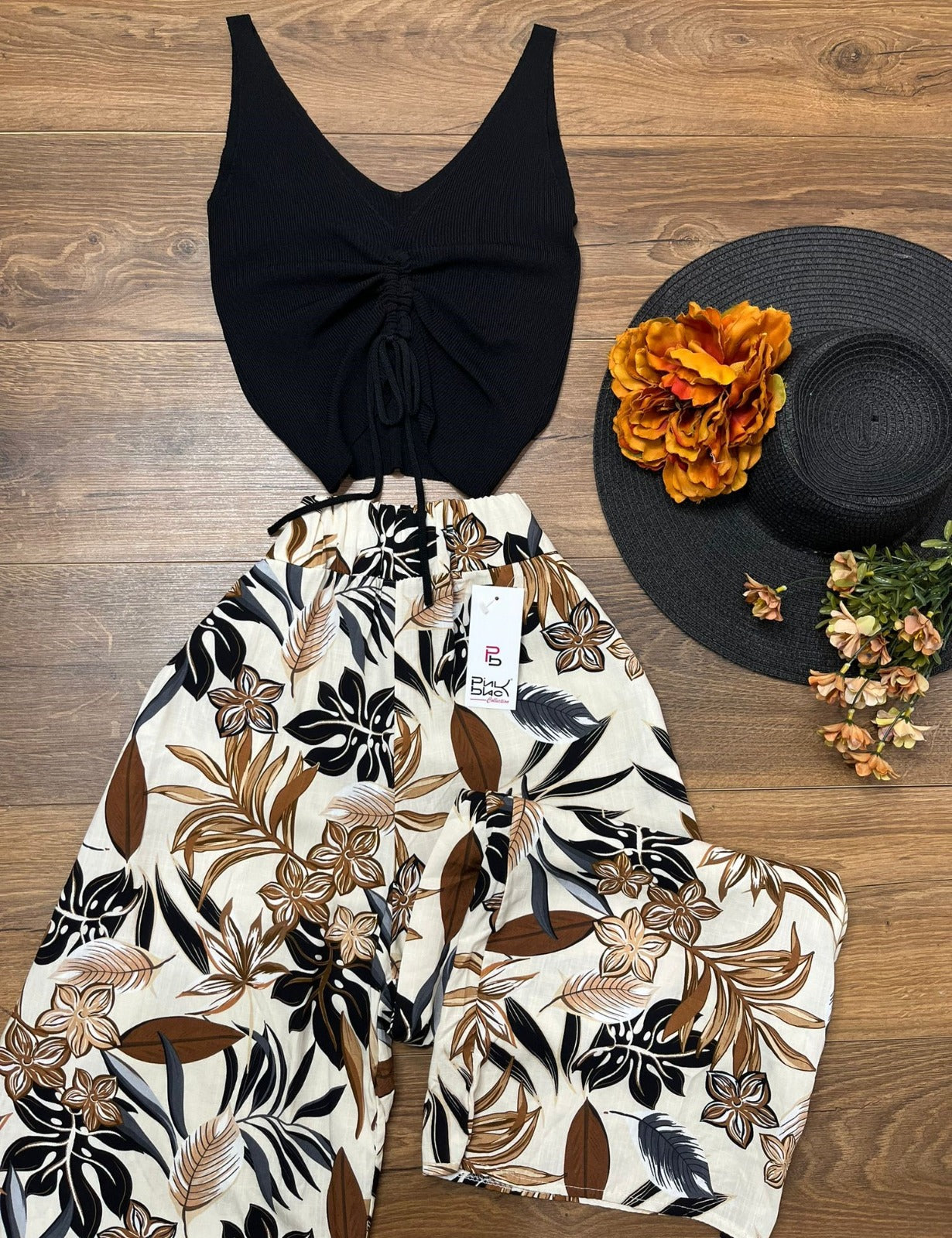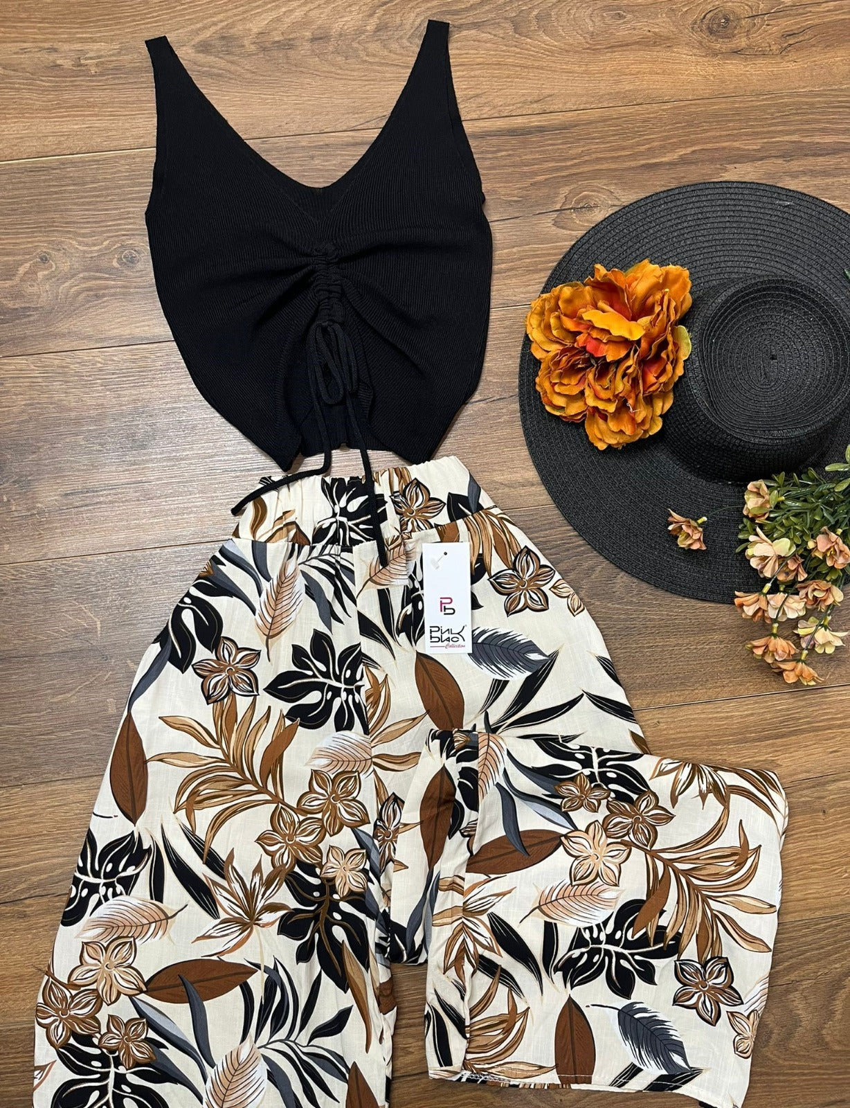 Pantalone palazzo in viscosa con fantasia floreale fascia elastica in vita e tasche. Fabbricato in Italia.