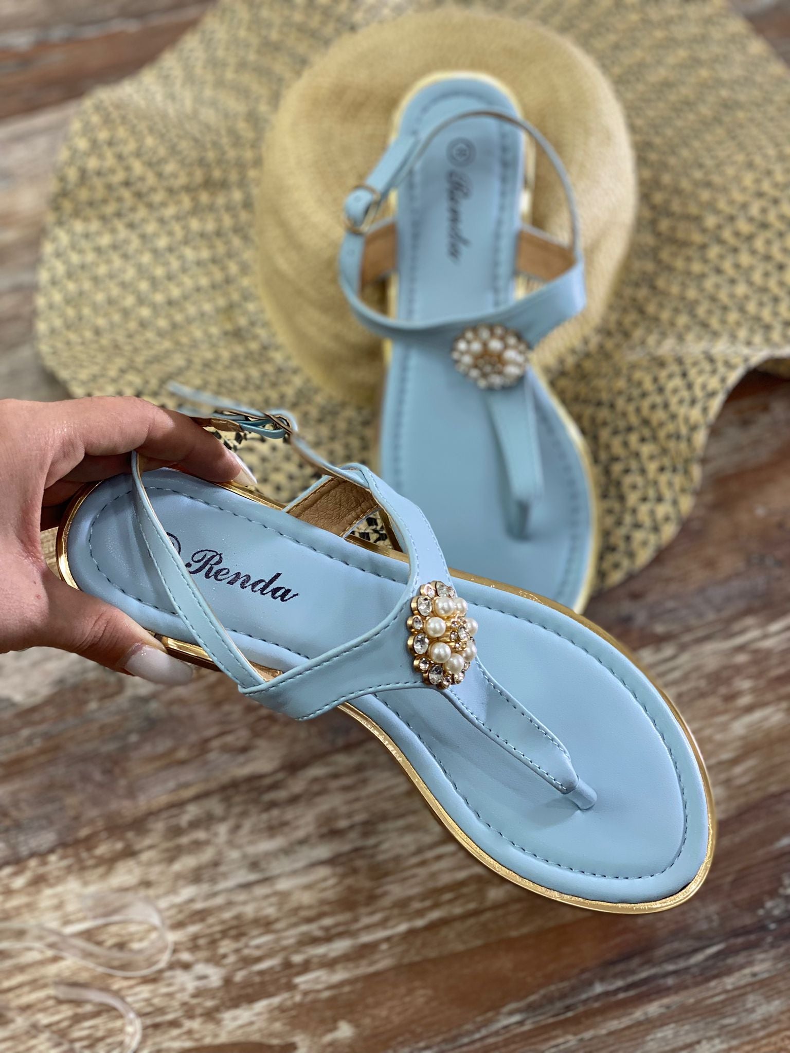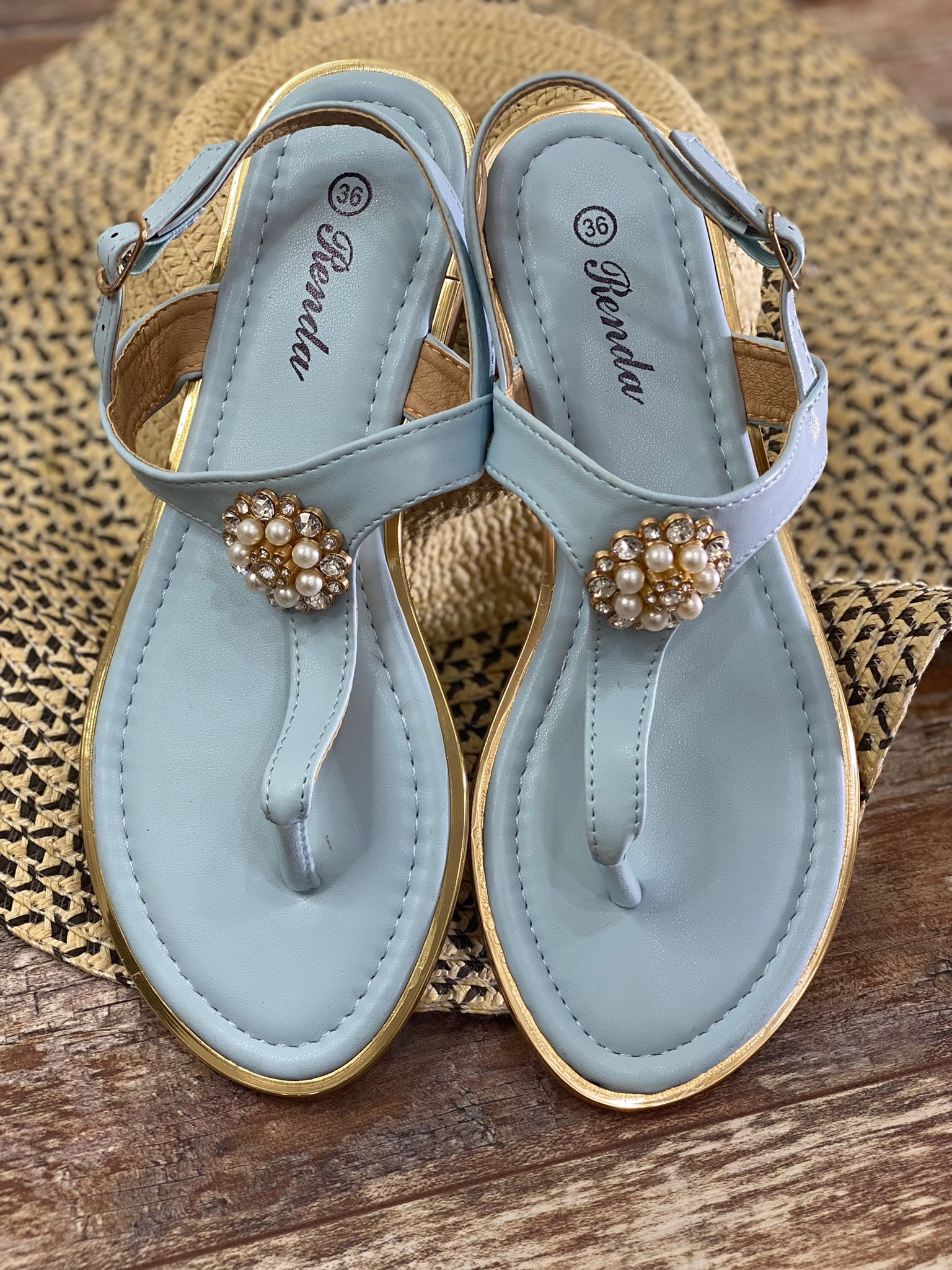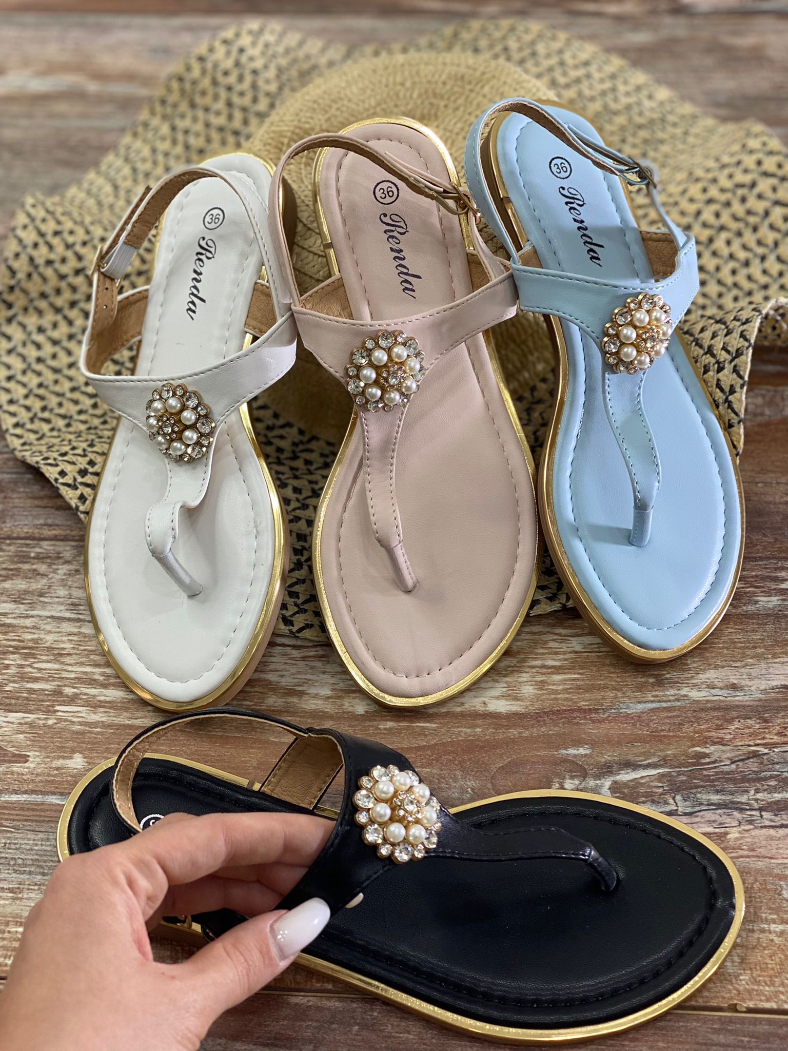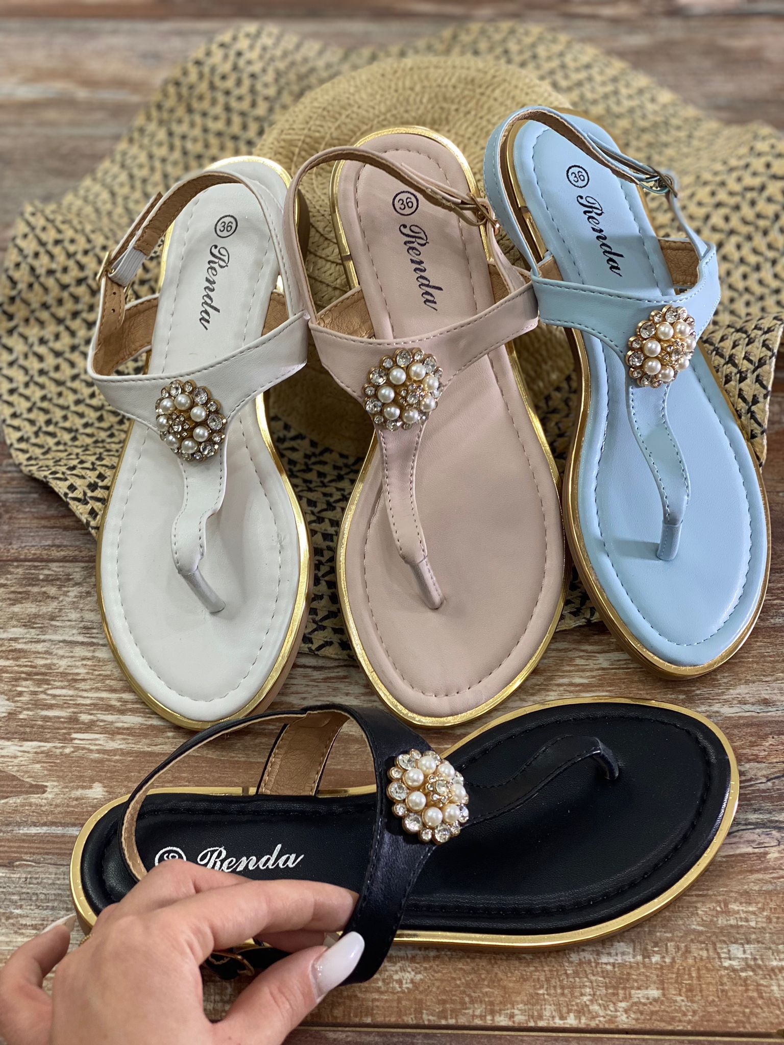 Sandalo infradito con applicazione di pietre e perle sintetiche.