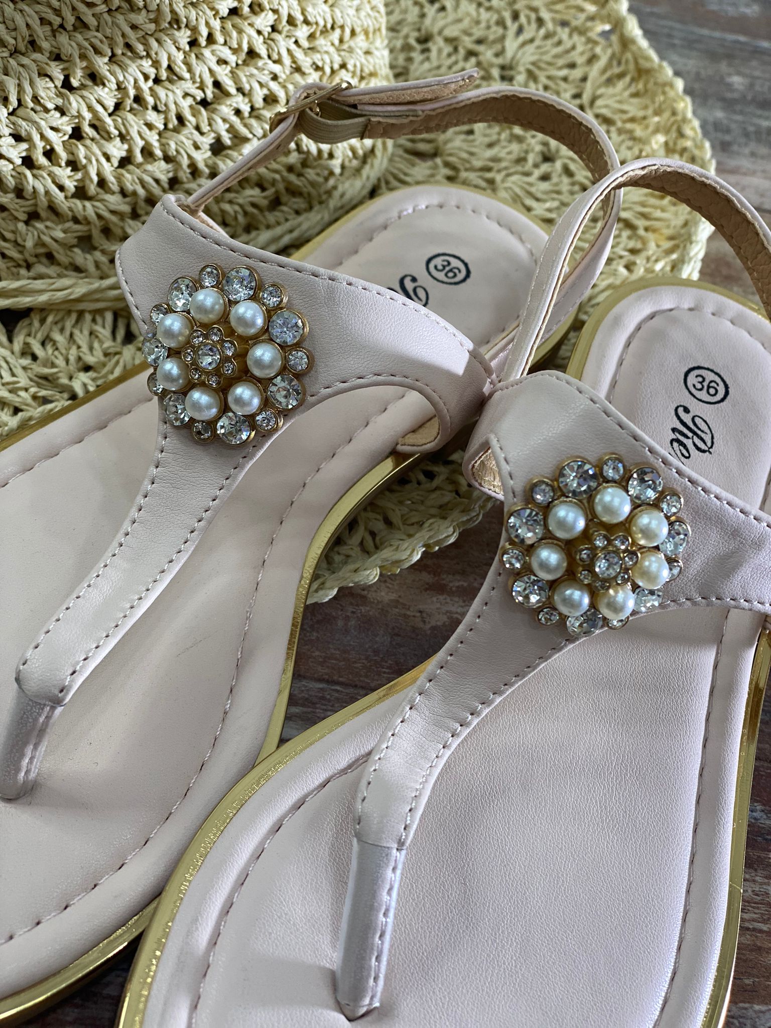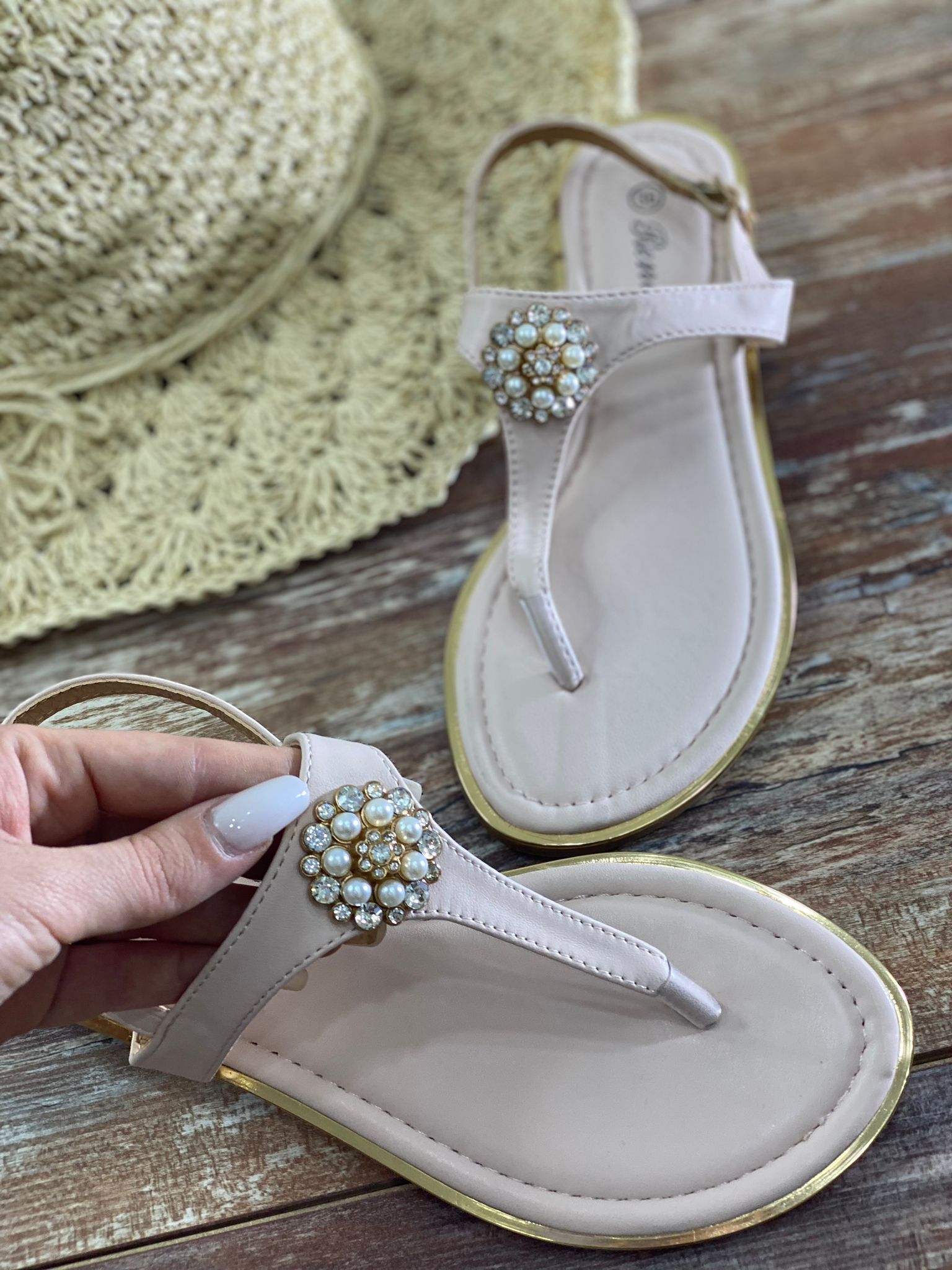 Sandalo infradito con applicazione di pietre e perle sintetiche.