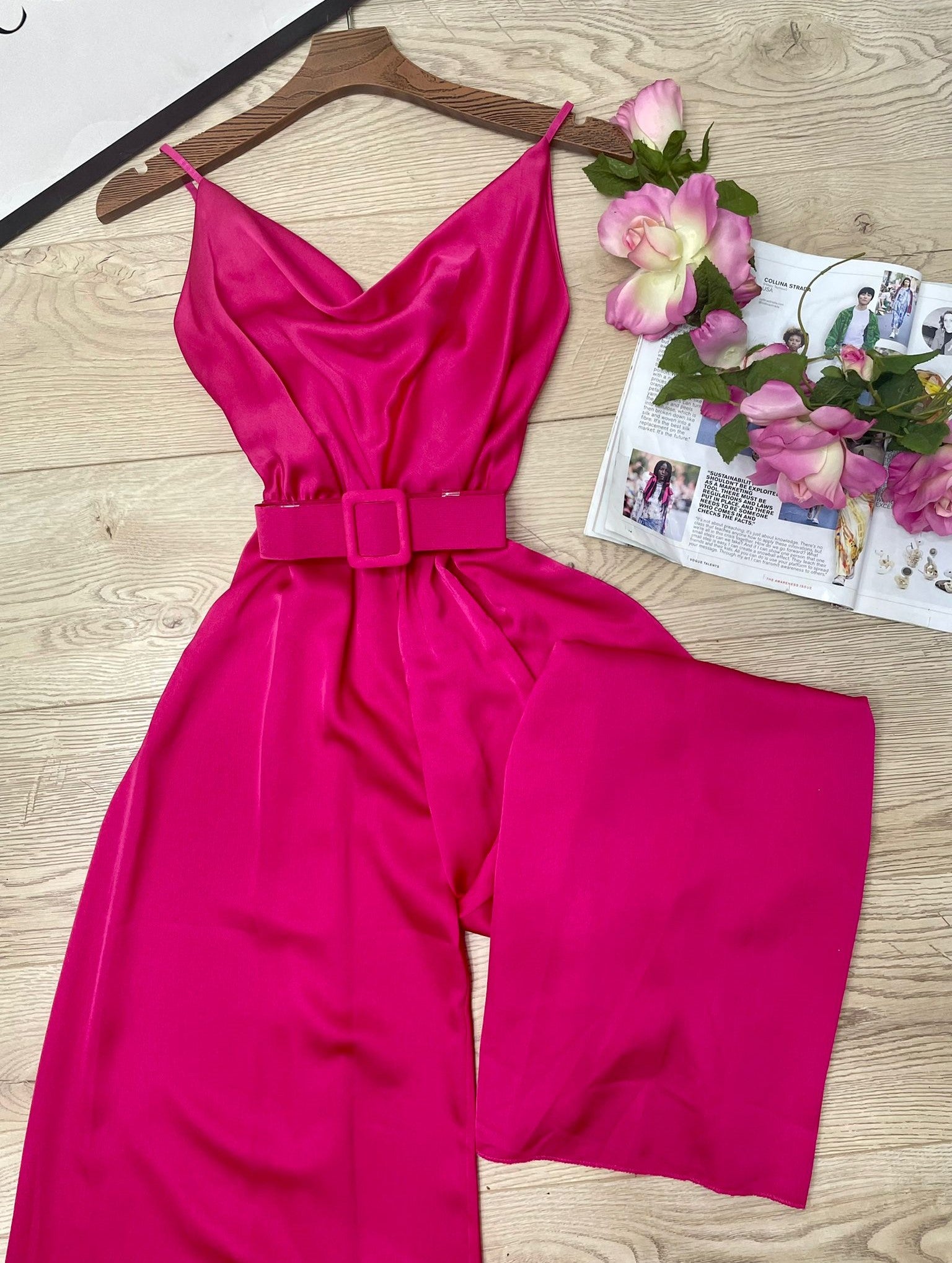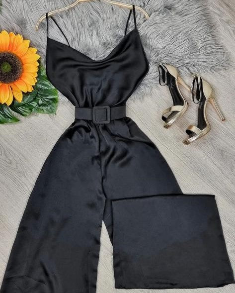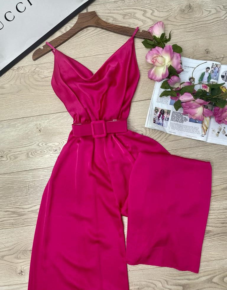 Tuta in raso con fascia elastica sul retro, spalline regolabili, pantalone palazzo e cintura inclusa. Fabbricato in Italia.