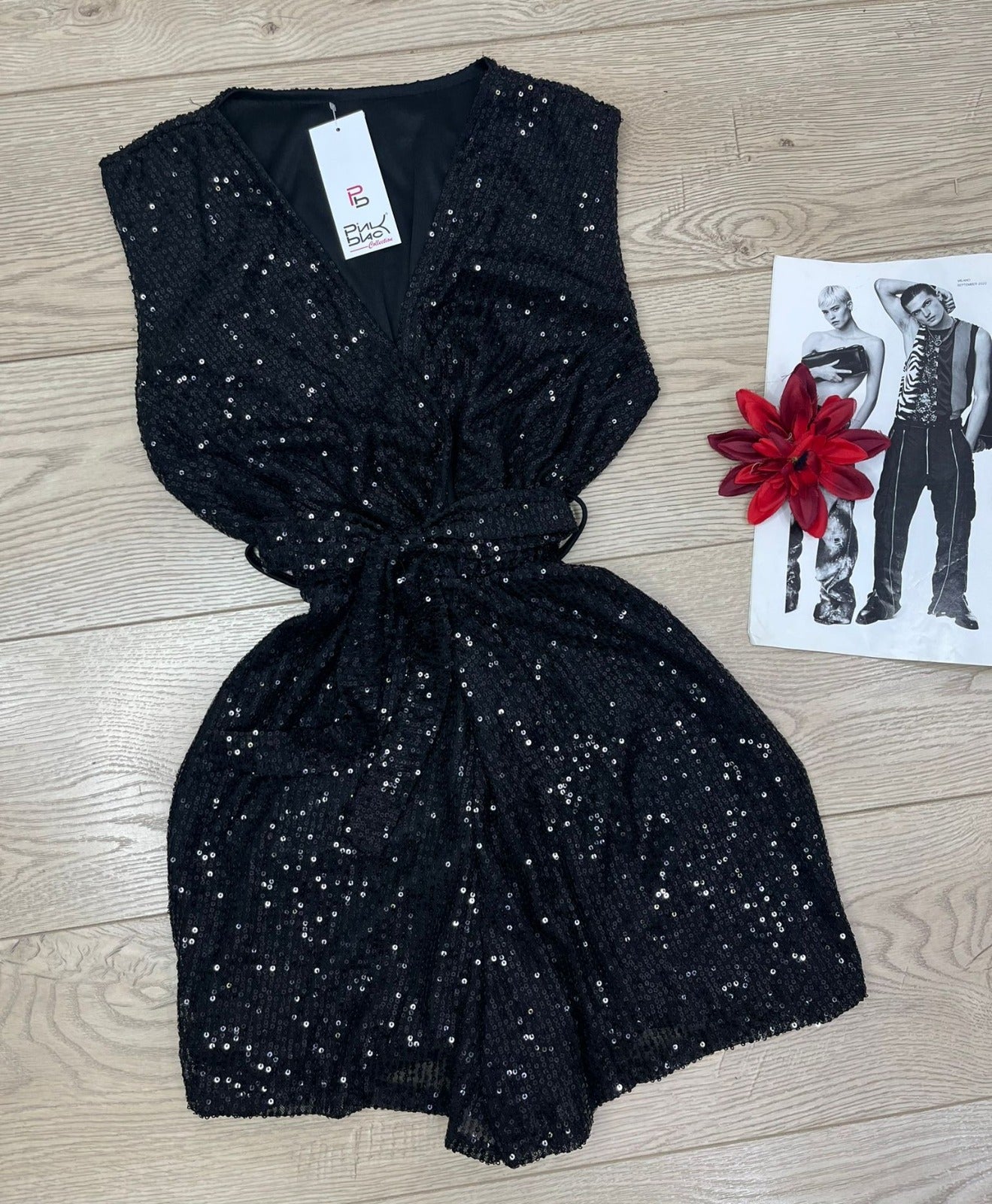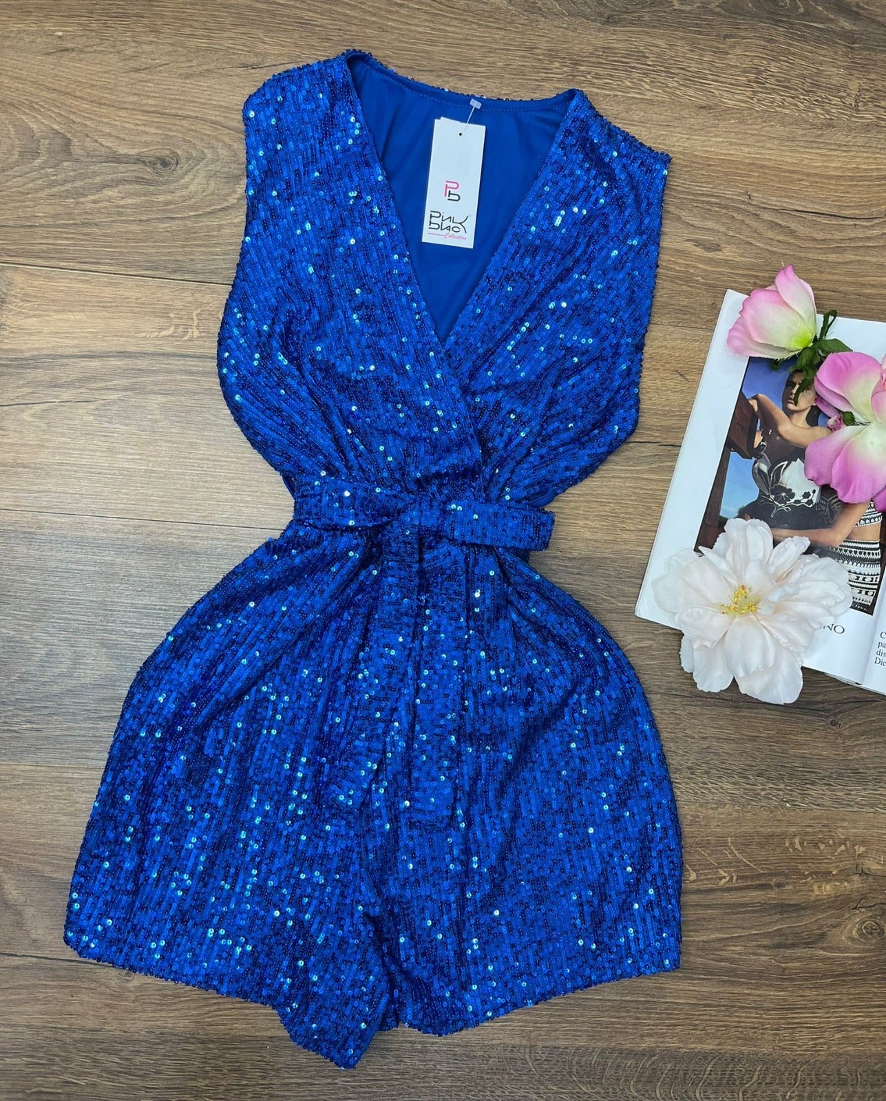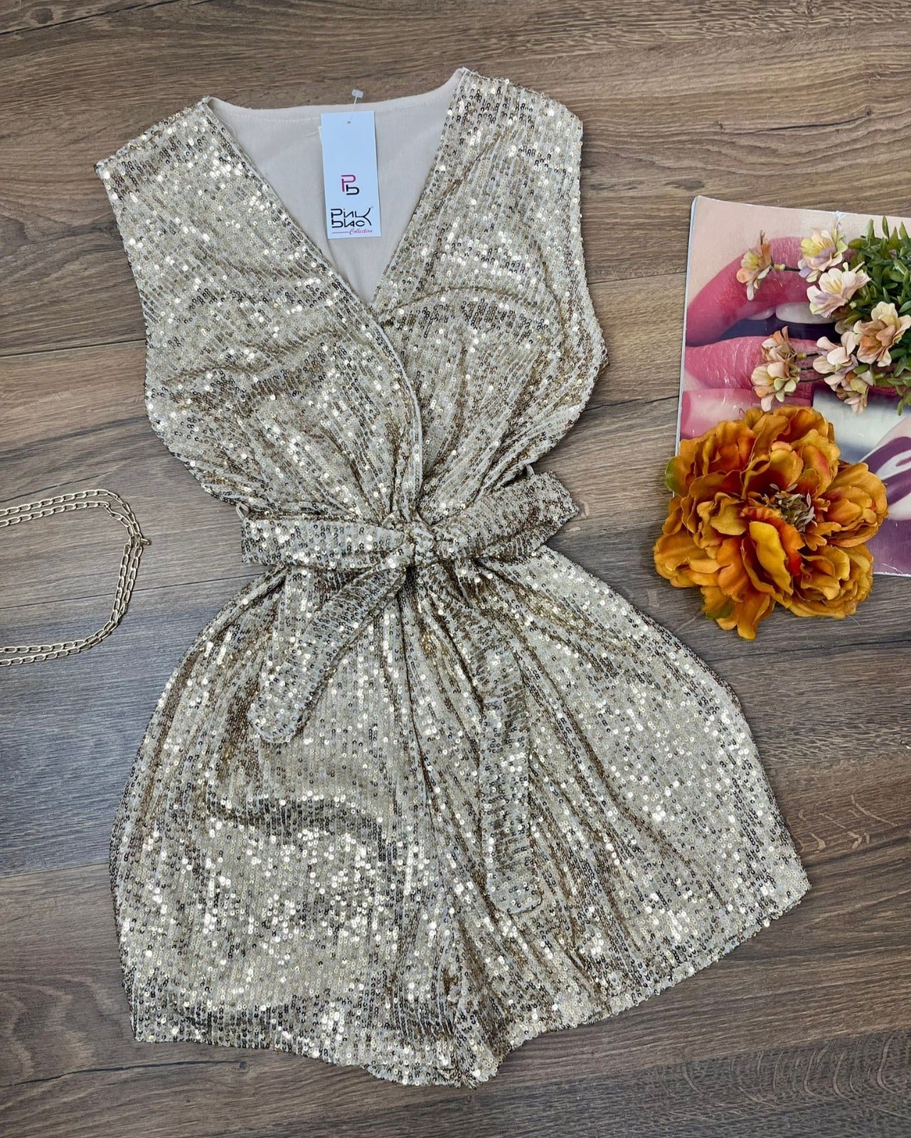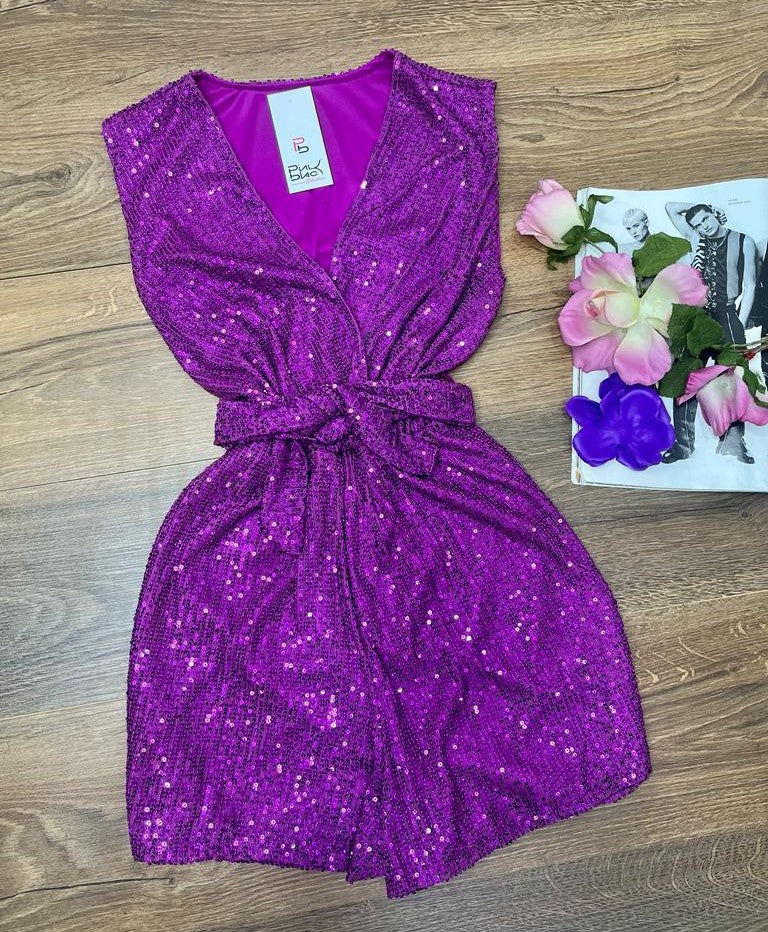 Tutina lavorata su maglia elasticizzata con paillettes, elastico in vita e cinturino inclusa. Fabbricato all'estero.