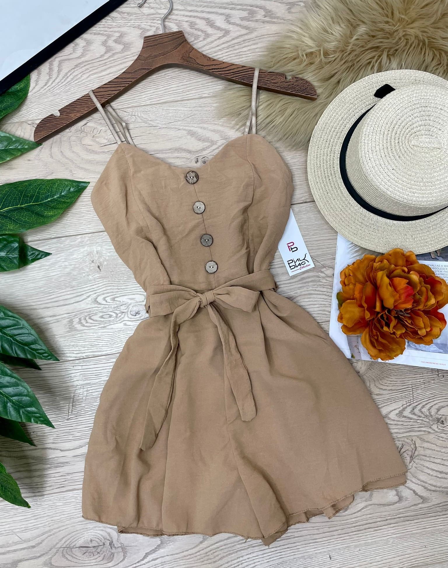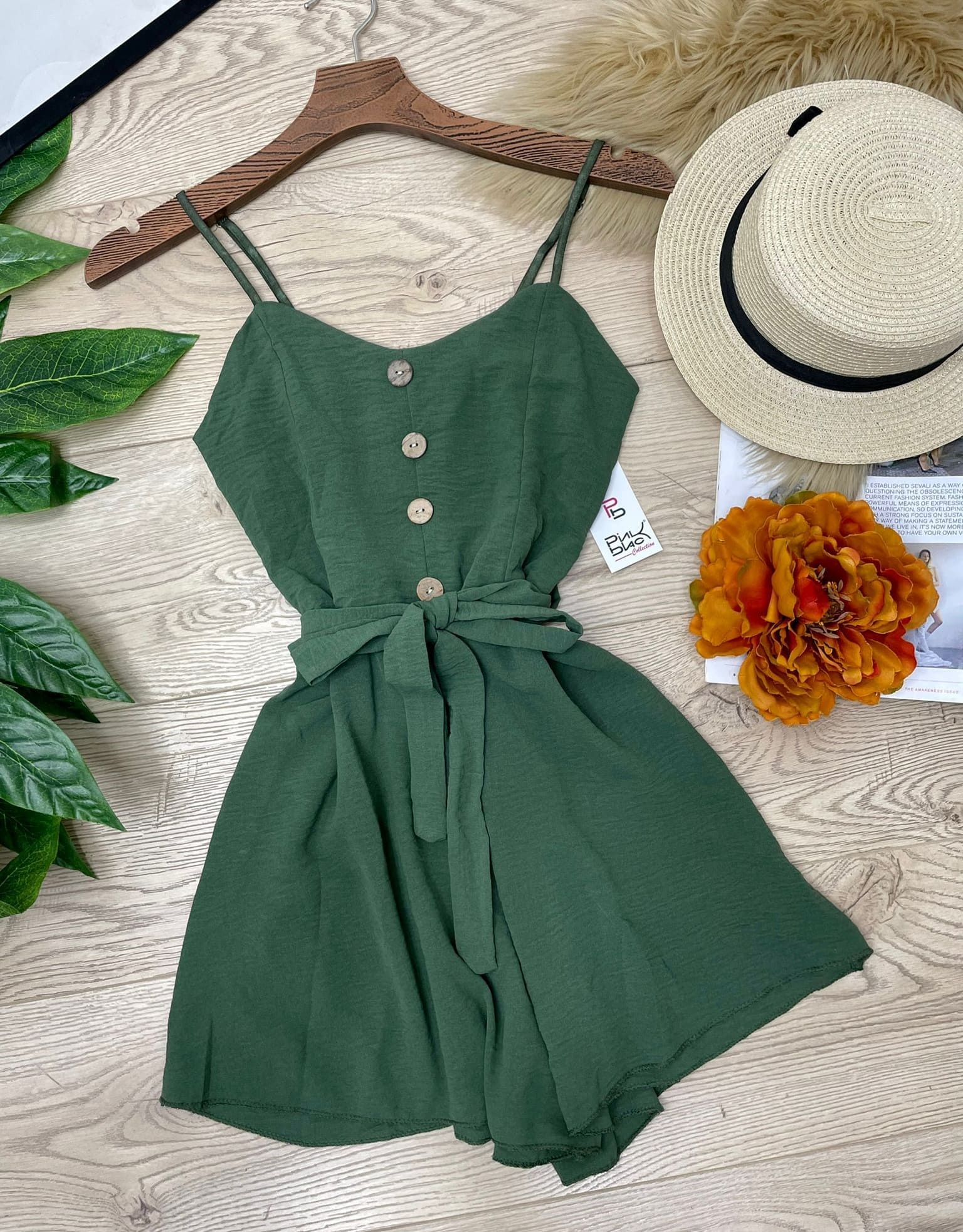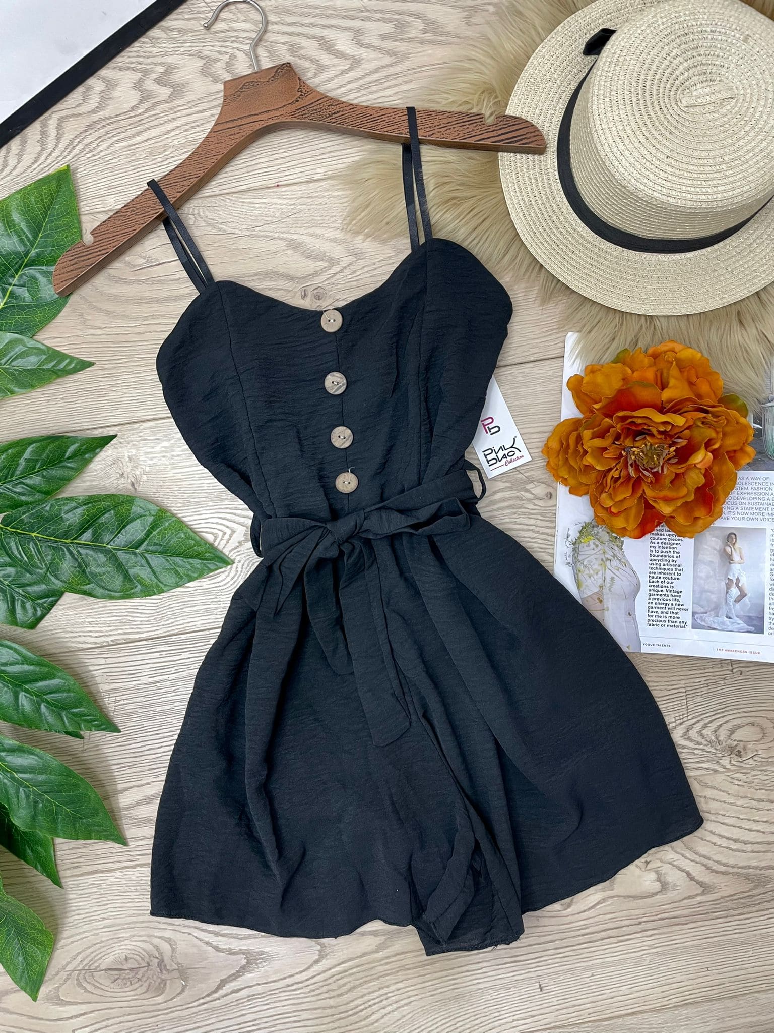 Tutina in leggero tessuto strutturato con bottoni, spalline regoalbili, fascia elastica sul retro e cintura inclusa. Fabbricato in Italia.