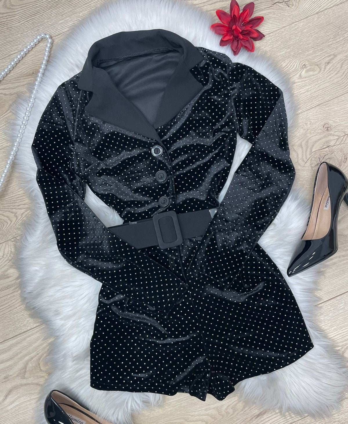 Tutina in ciniglia con applicazione di borchiette, bottoni e cintura inclusa. Fabbricato in Italia.