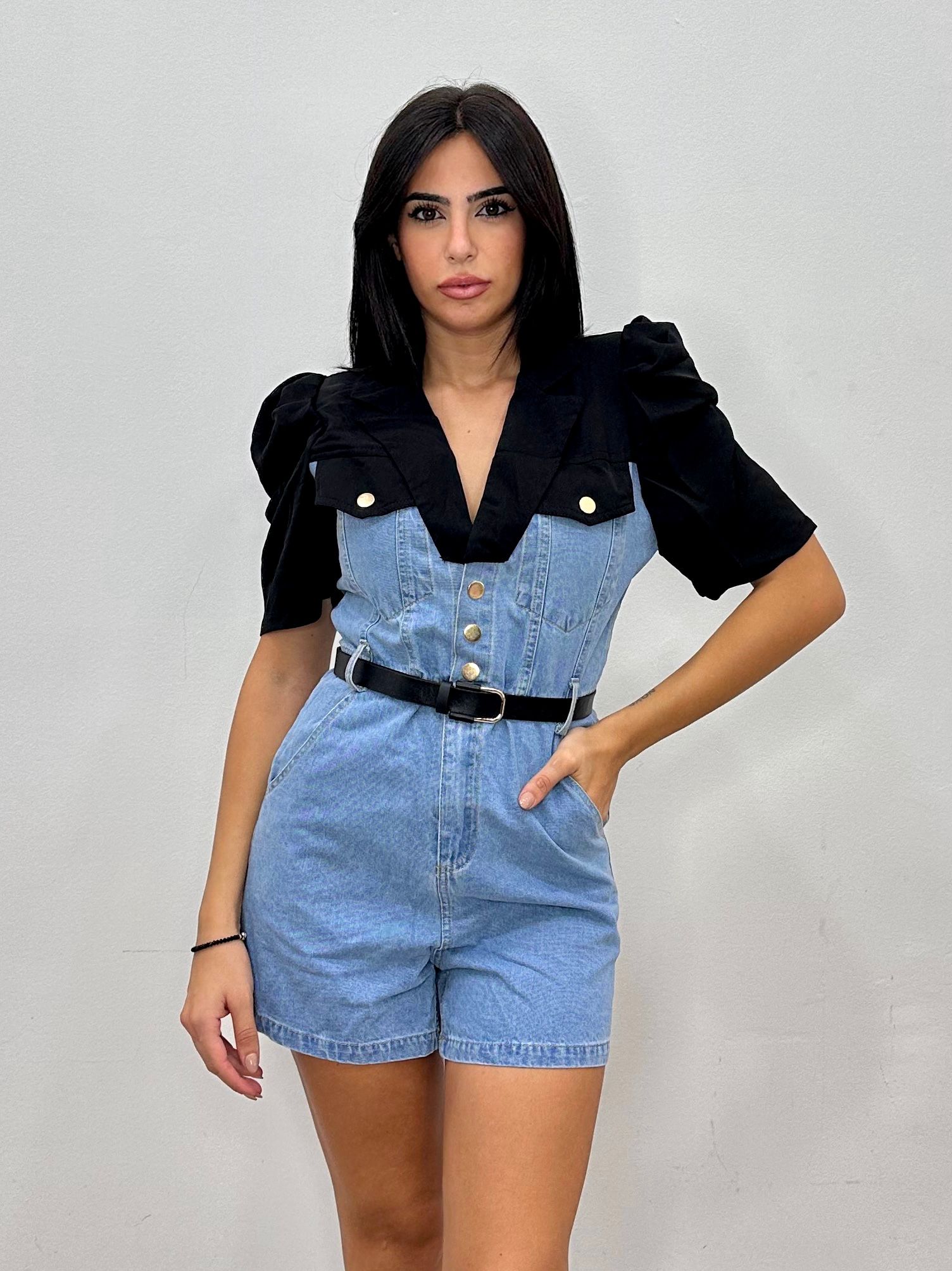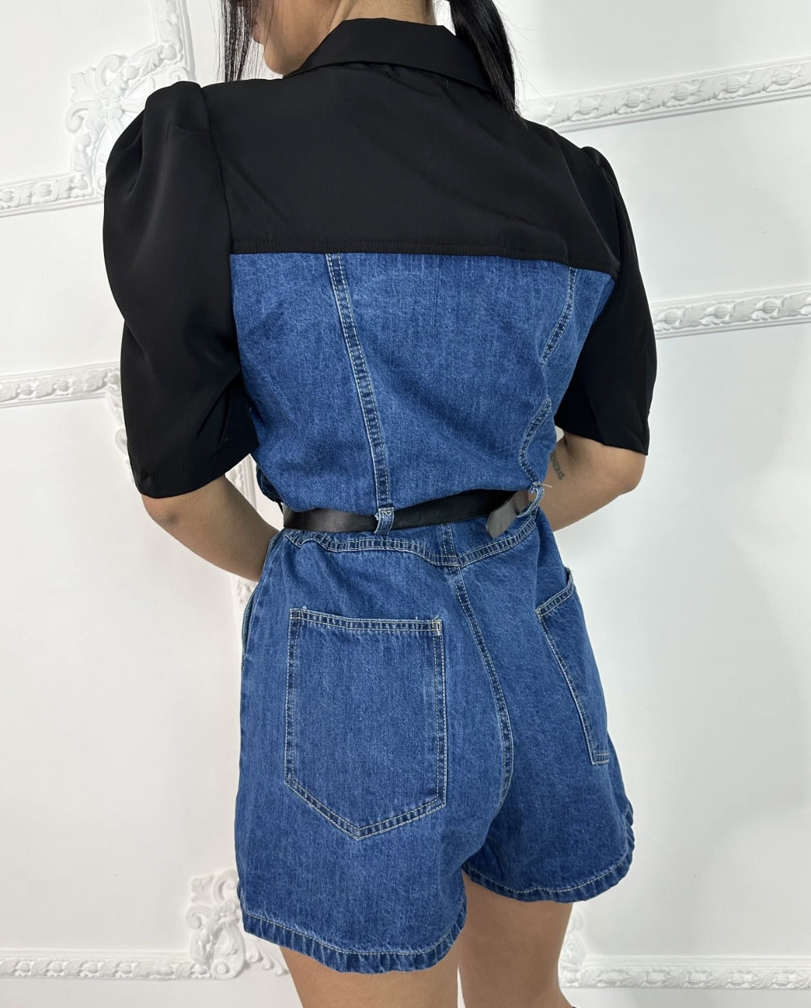 Tutina in jeans con effetto camicia, bottoni, tasche e cintura inclusa. Fabbricato all'estero.