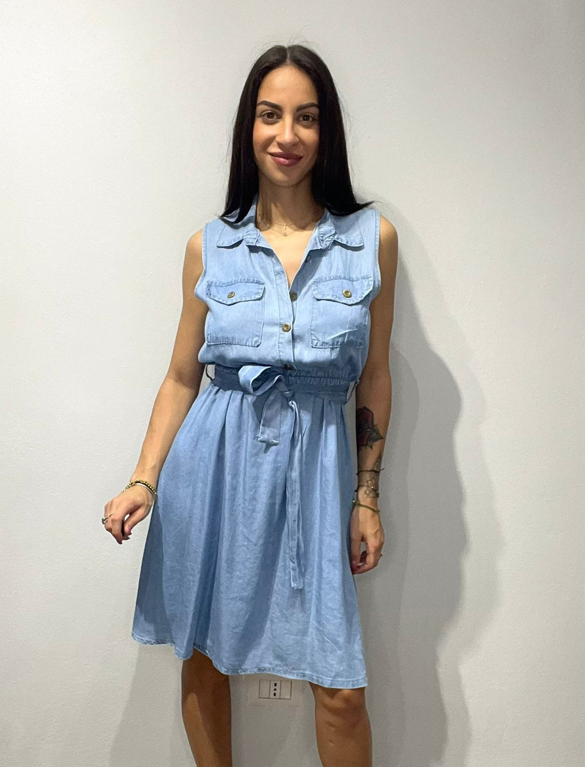Abito modello camicione in jeans chambray con bottoni centrali ,elastico in vita e cintura inclusa. Fabbricato in Italia.