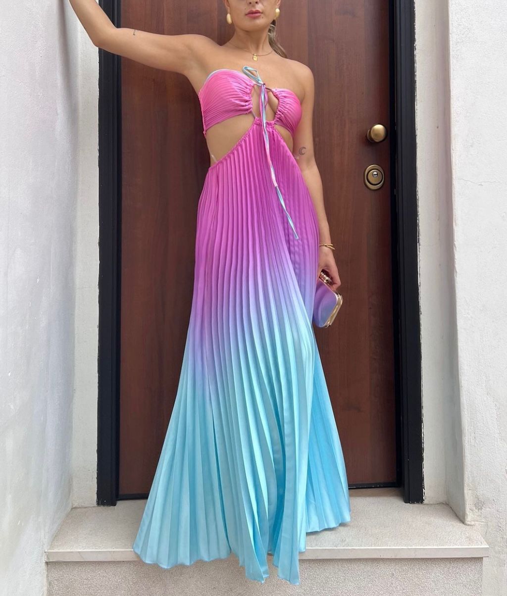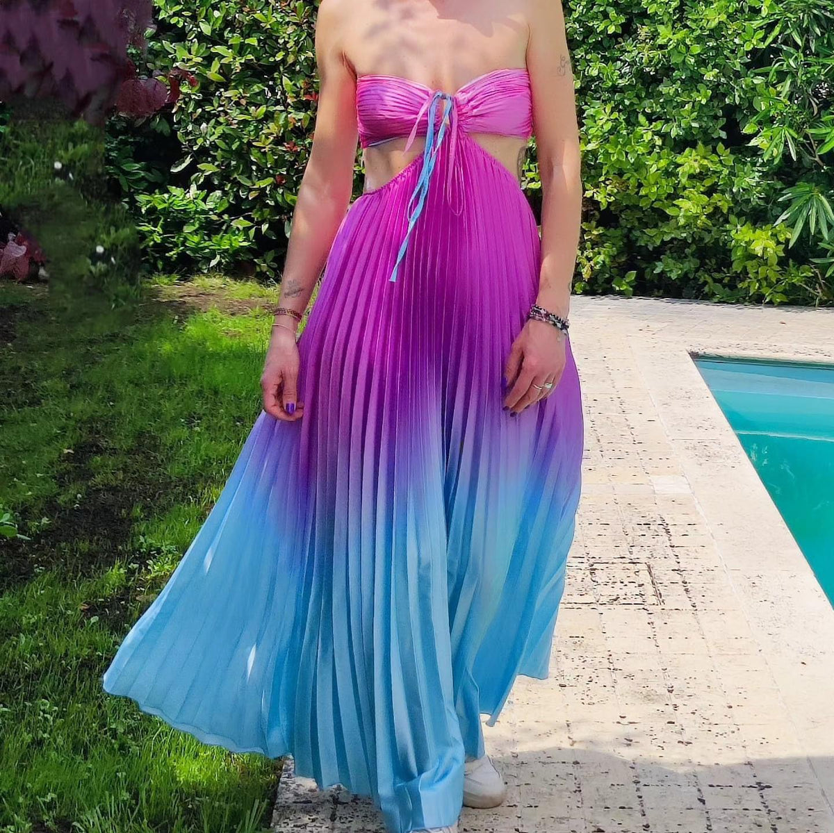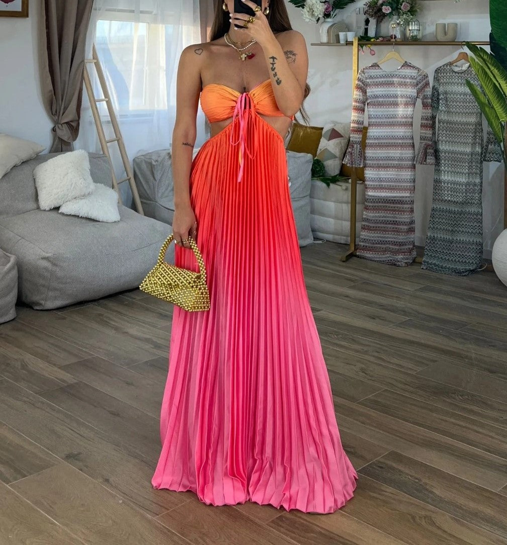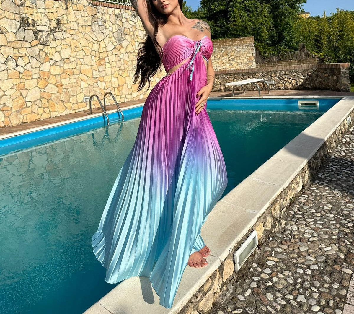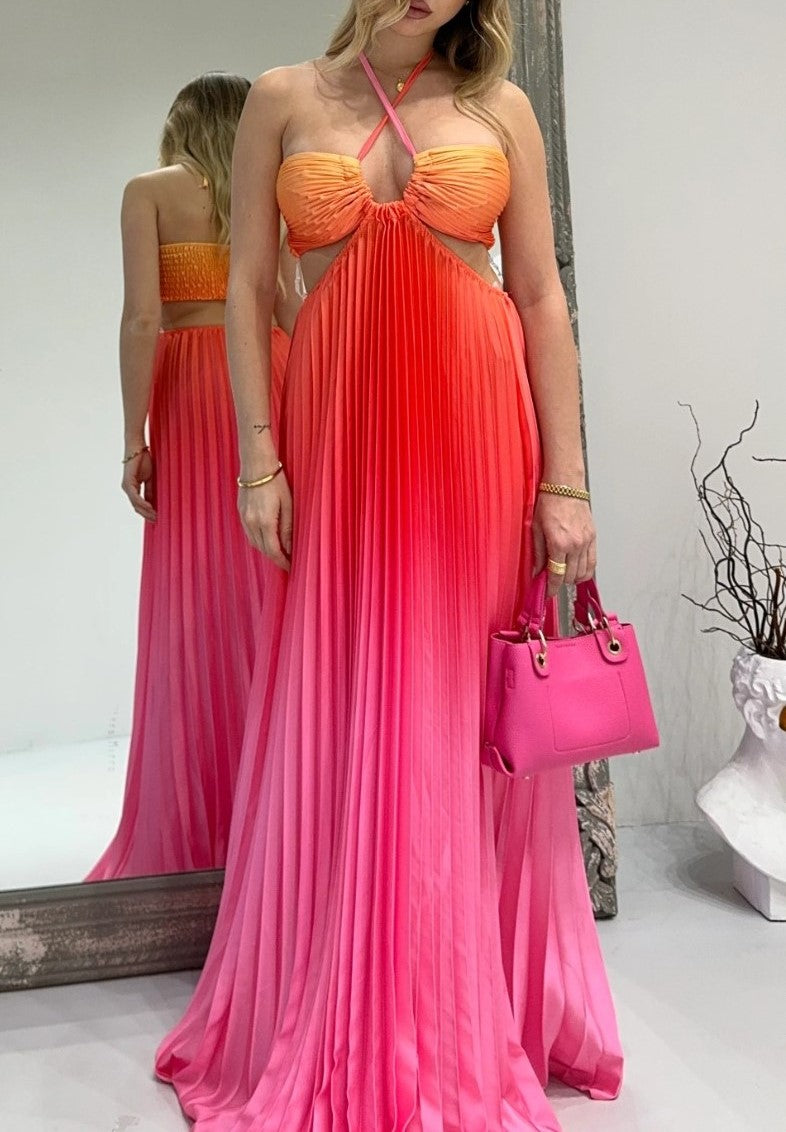 Abito a fascia morbido , effetto raso con gonna plissettata e apertura sui fianchi elastico sul retro e allacciatura centrale. . Fabbricato in Italia.