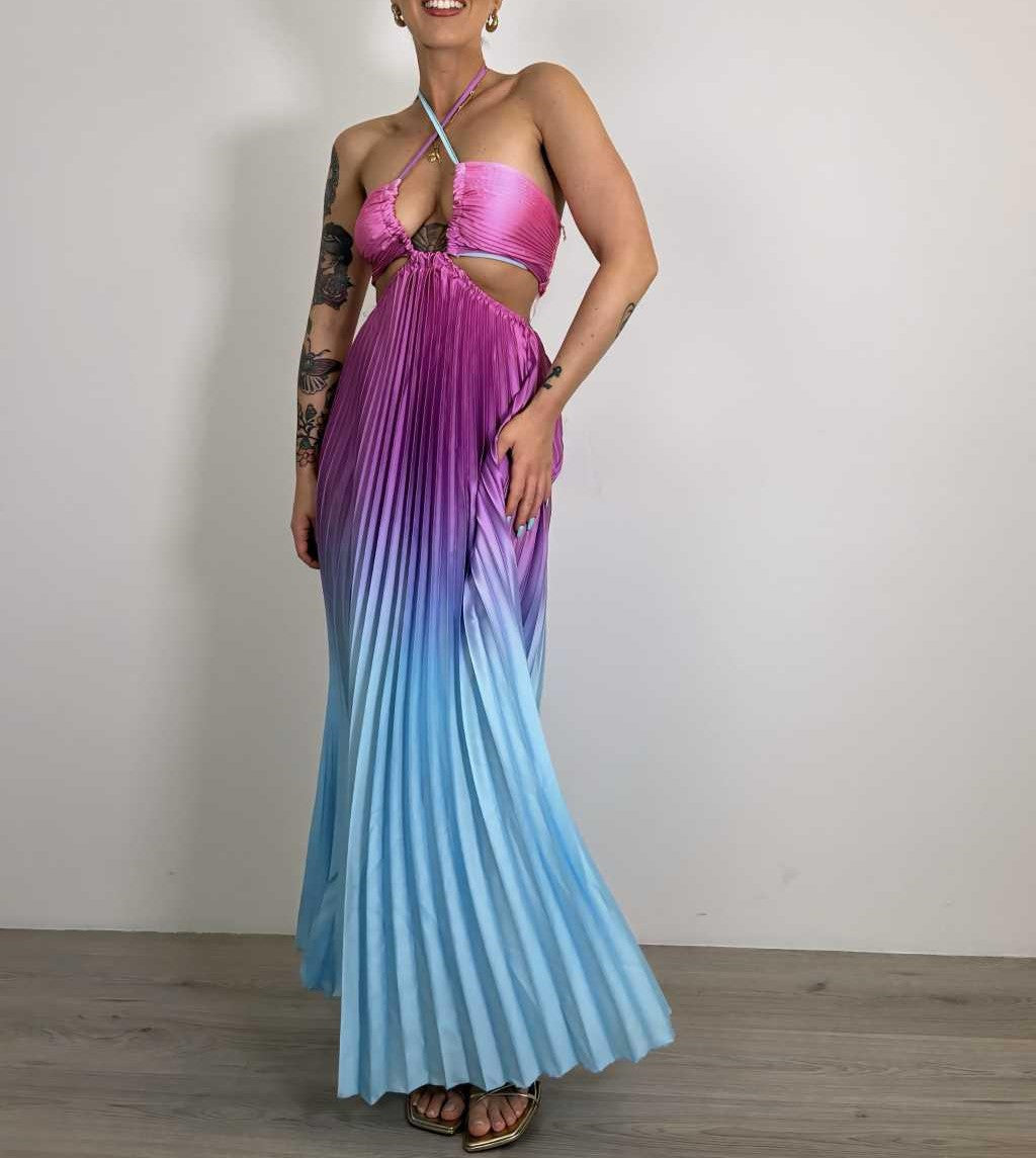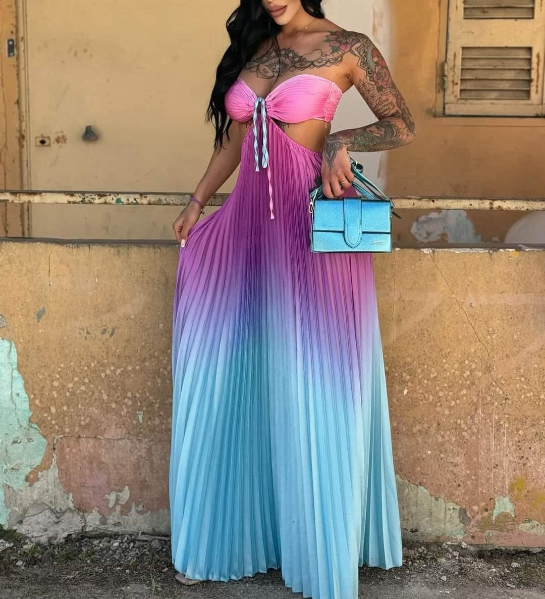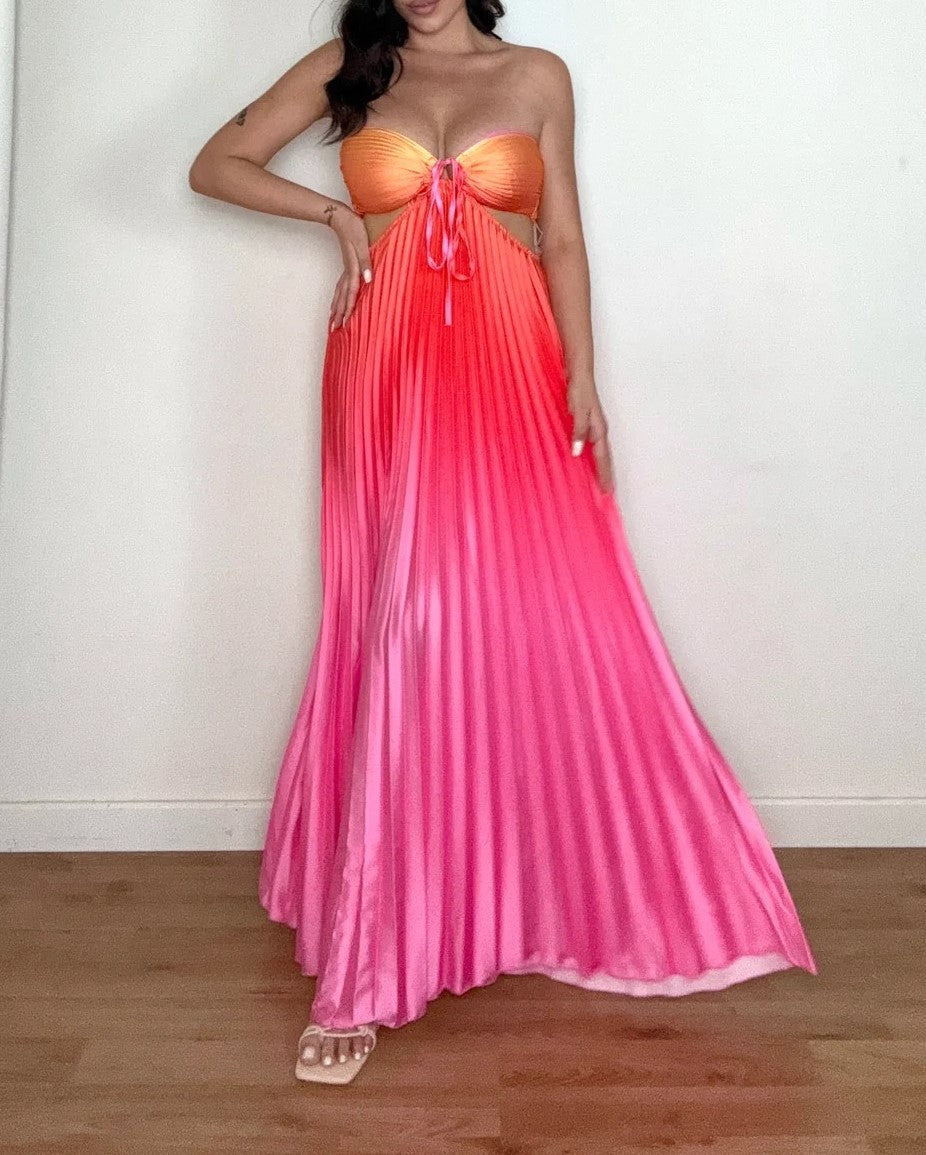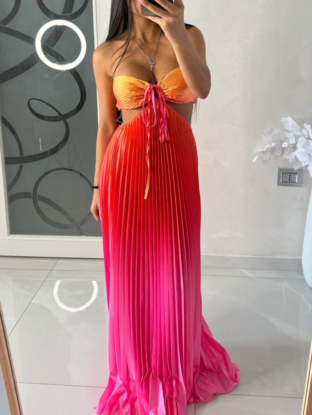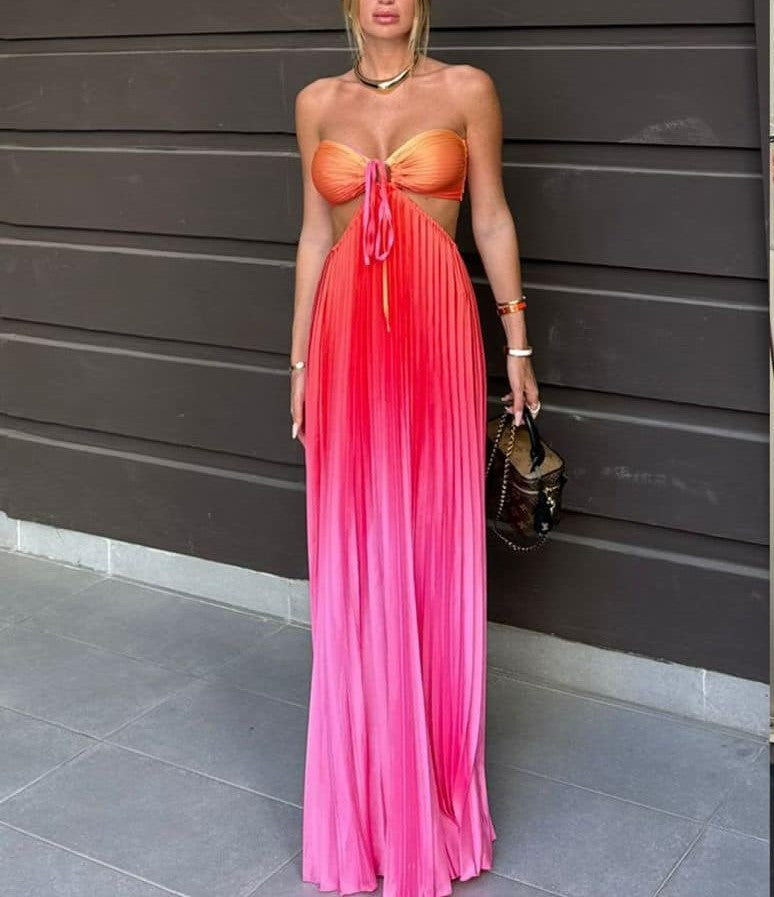 Abito a fascia morbido , effetto raso con gonna plissettata e apertura sui fianchi elastico sul retro e allacciatura centrale. . Fabbricato in Italia.