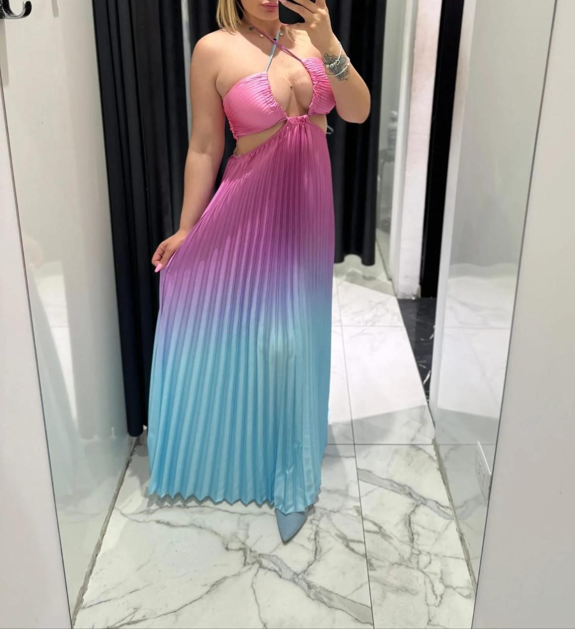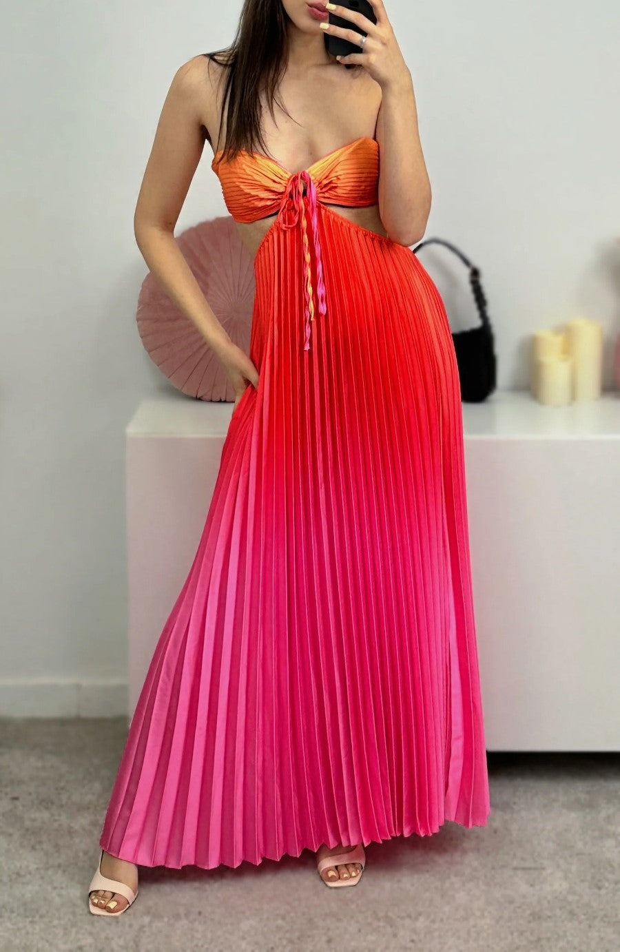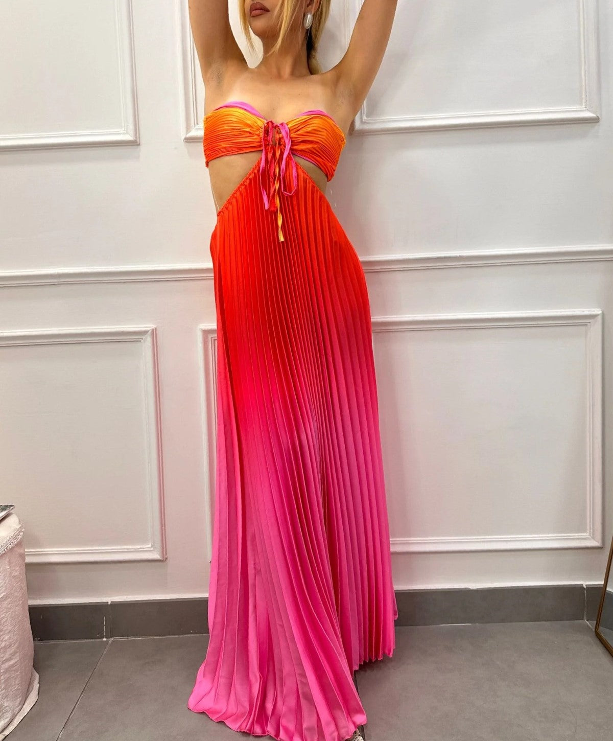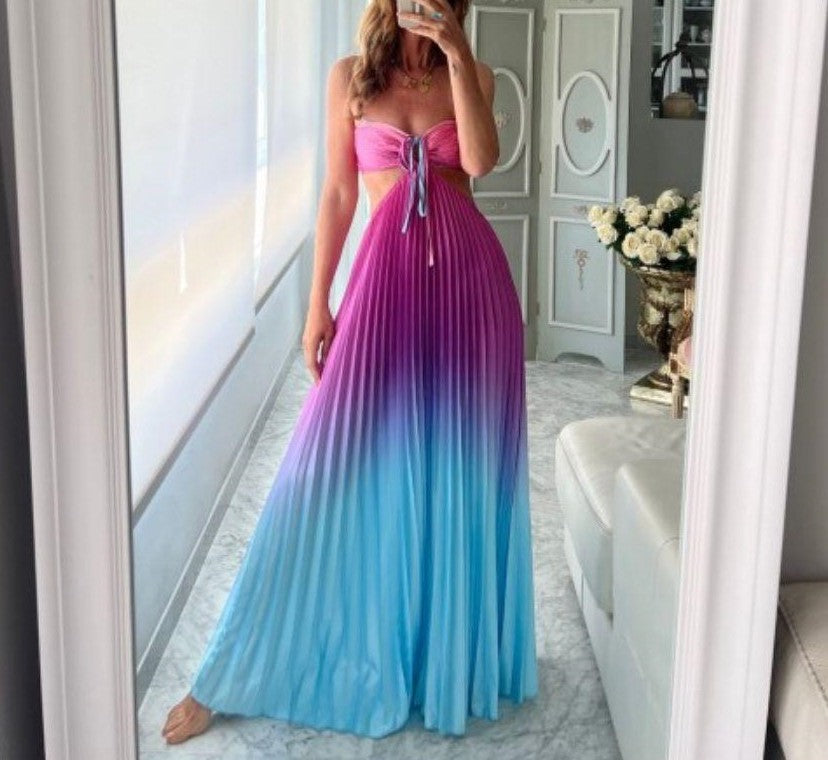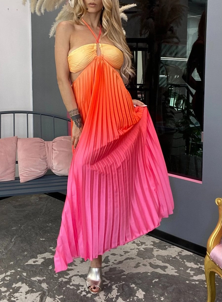 Abito a fascia morbido , effetto raso con gonna plissettata e apertura sui fianchi elastico sul retro e allacciatura centrale. . Fabbricato in Italia.