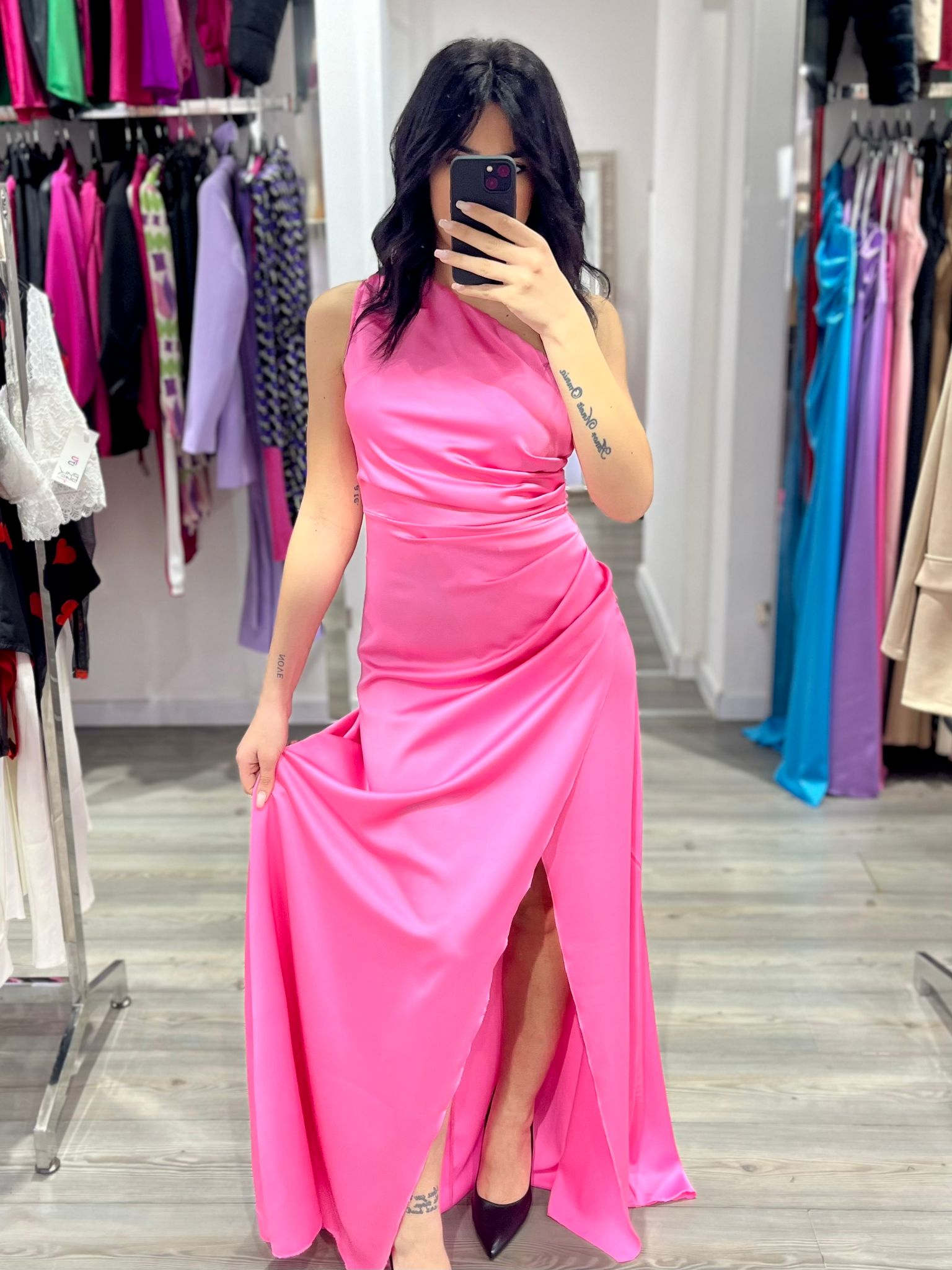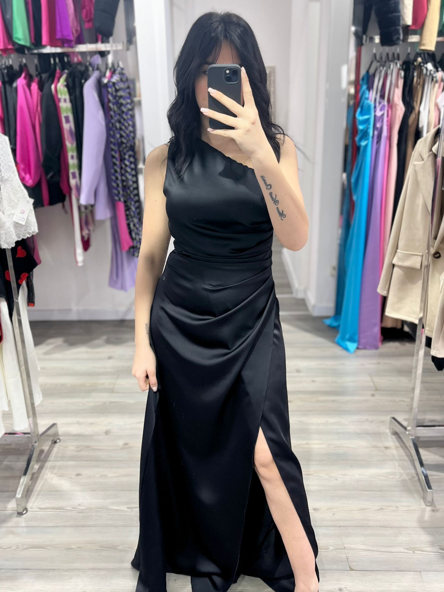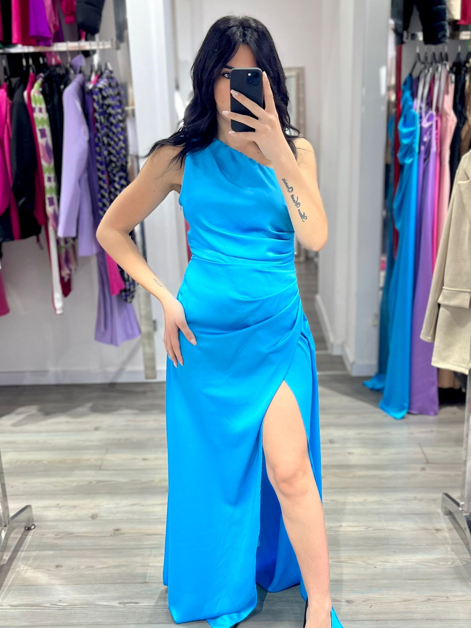Abito lungo effetto raso monospalla, con coppe preformate, drappeggio, spacco e chiusura con cerniera. Fabbricato in Italia.