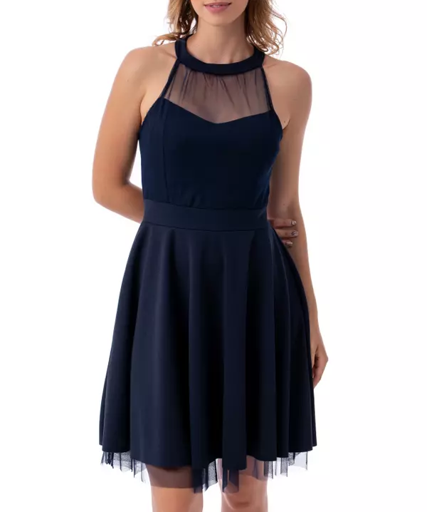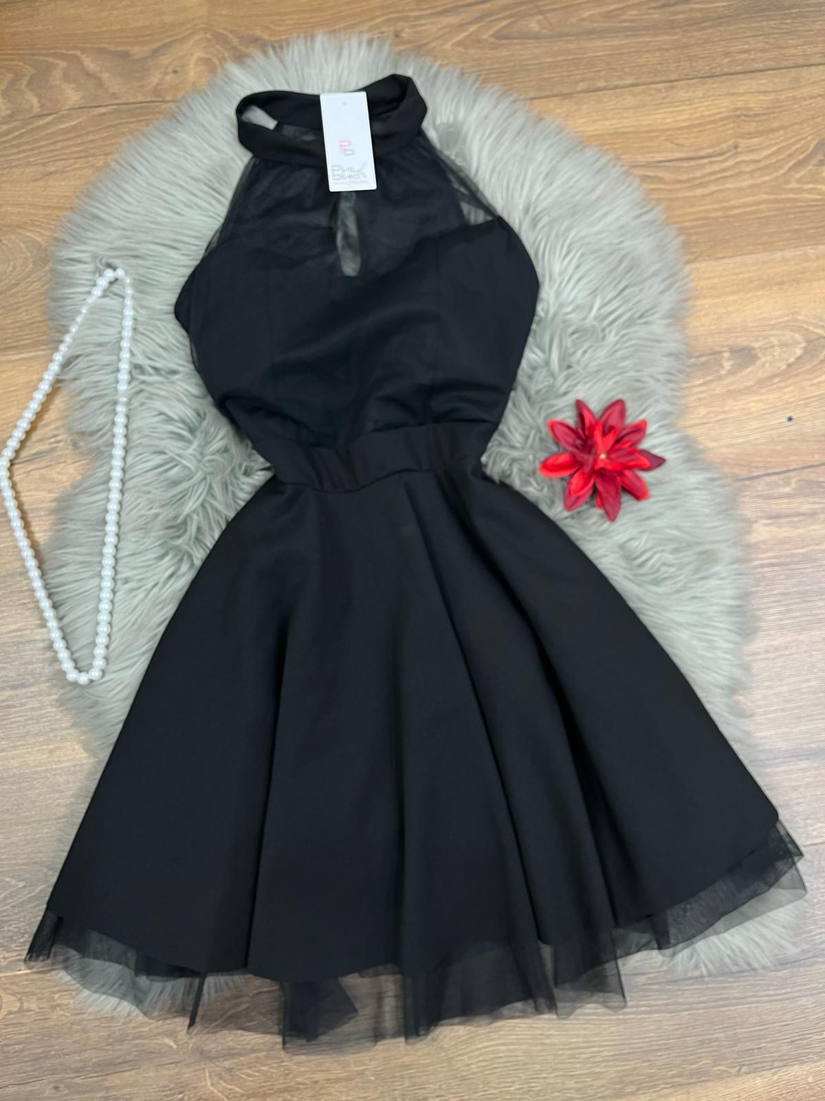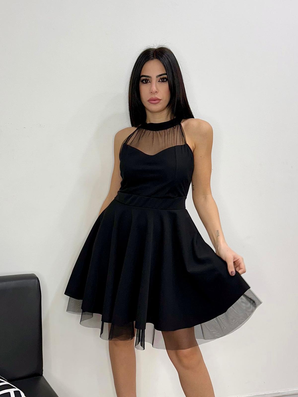 Abito con velo di tulle, scollo all'americana, coppe preformate e cerniera. Fabbricato in Italia.