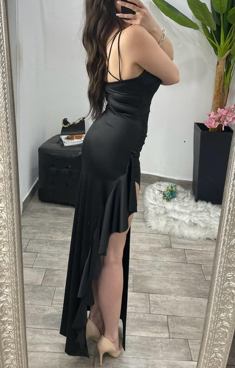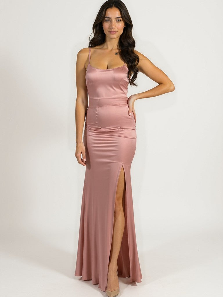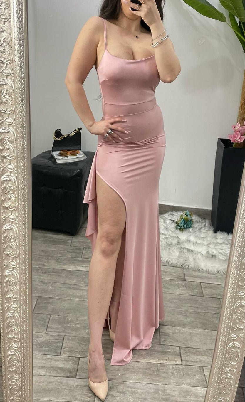 Abito lungo effetto raso con coppe preformate ed alto spacco con voilant laterali
