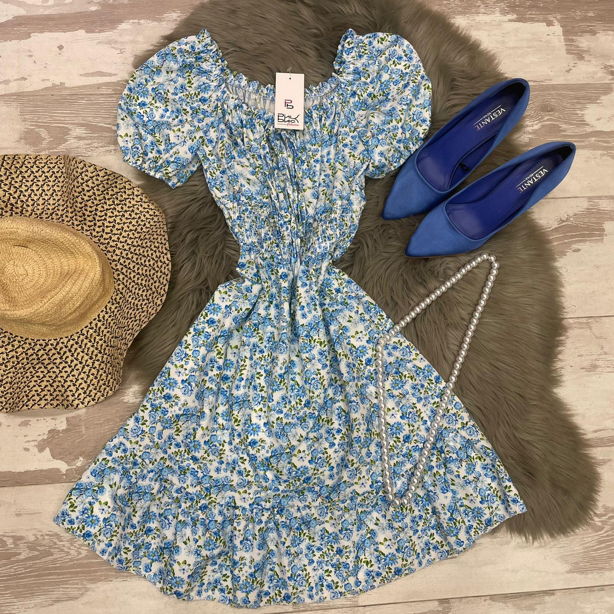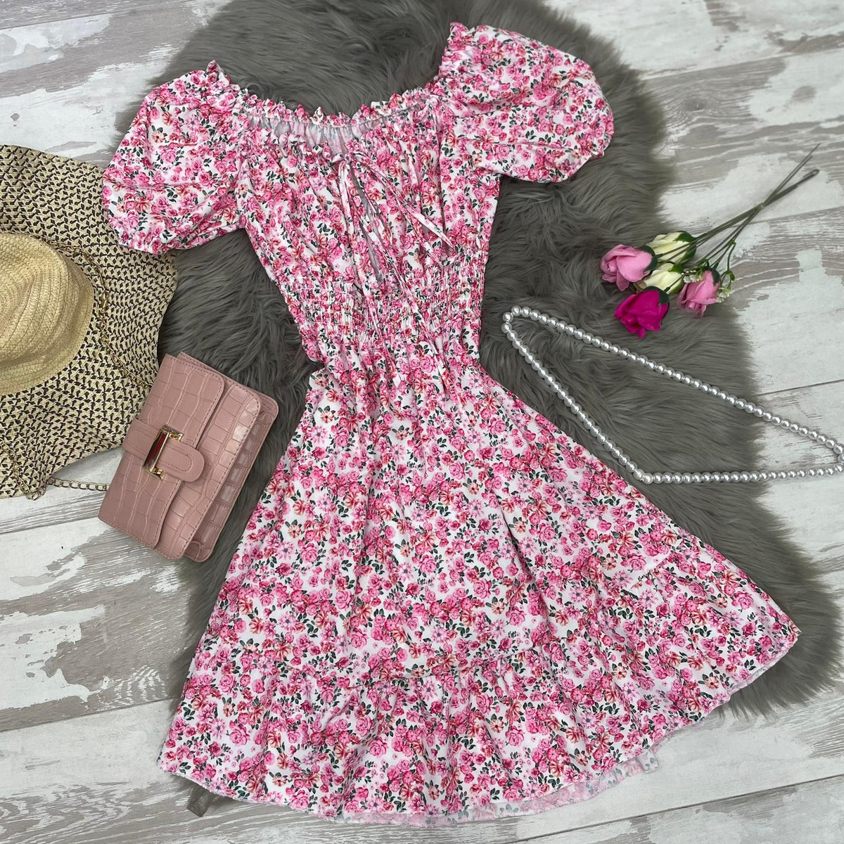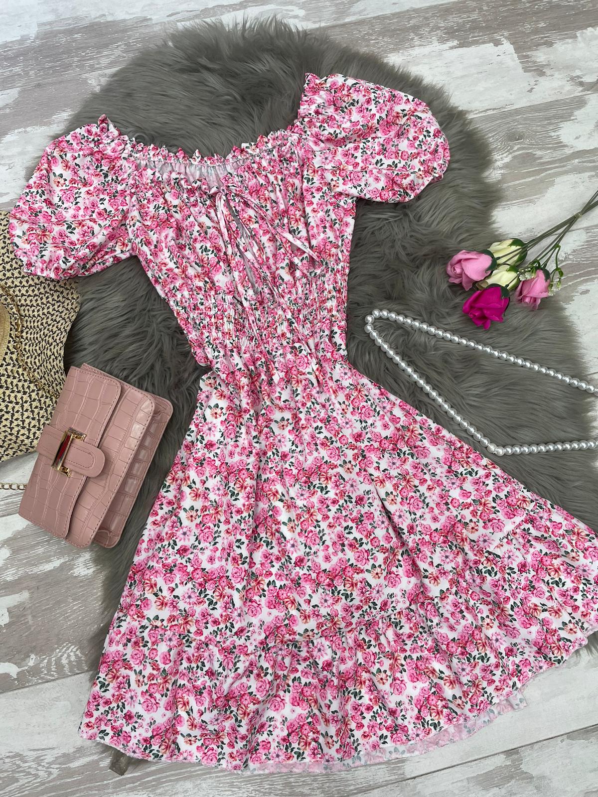 Abito in chiffon con fantasia floreale, ed elastico in vita Fabbricato in Italia.