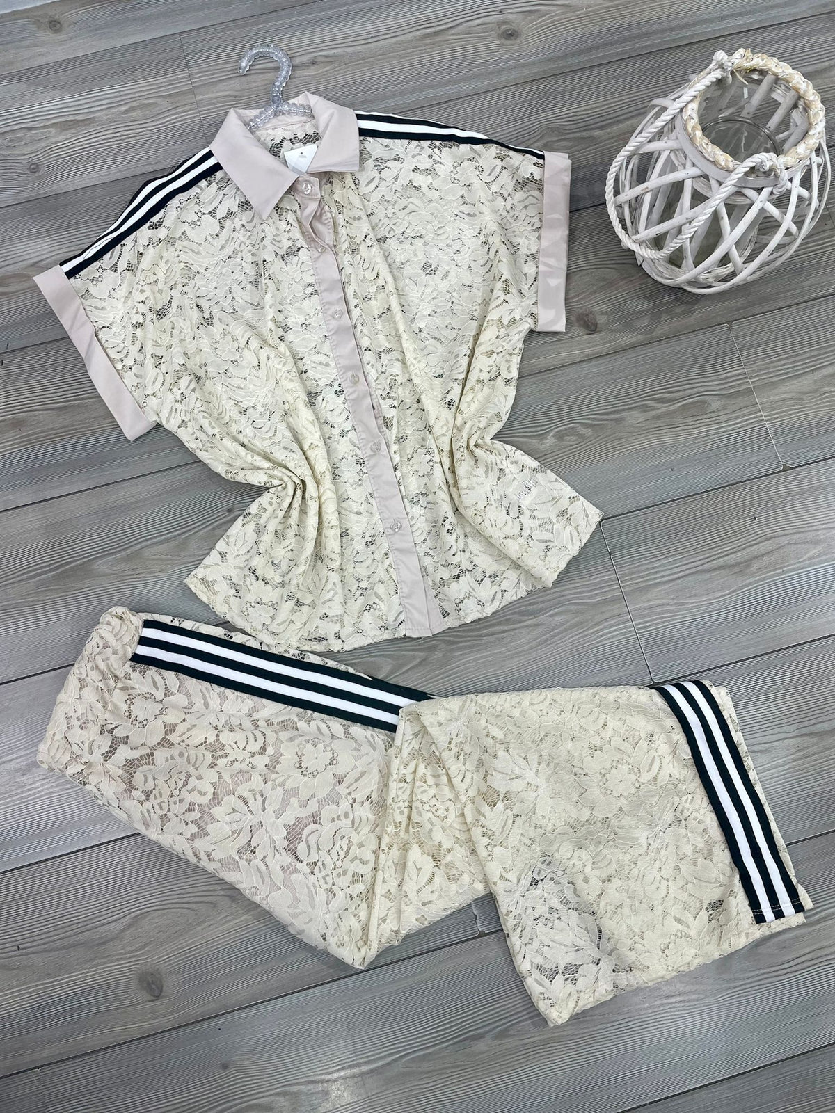 Completo in pizzo con colletto in tessuto, camicia con bottoni centrali e pantalone largo con elastico in vita