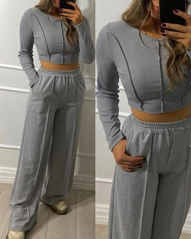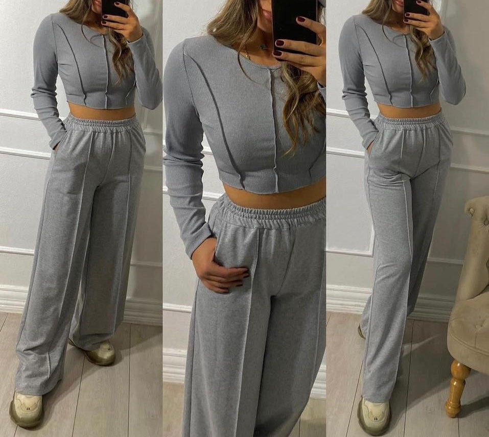 Completo con maglia a costine e pantalone con fascia elastica in vita e tasche. Fabbricato in Italia.
