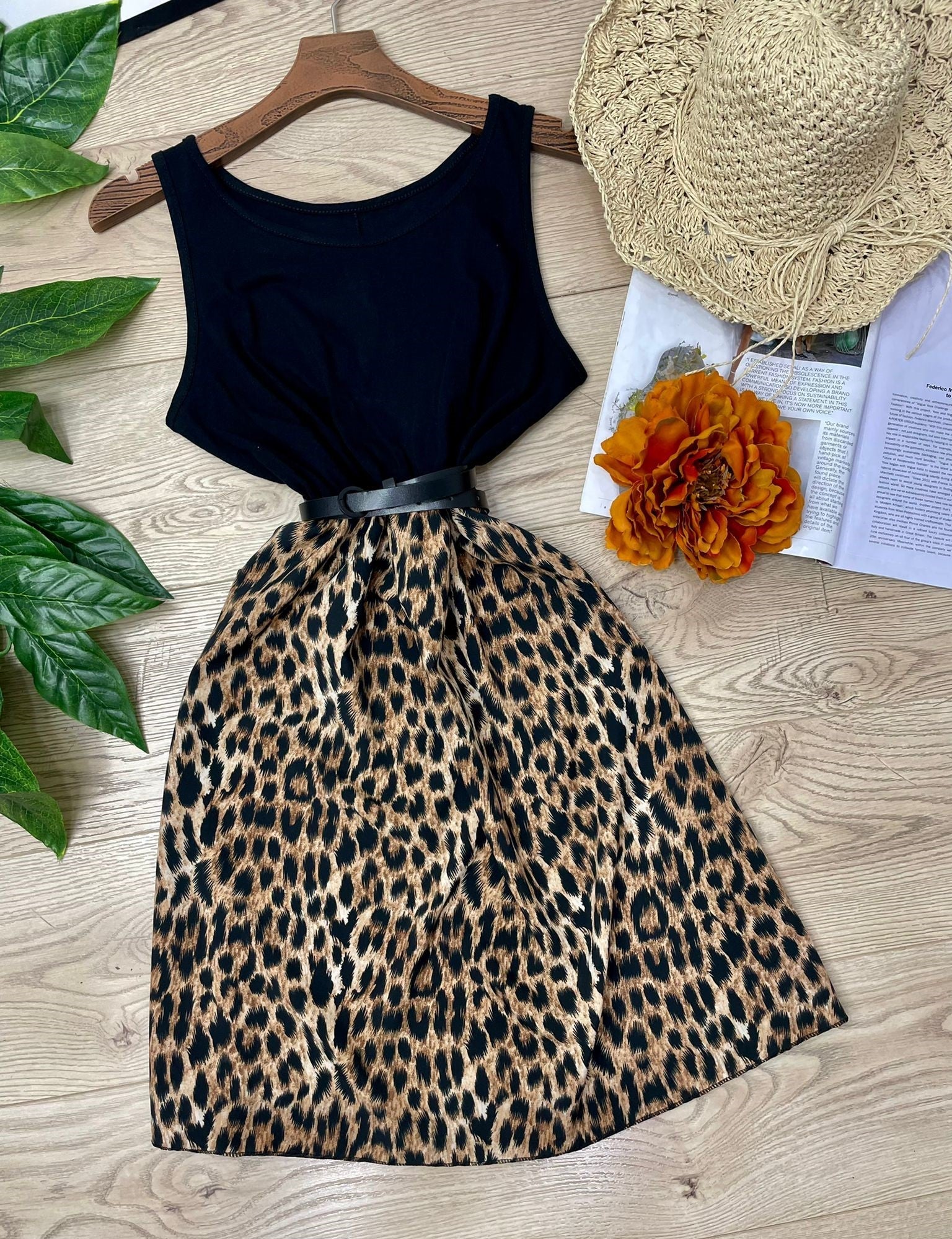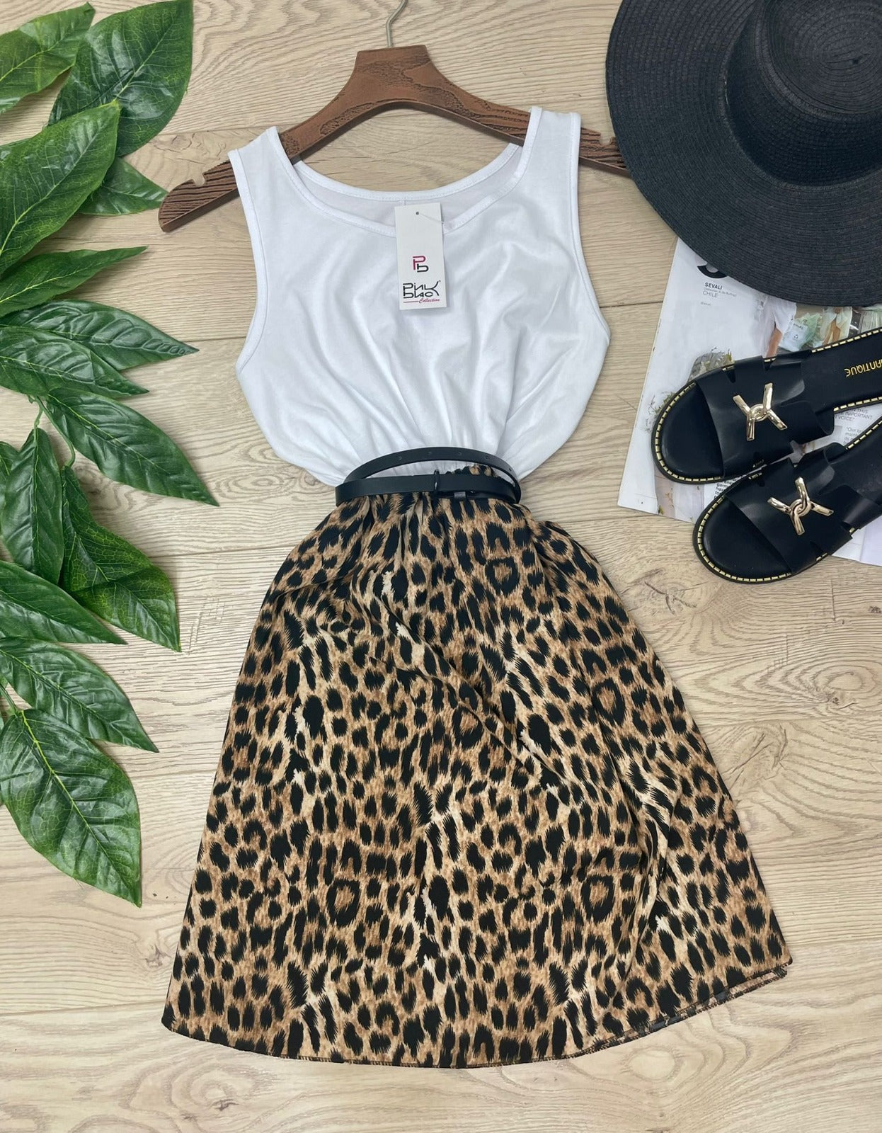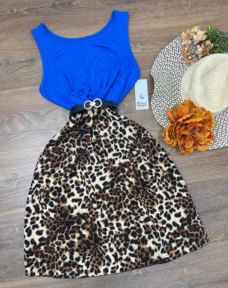 Abito in leggero tessuto strutturato con fantasia animalier ed elastico in vita. Fabbricato in Italia. ( Cintura non inclusa).