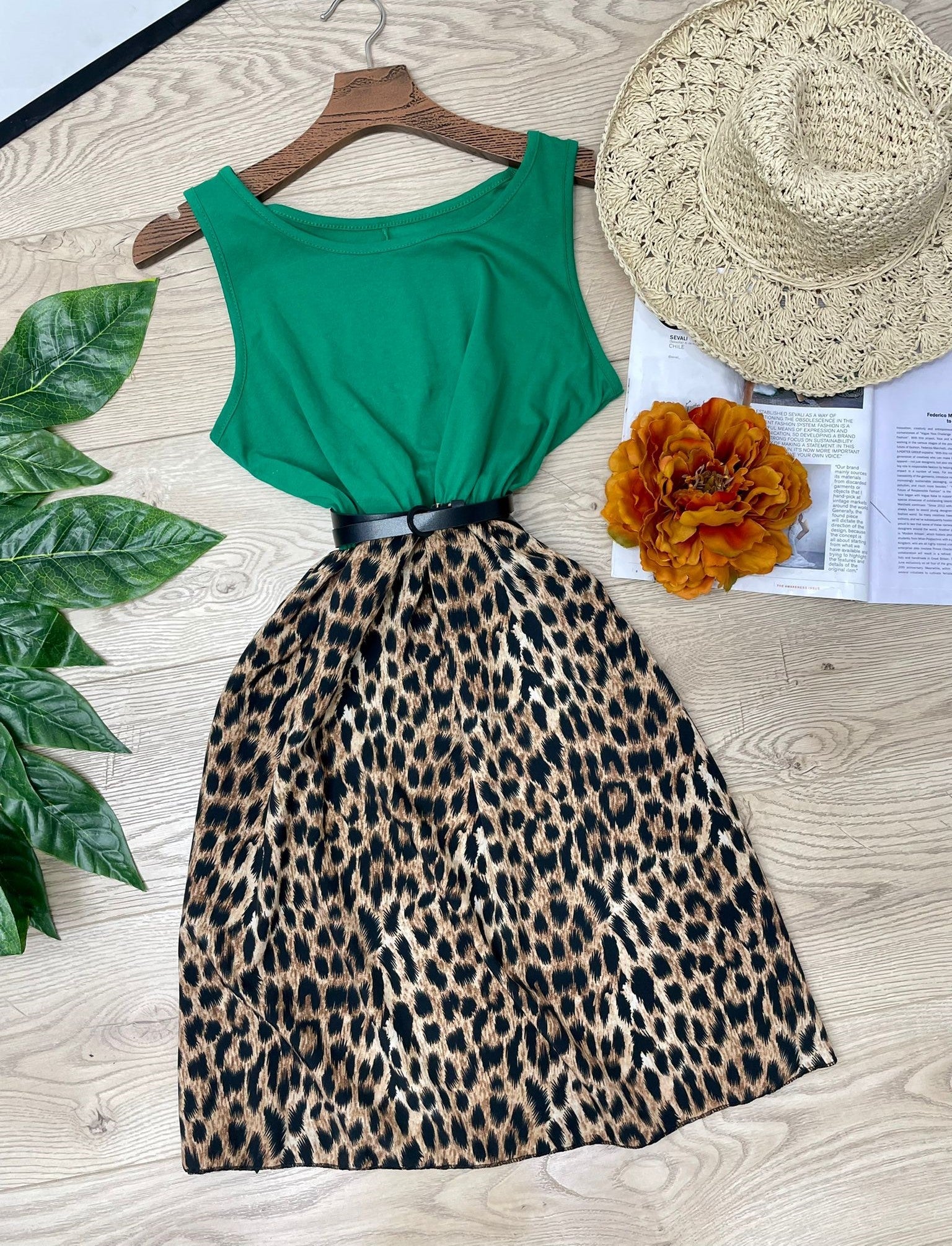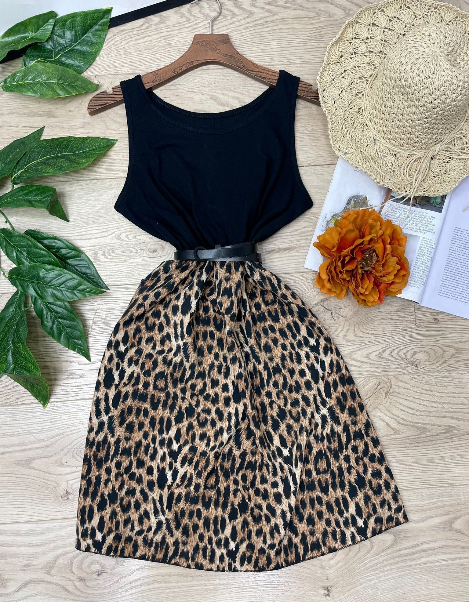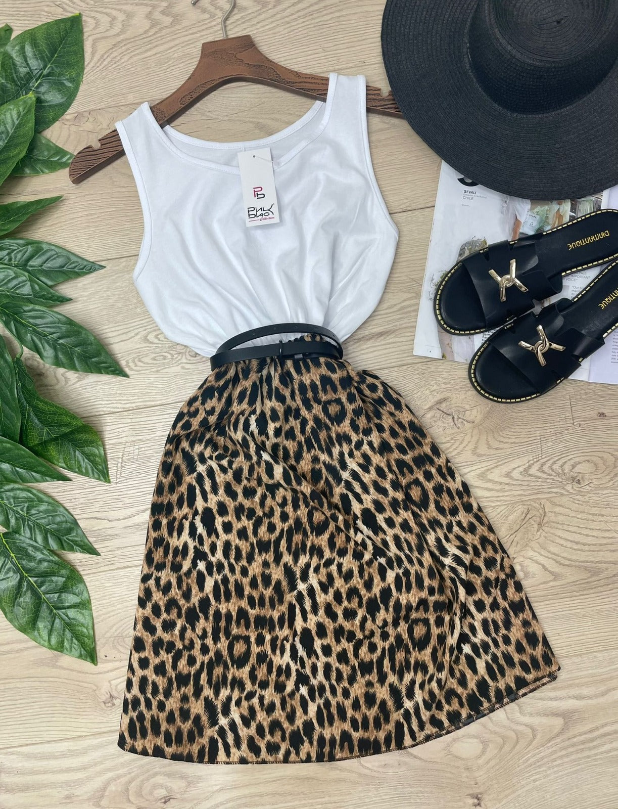 Abito in leggero tessuto strutturato con fantasia animalier ed elastico in vita. Fabbricato in Italia. ( Cintura non inclusa).