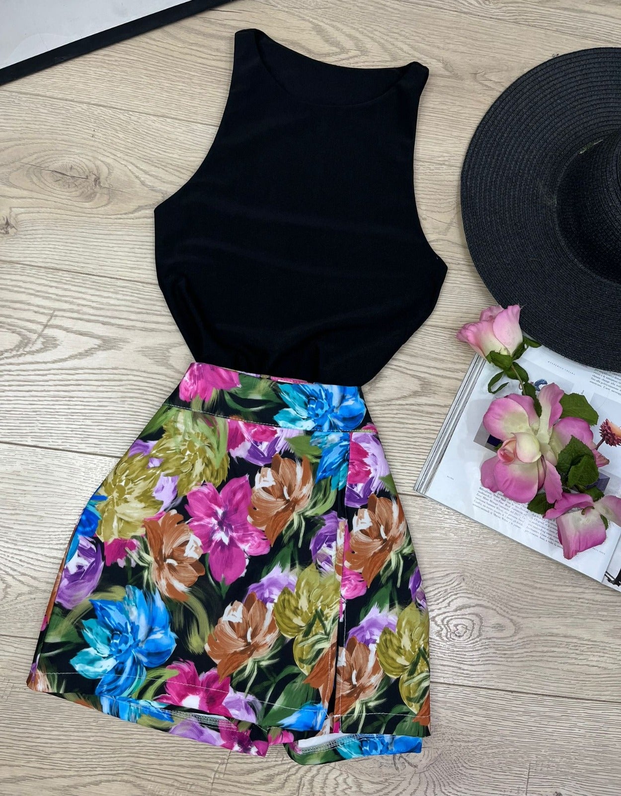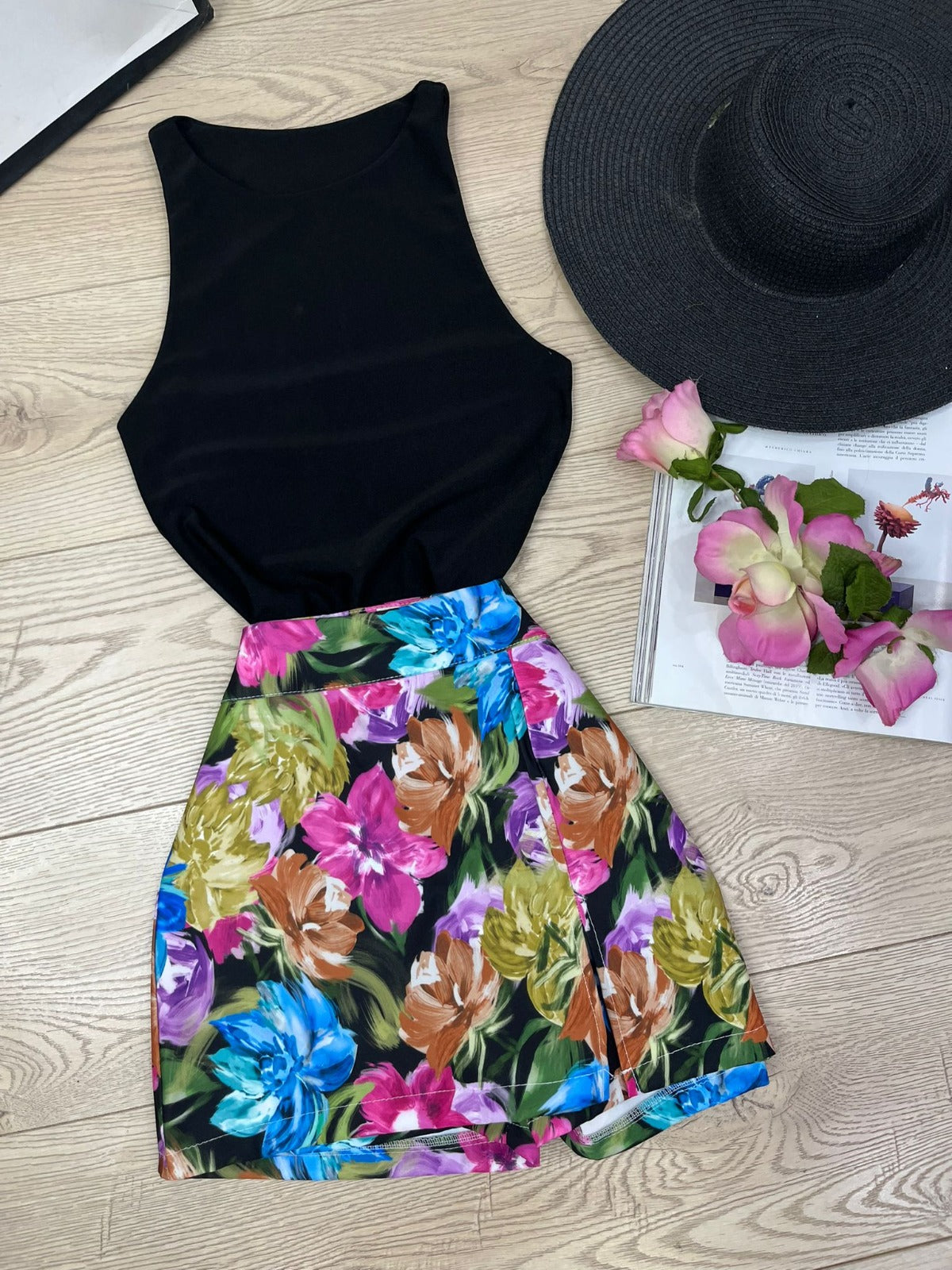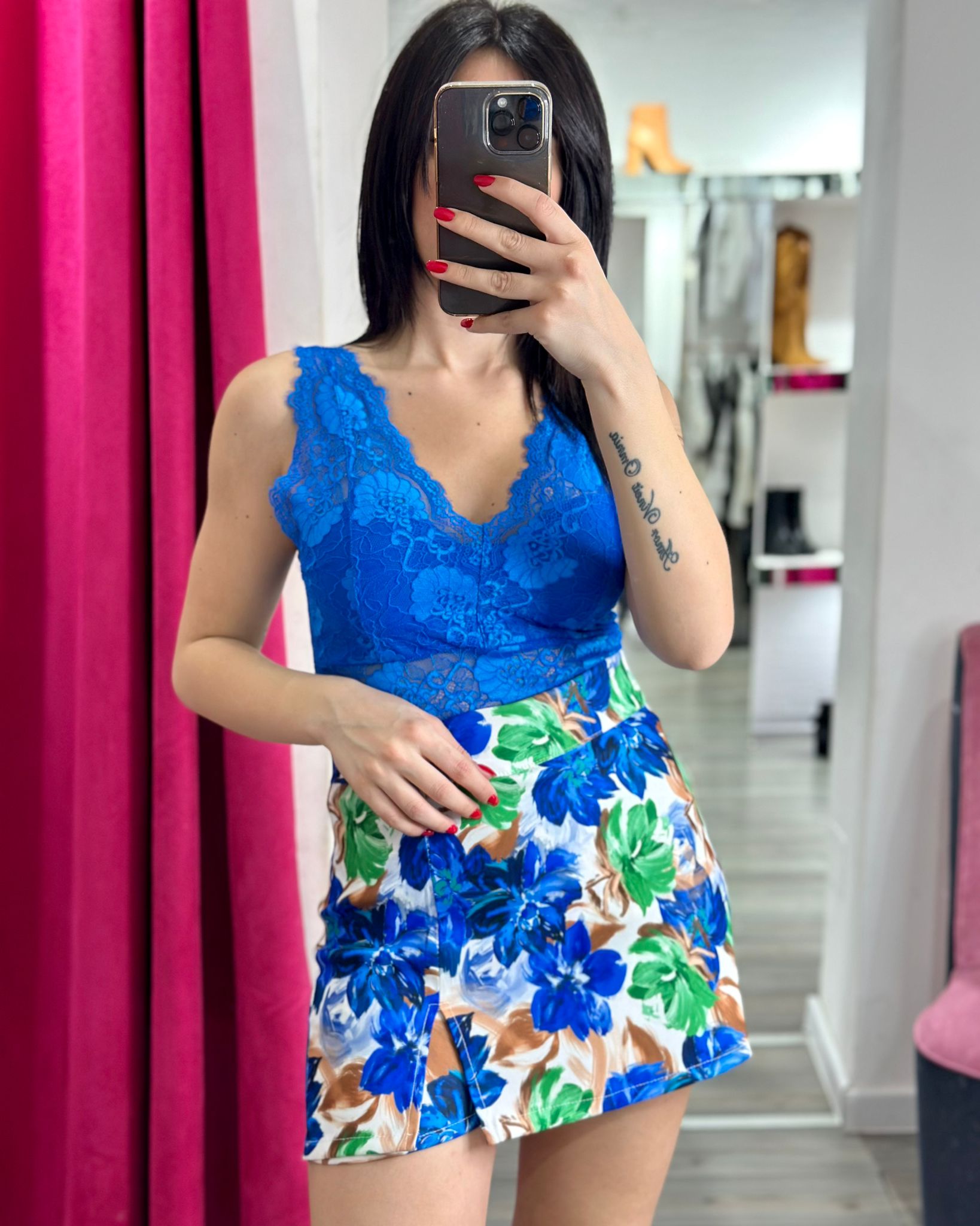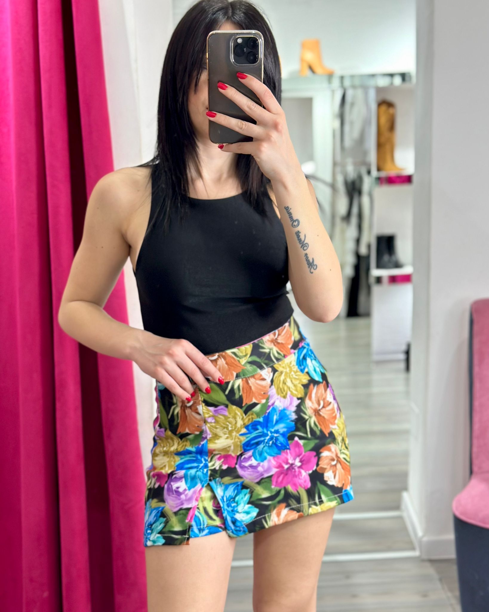 Pantagonna in tessuto strutturato con fantasia floreale, pantaloncino e cerniera sul retro. Fabbricato in Italia.