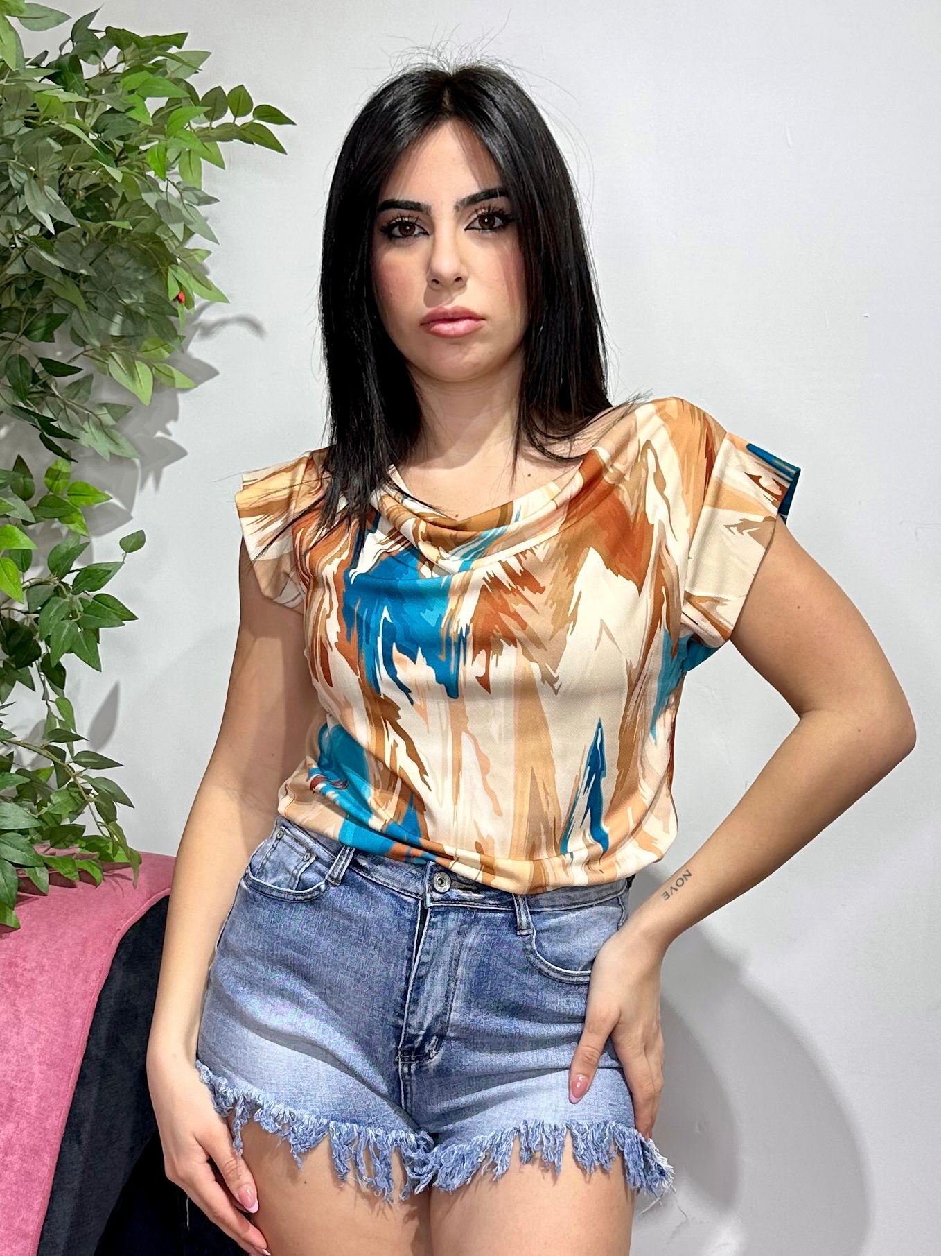 Maglia in tessuto strutturato con fantasia multicolor e scollo a cappuccio. Fabbricato in Italia.