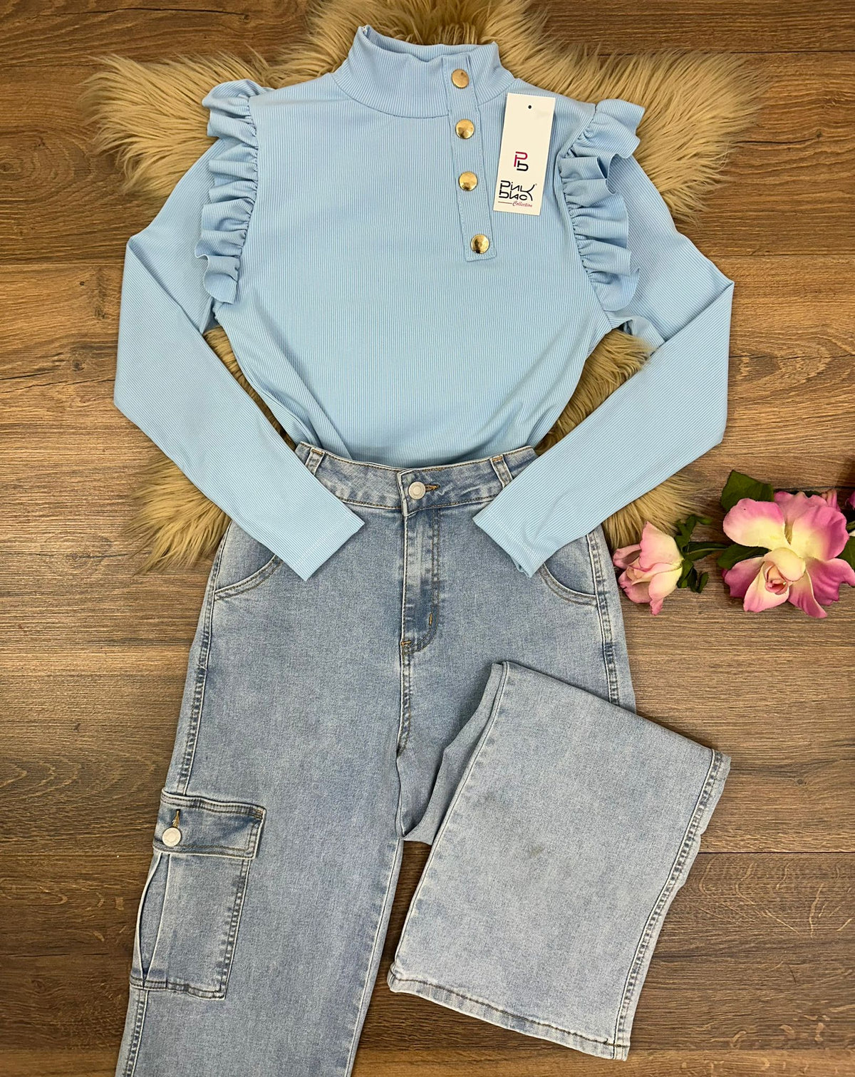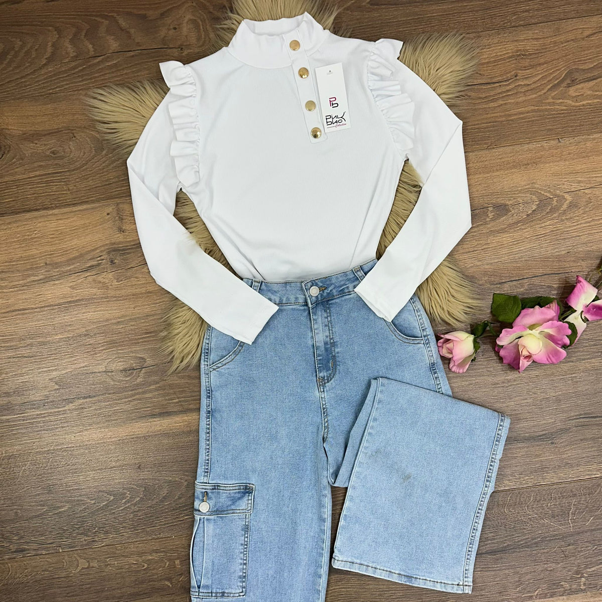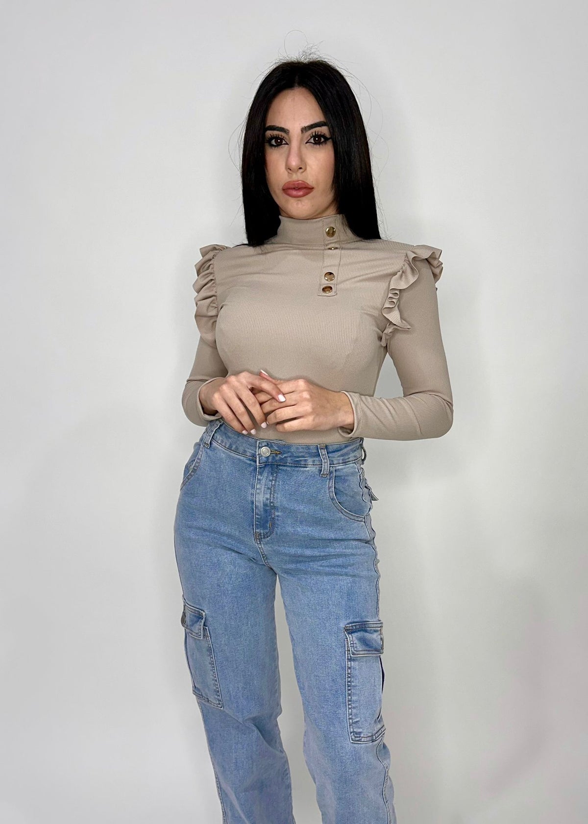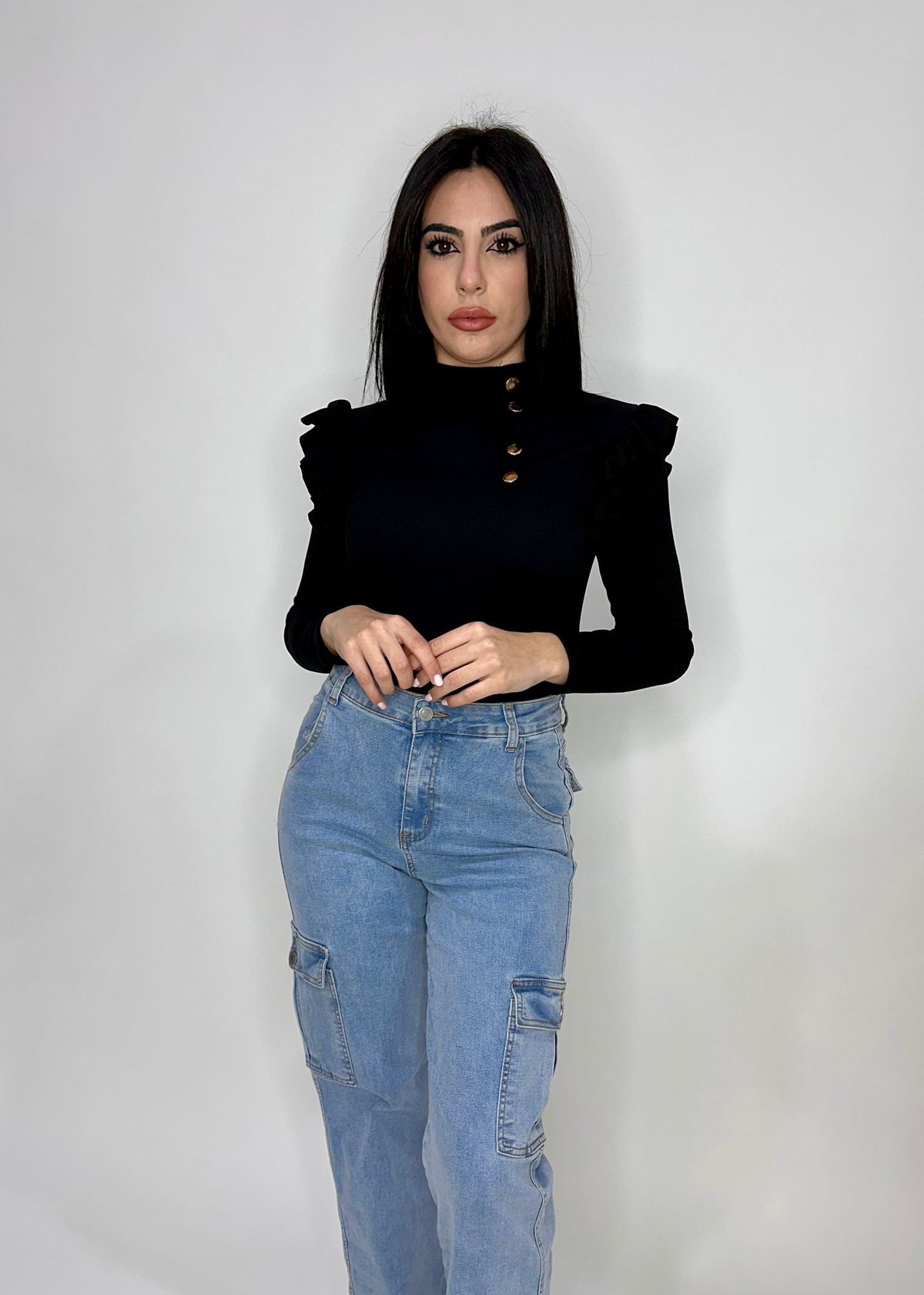 Maglia a costine con volant e applicazione di bottoni. Fabbricato all'estero.