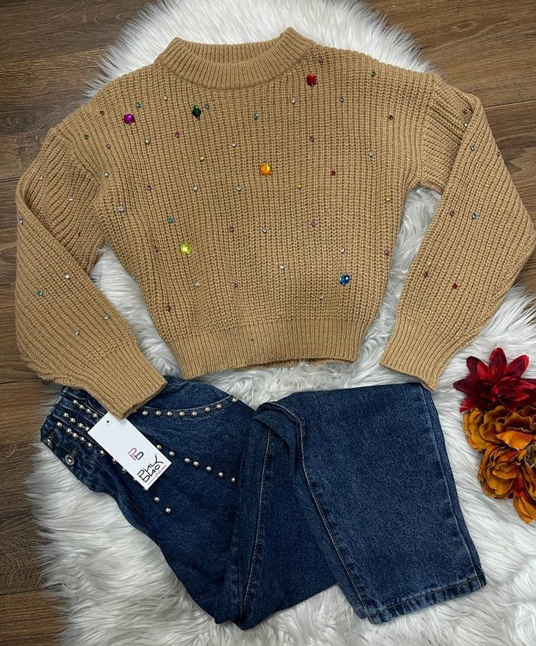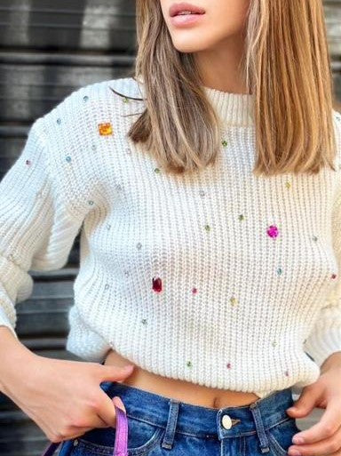 Maglione pesante con pietre multicolor. Fabbricato all'estero.