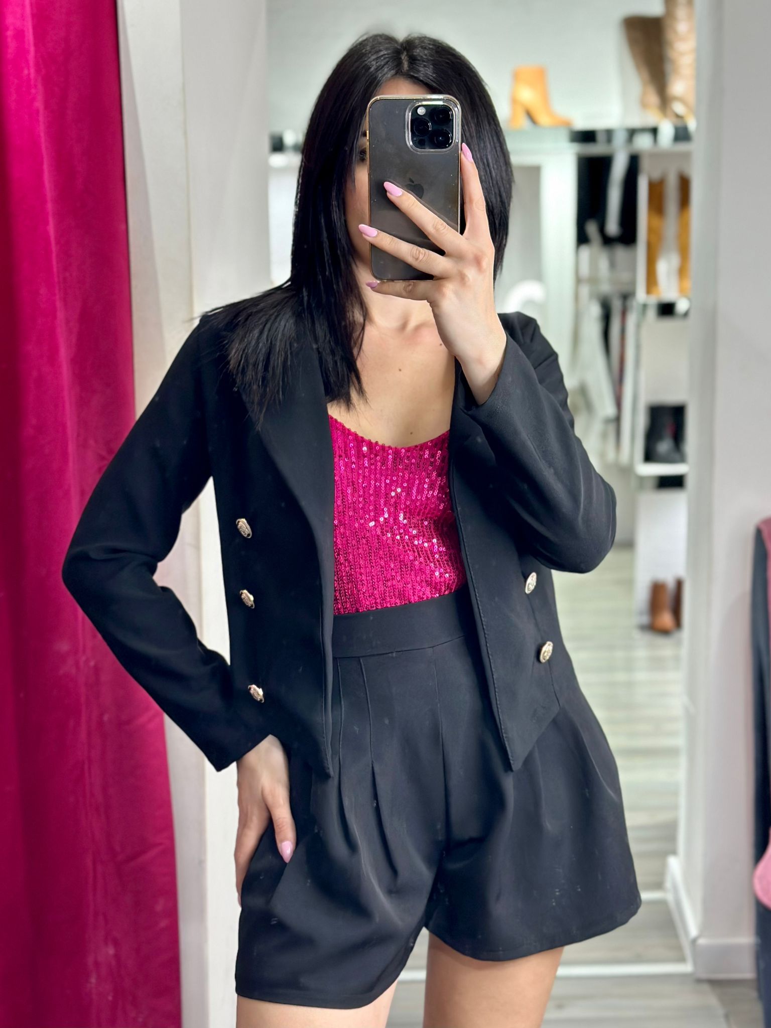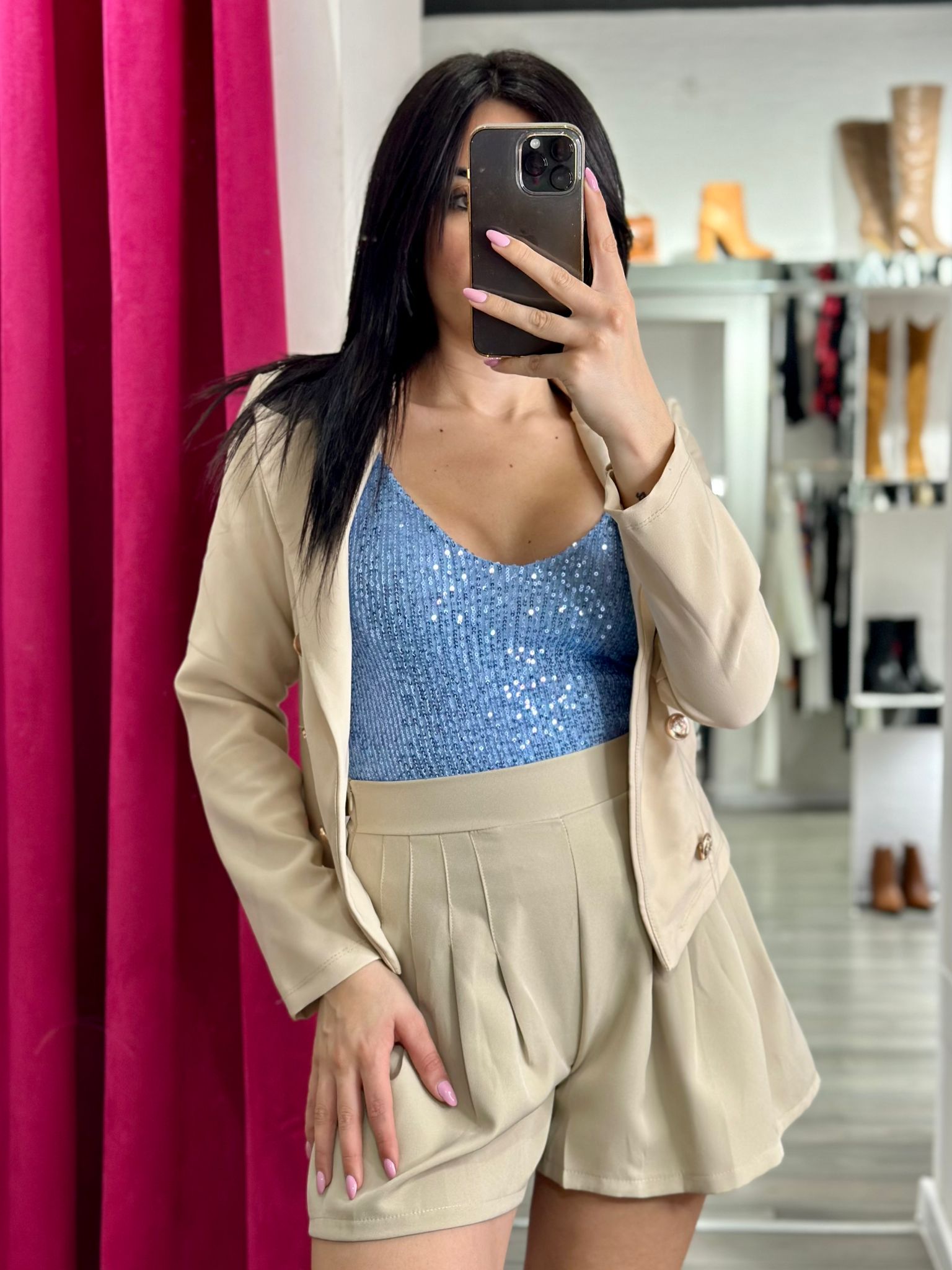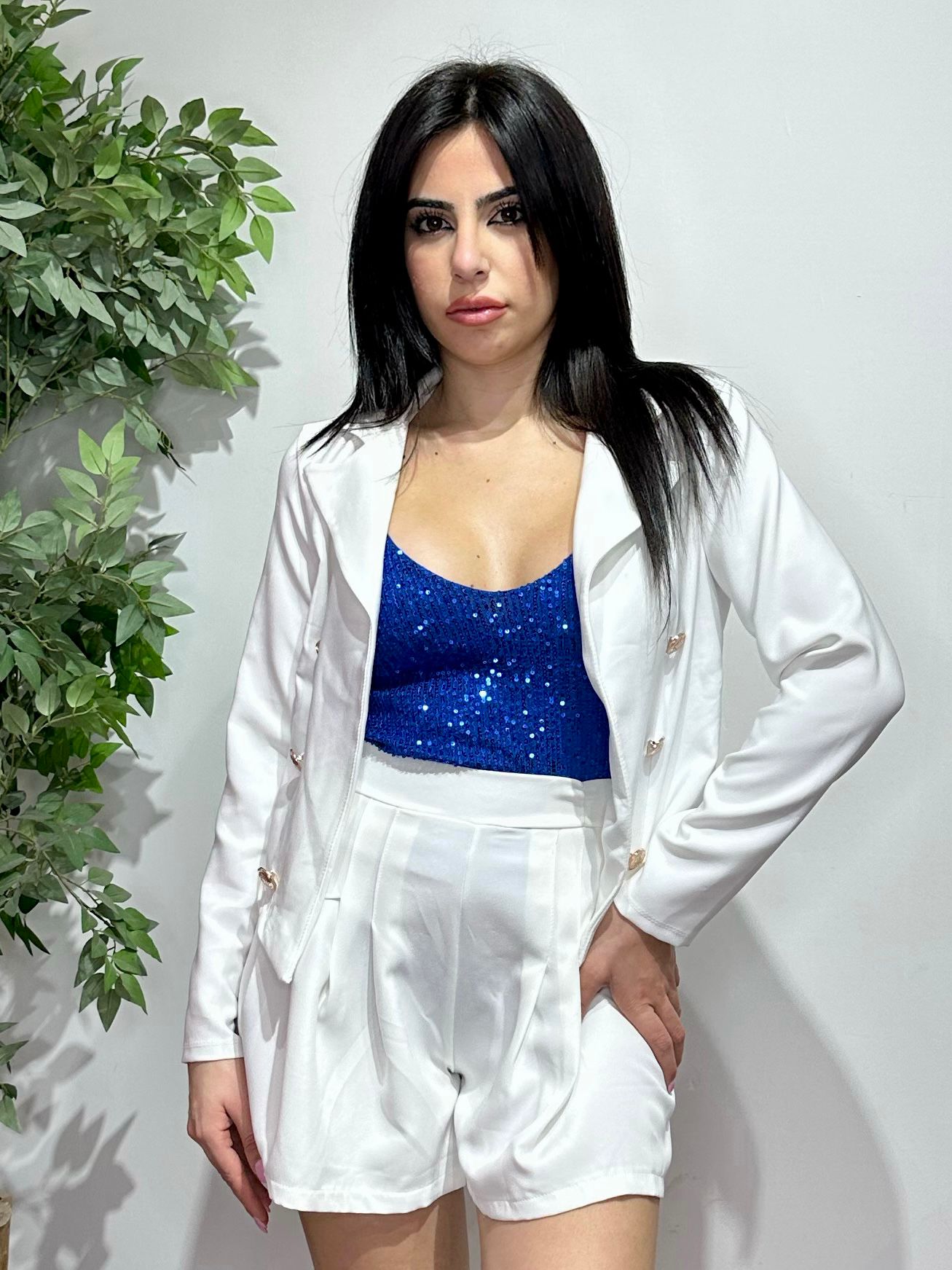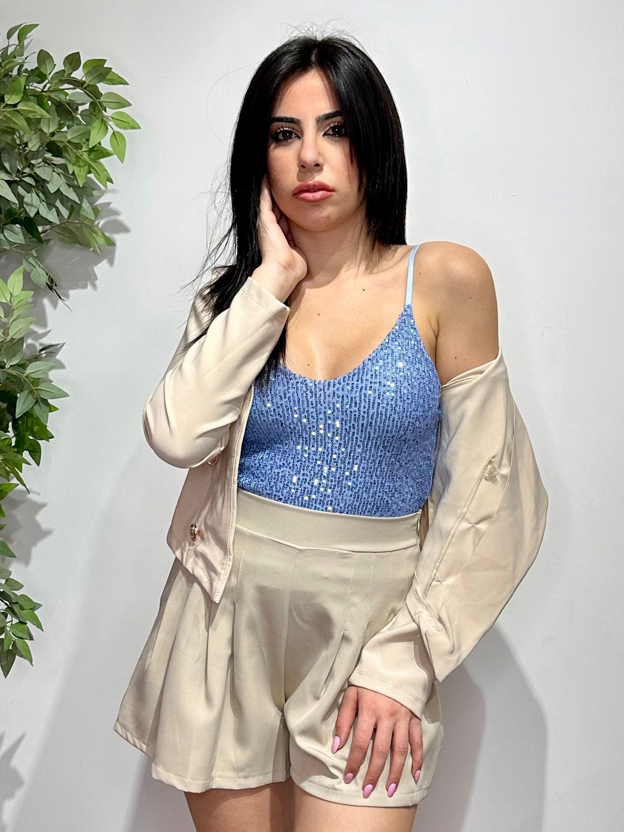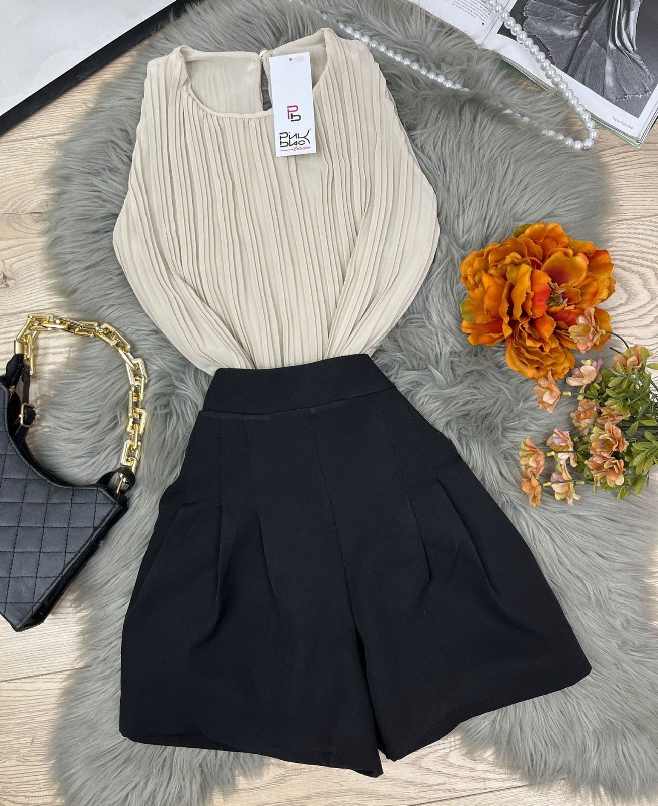Short in tessuto scuba crepe a vita alta con pinces e cerniera. La vestibilità delle taglie risulta regolare. Fabbricato in Italia.