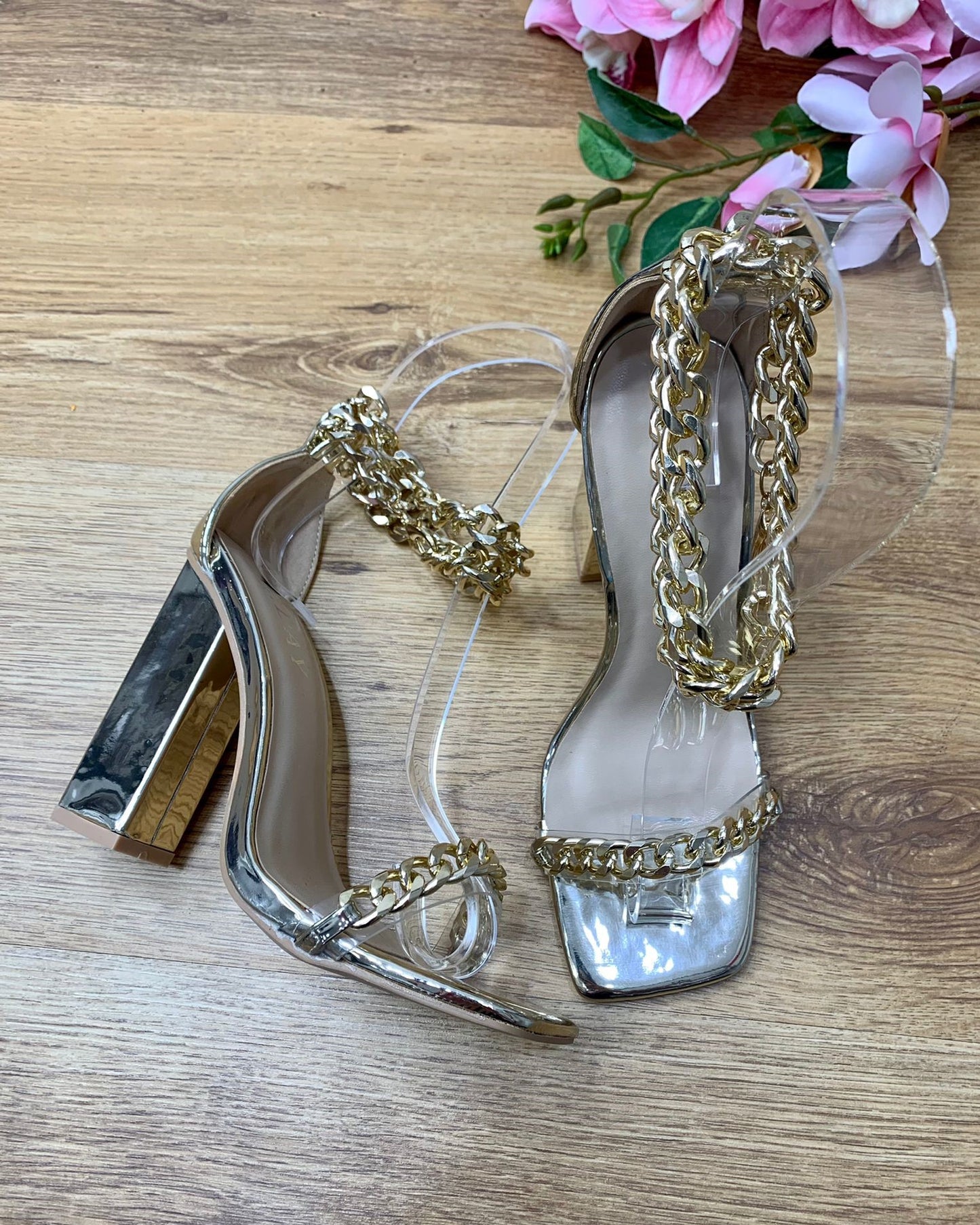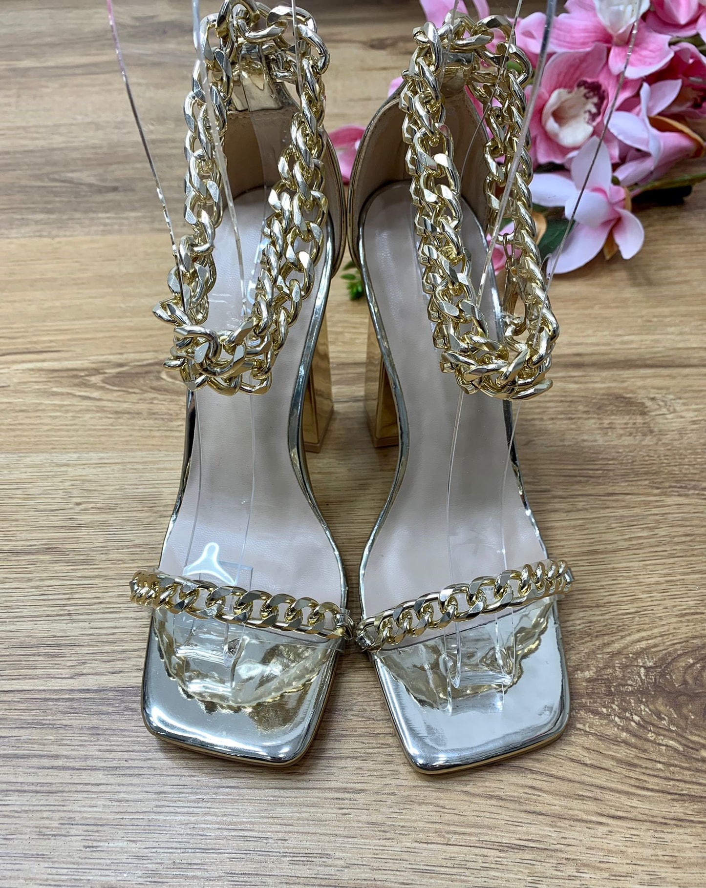 Sandalia en cuero ecológico con una correa de anillo con anillos.