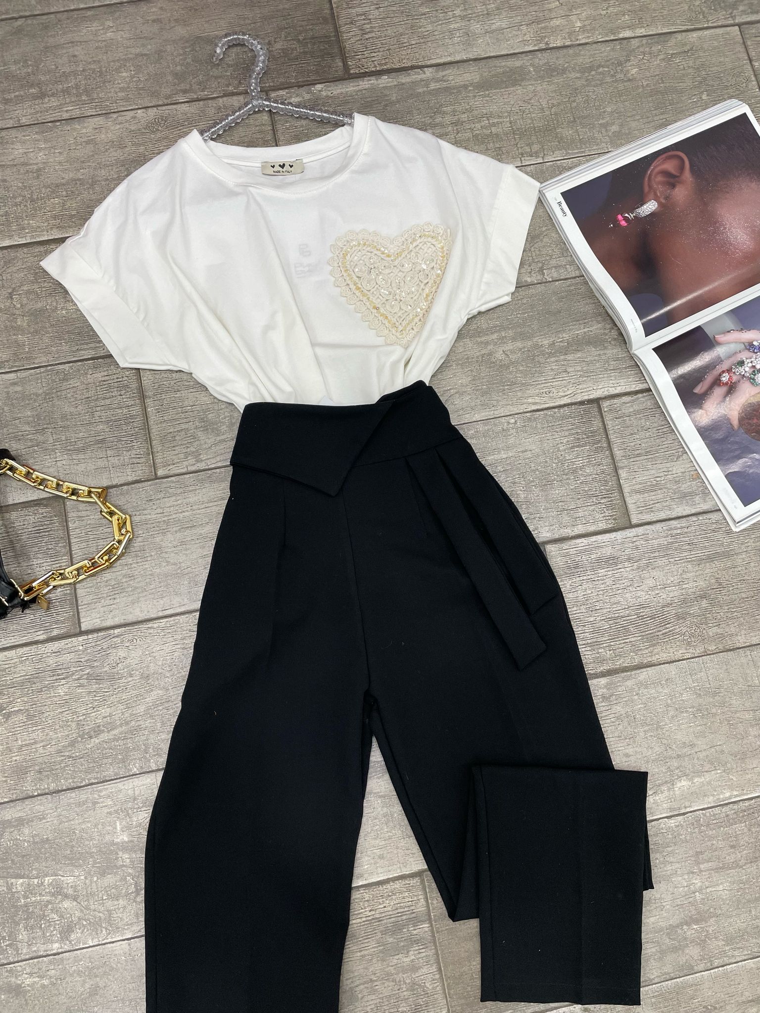 T-shirt con cuore ricamato in rilievo e micro perline applicate
