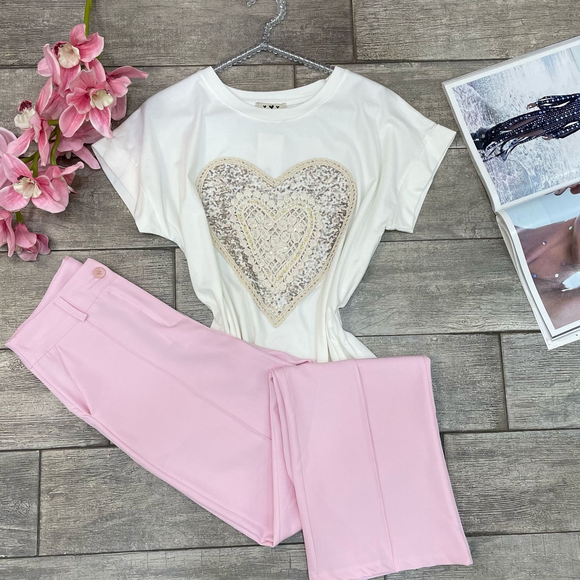 T-shirt con cuore grande ricamato in rilievo e micro perline applicate
