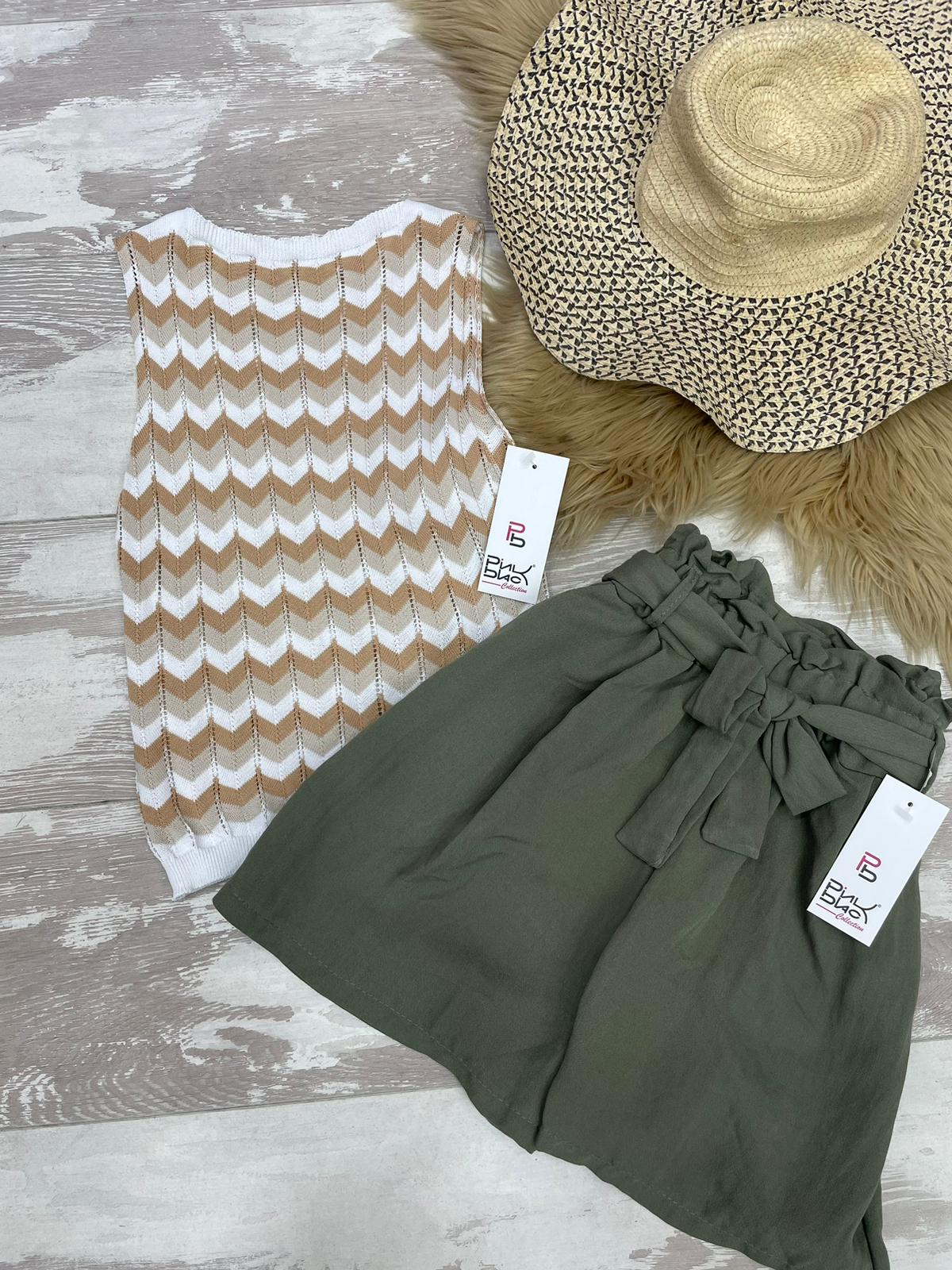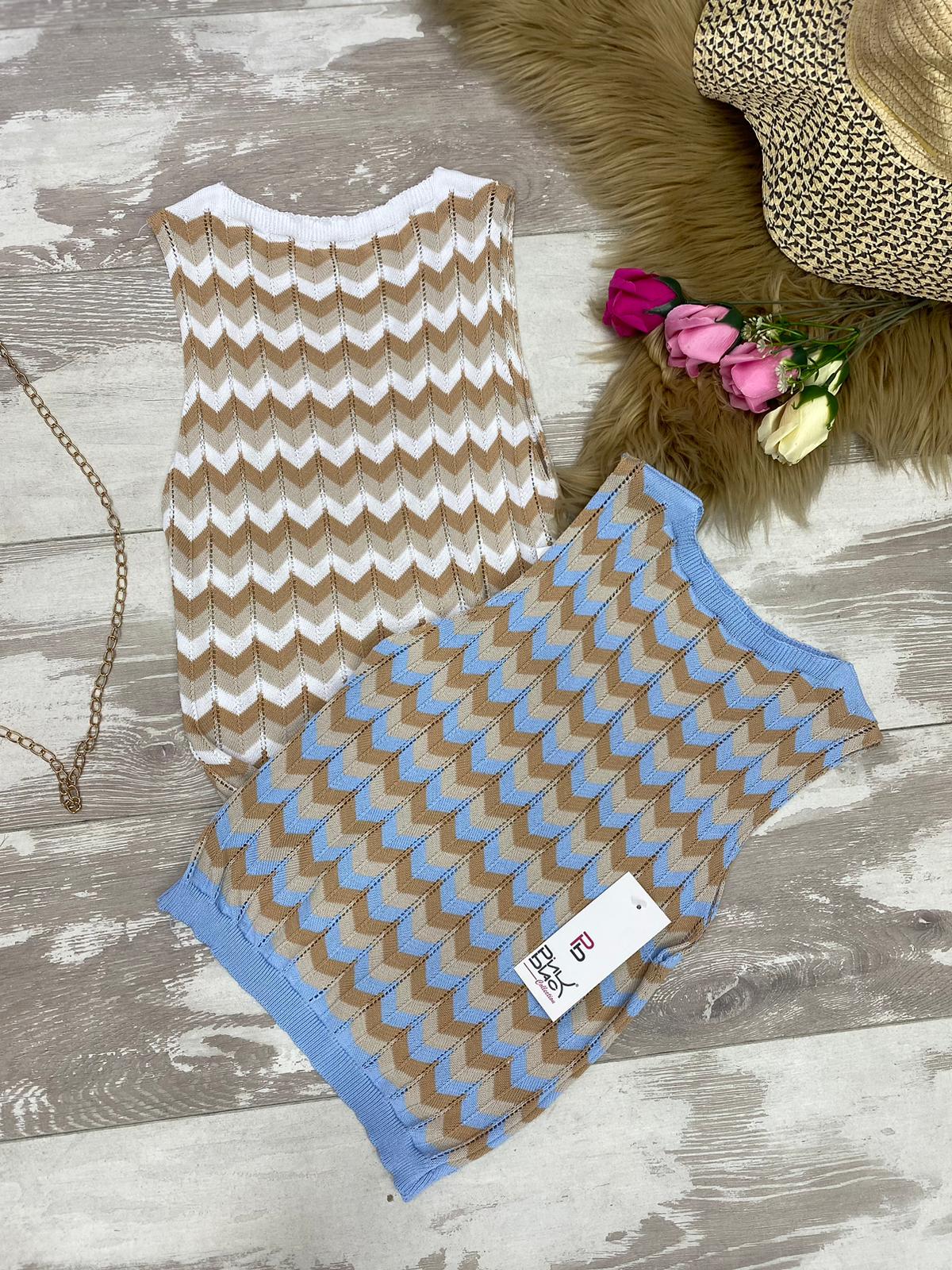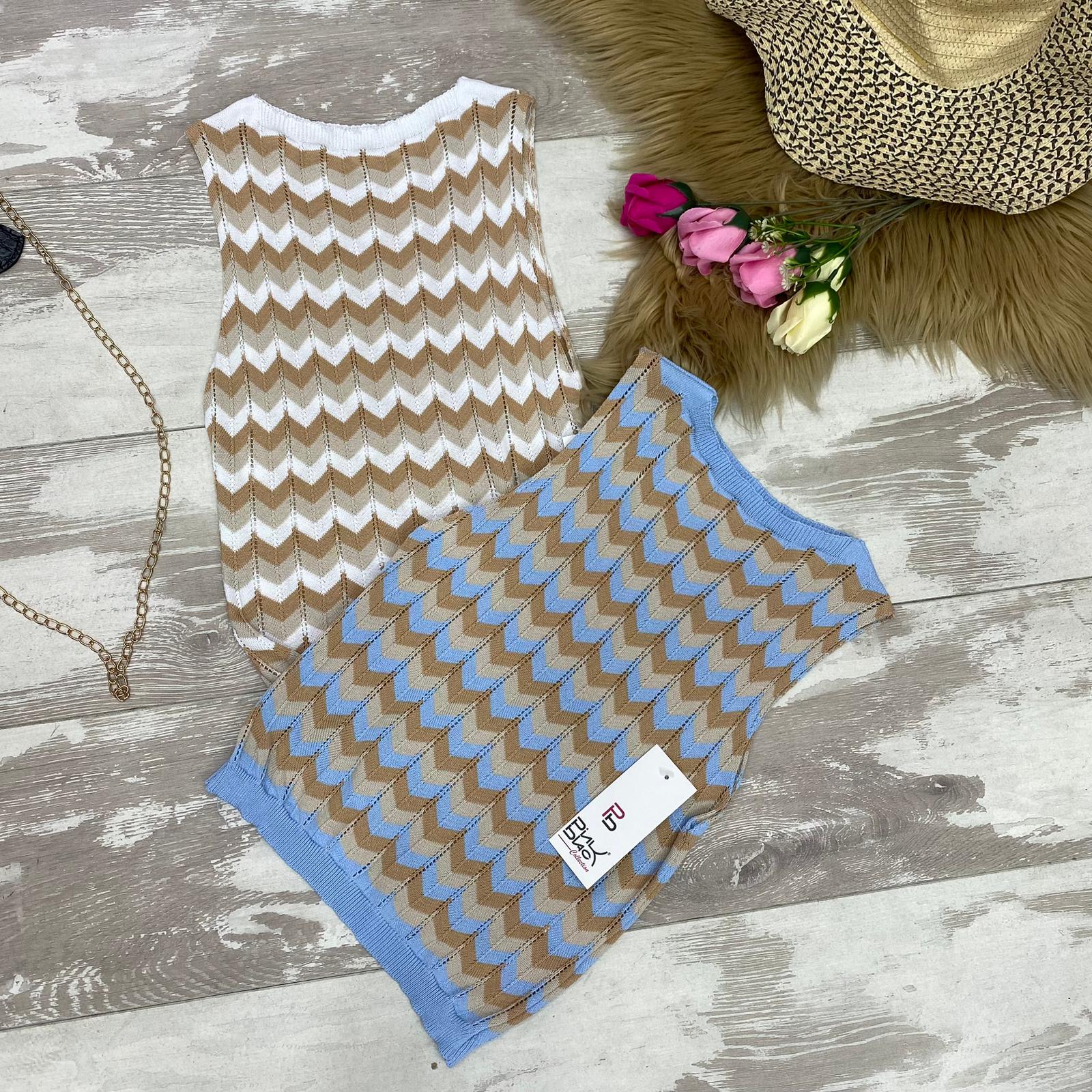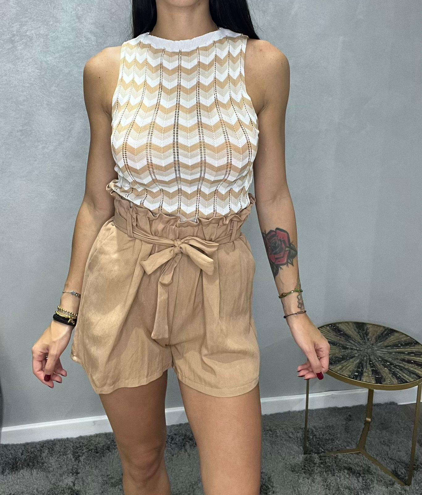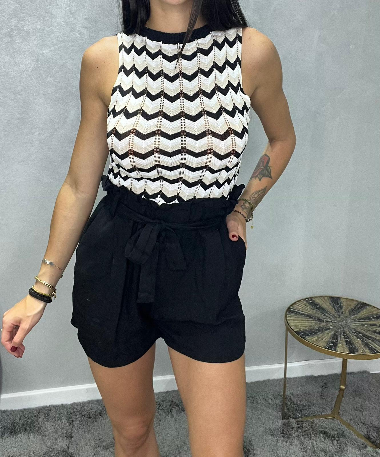Top traforato elasticizzato con fantasia geometrica . Fabbricato in Italia.