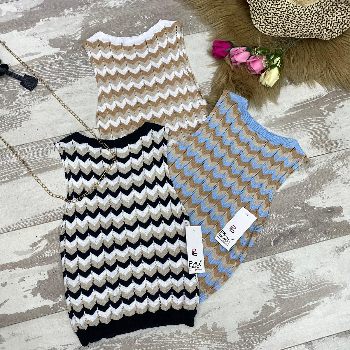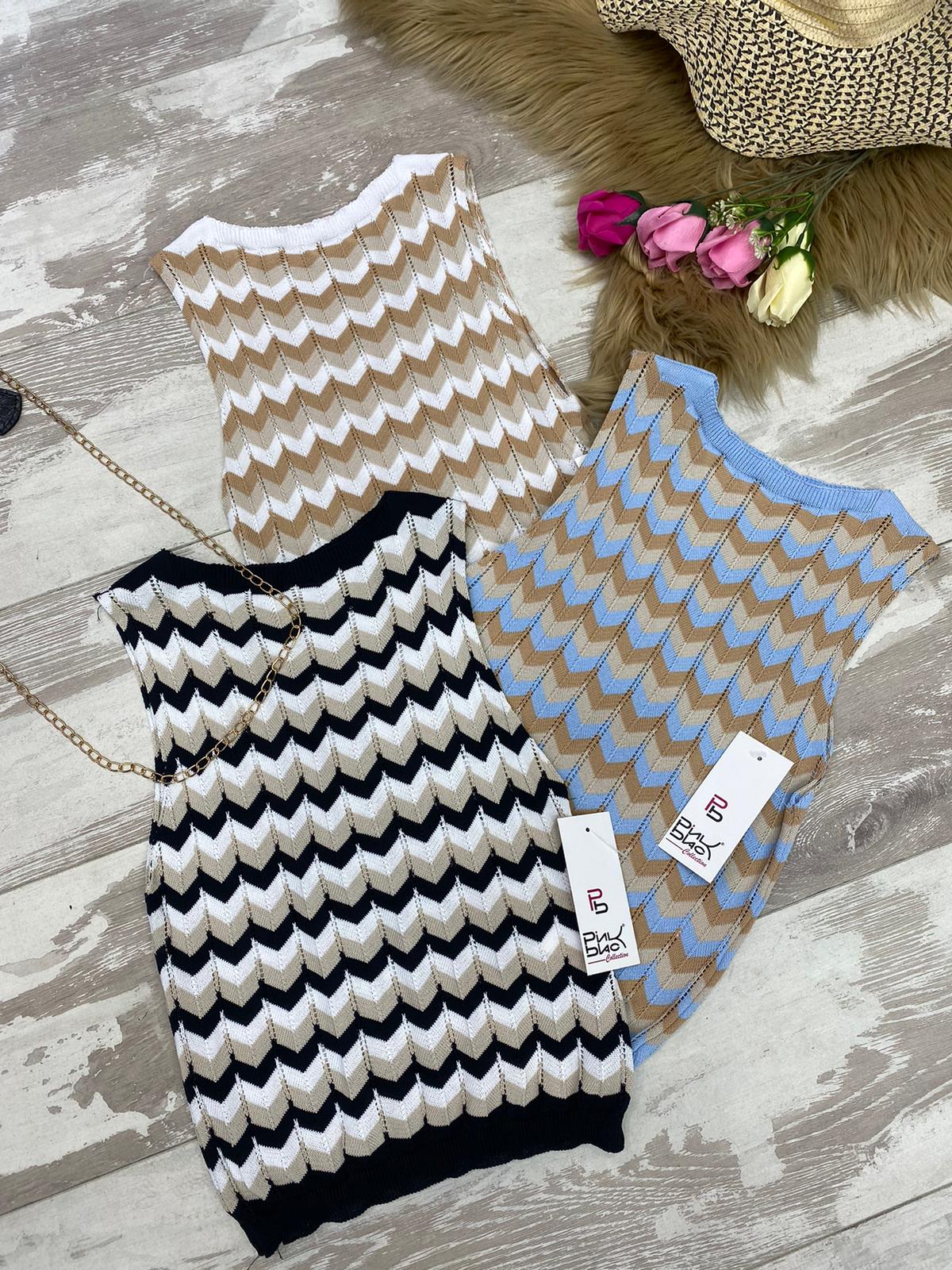 Top traforato elasticizzato con fantasia geometrica . Fabbricato in Italia.