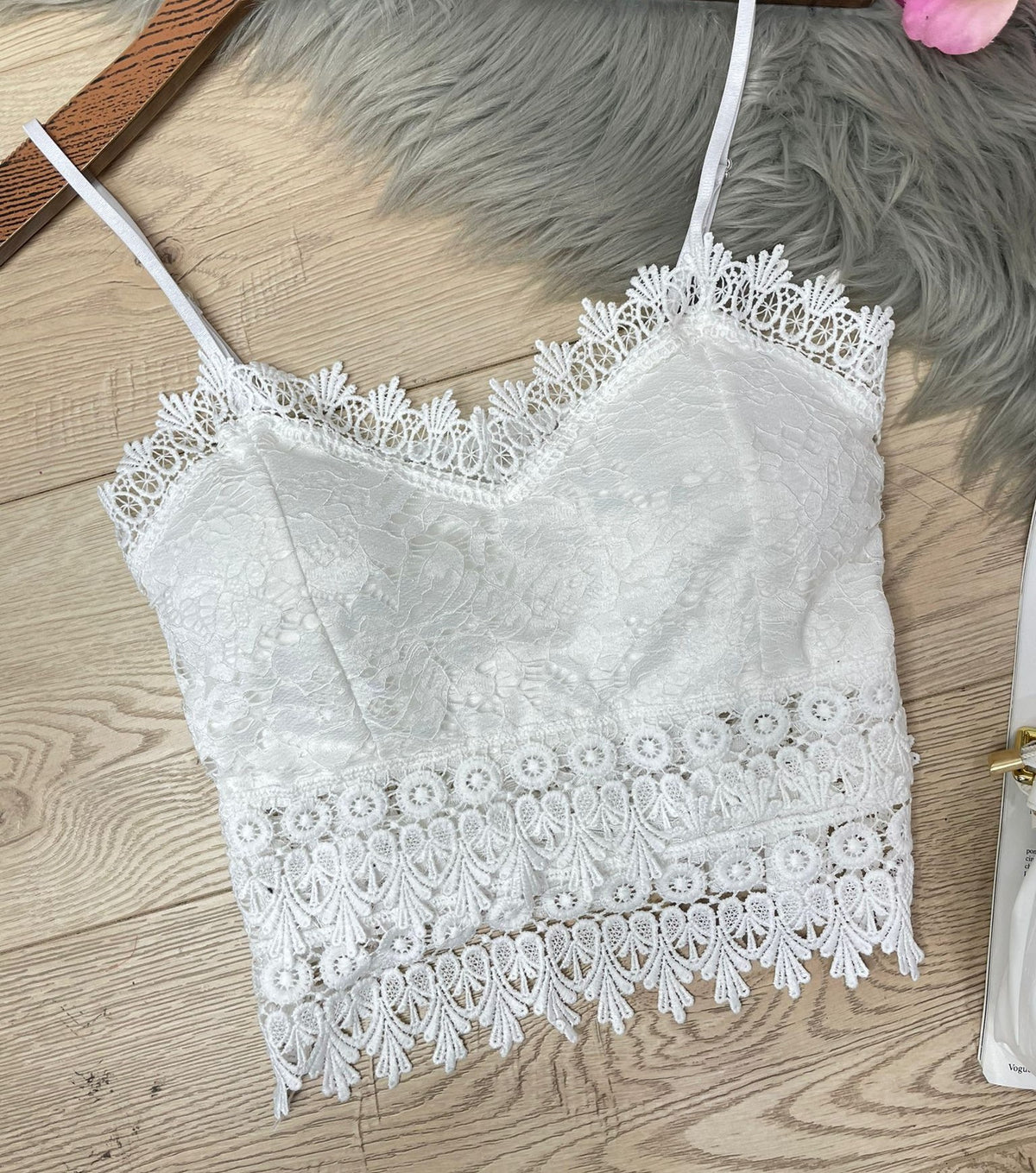 Cubra con bordado de encaje y macramé en un color sólido. Modelo corto, cuello en V, tazas preformadas, correas de hombro delgadas y ajustables y banda elástica en la parte posterior. Glamour,Se destaca la silueta y el Décolleté, se adapta a una variedad de atuendos, por un aspecto seductor y versátil para un ajuste óptimo y de moda. Fabricado en el extranjero.