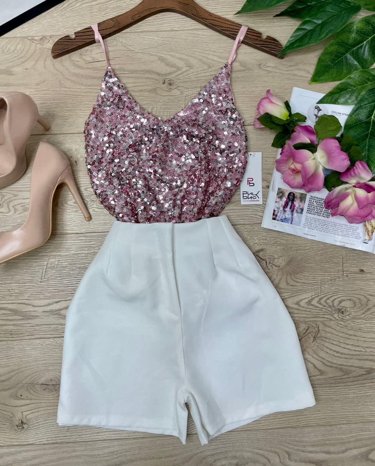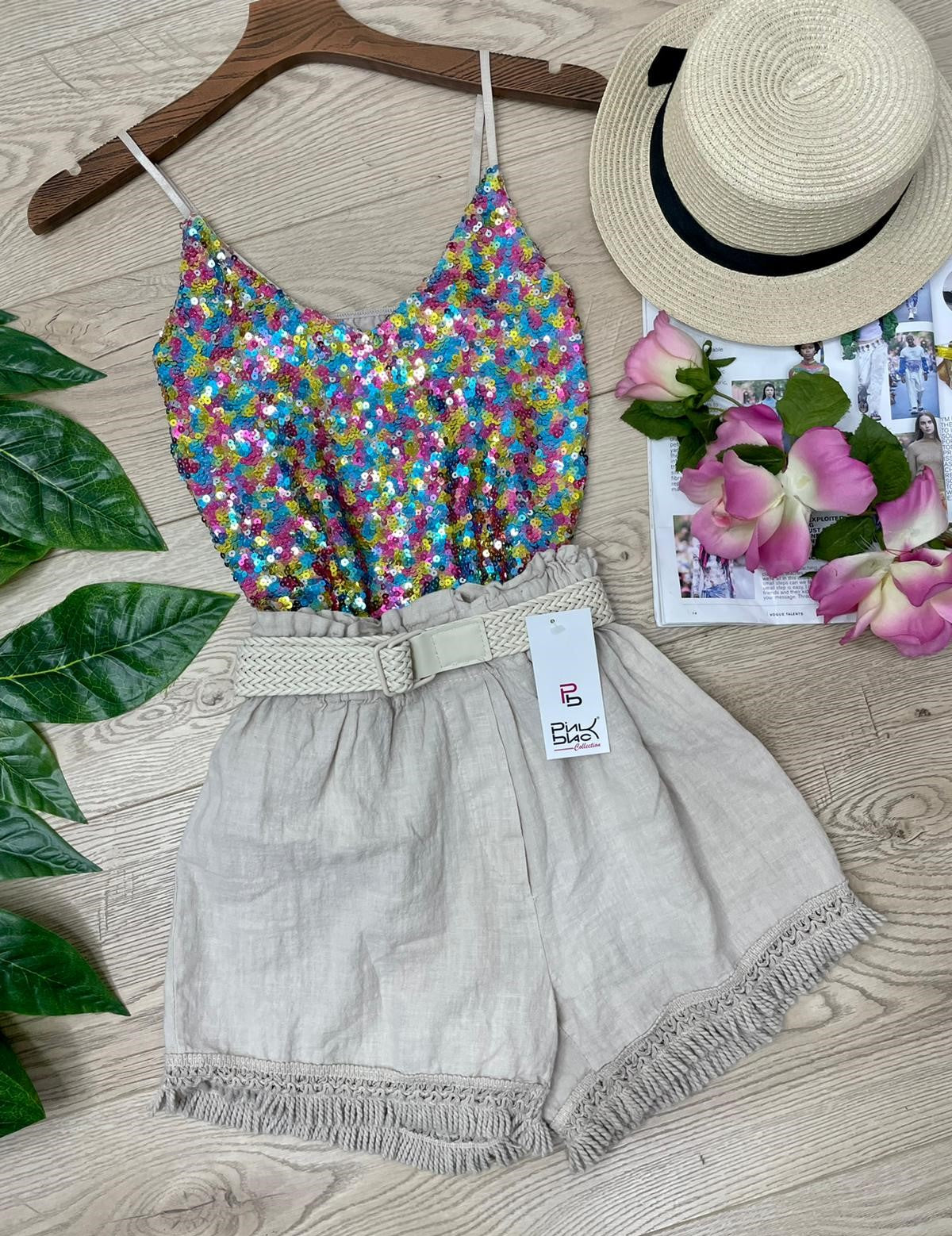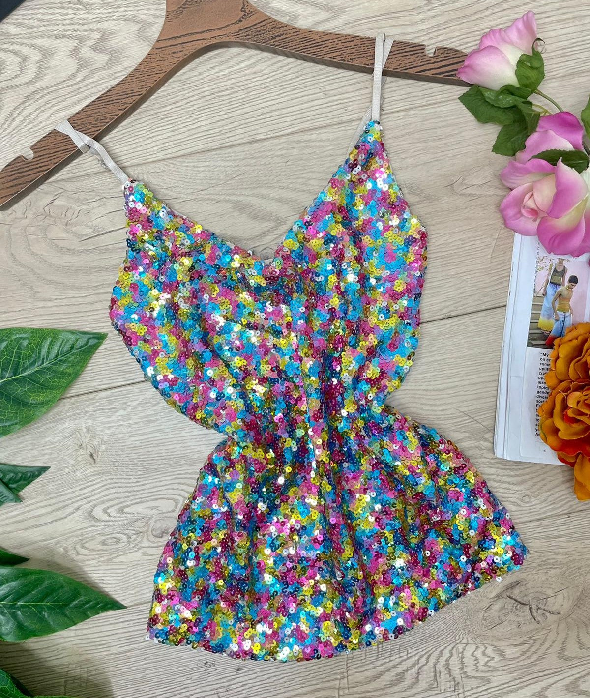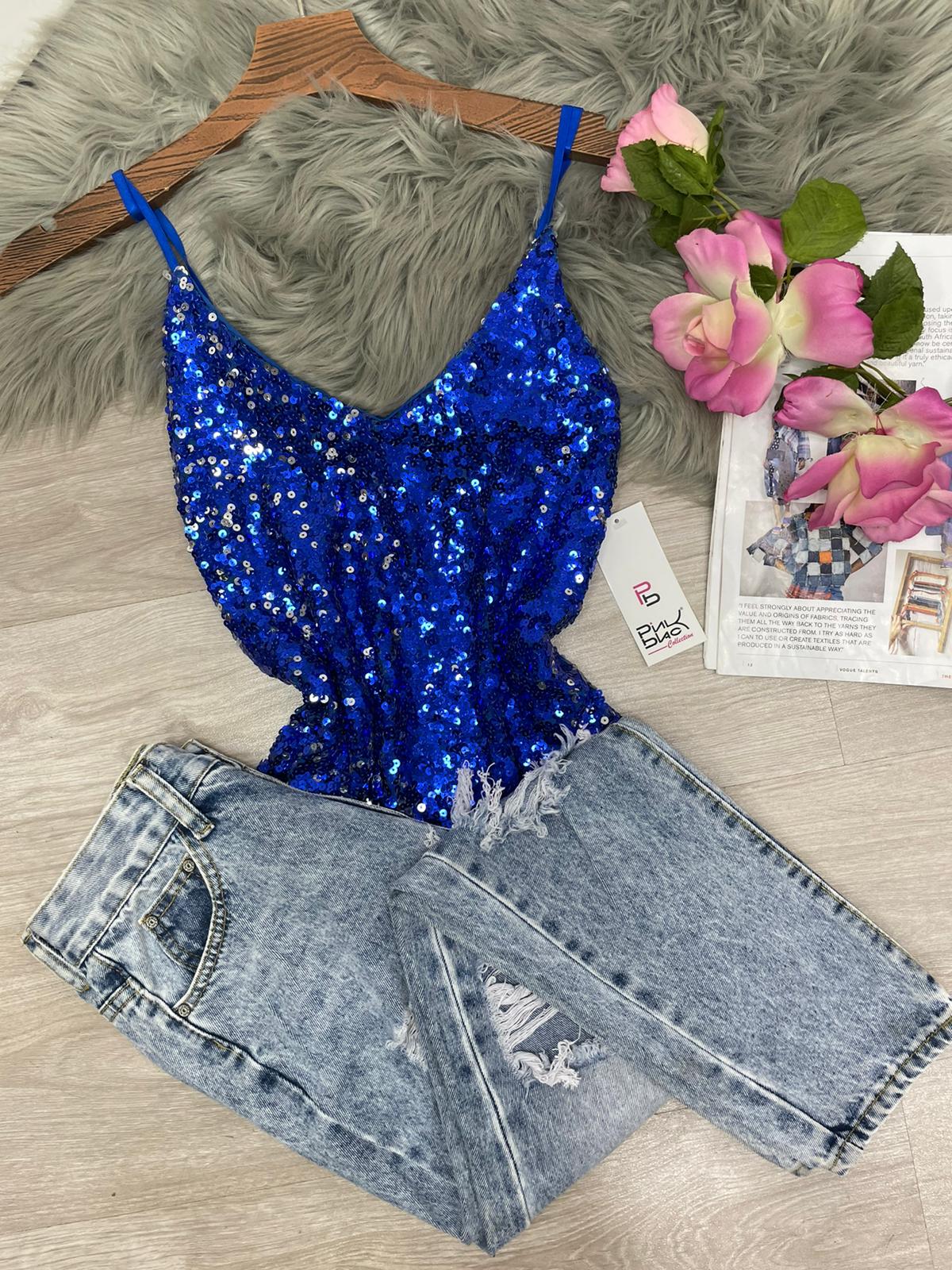 Top con paillettes e spalline regoalbili. Fabbricato all'estero.