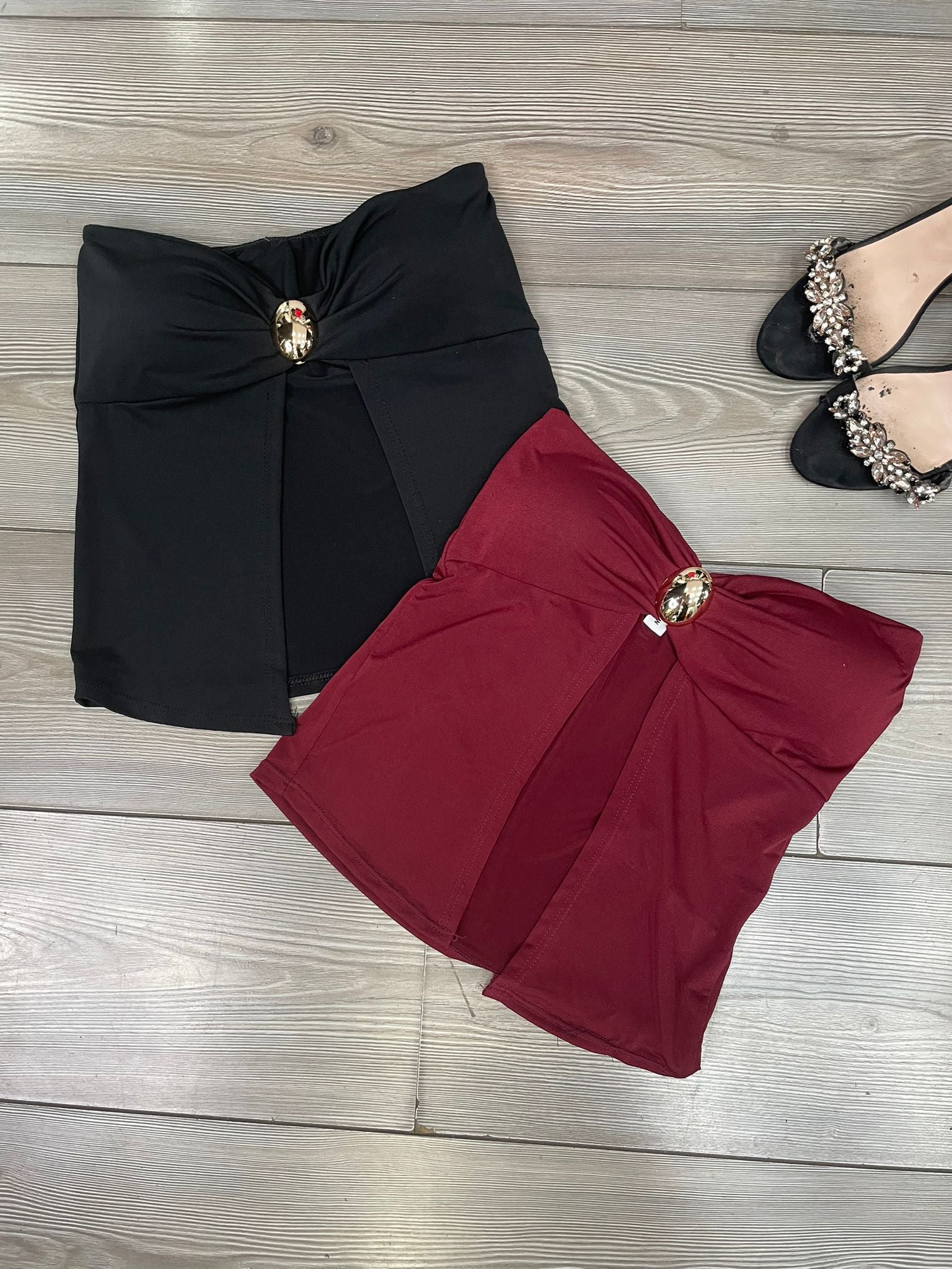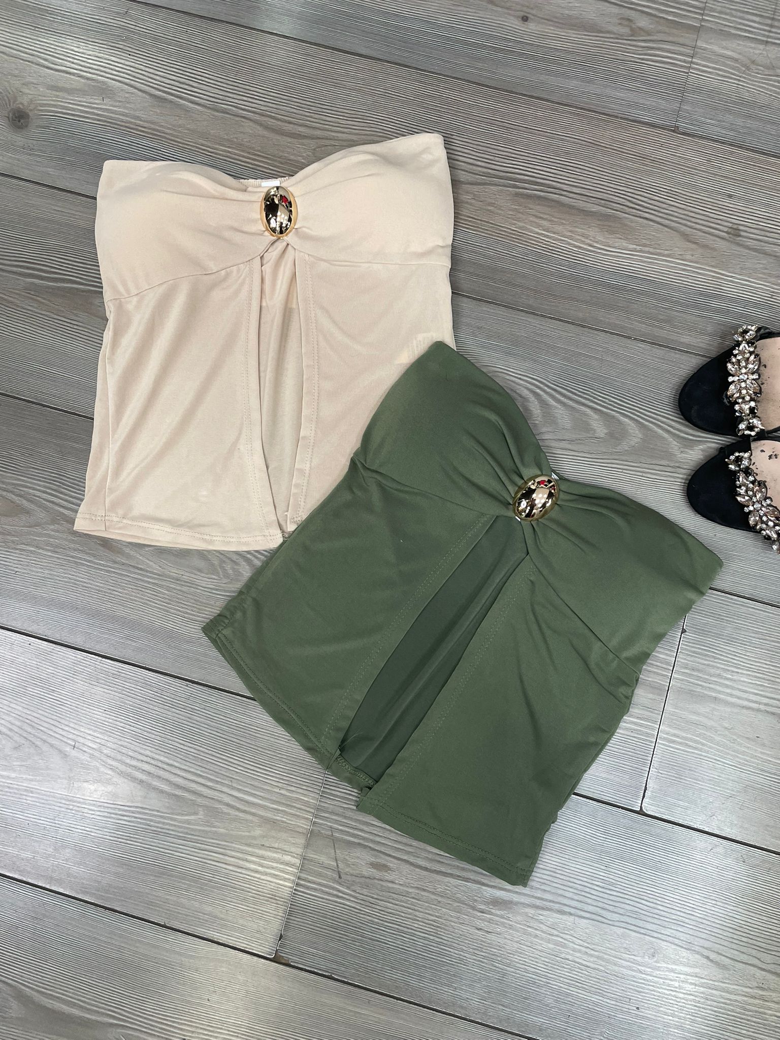 Top in leggero tessuto strutturato a fascia con gioiello centrale e coppe preformate Fabbricato in Italia.