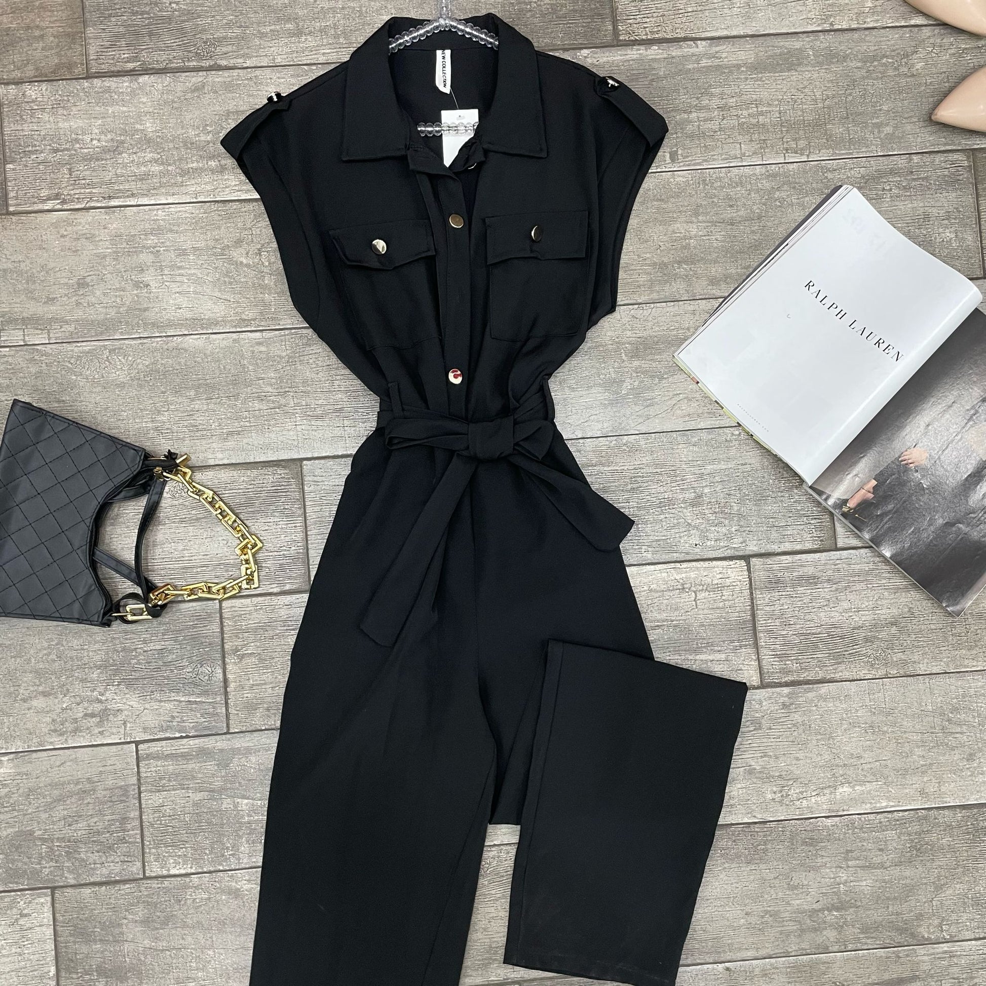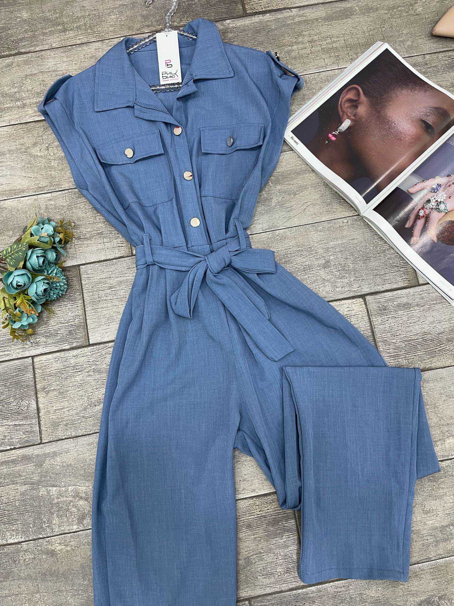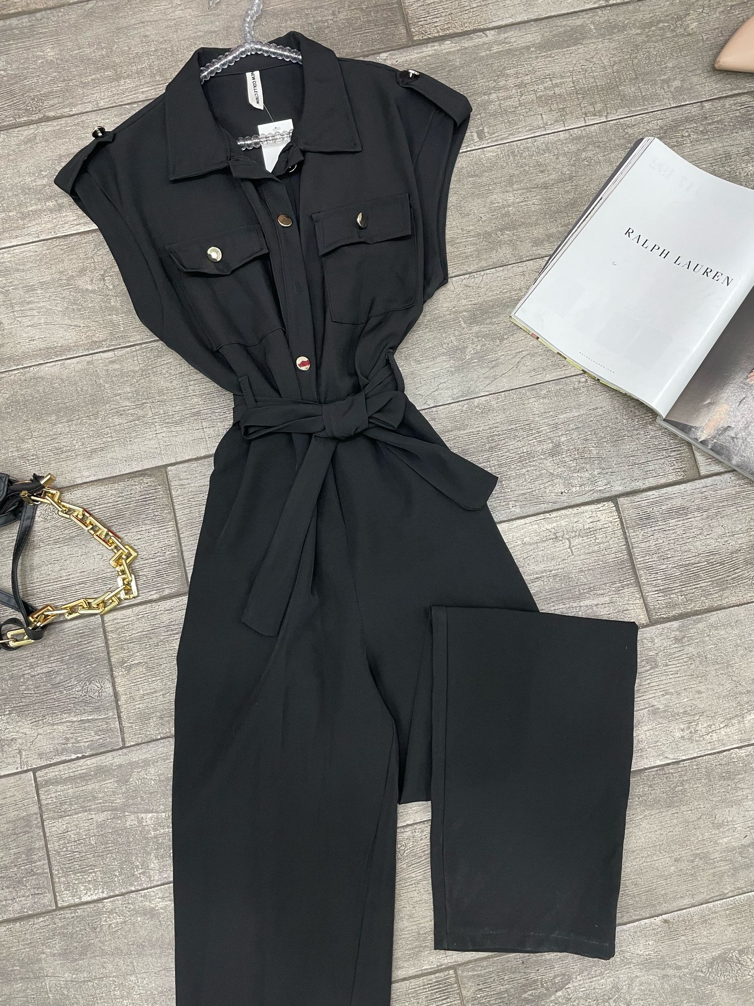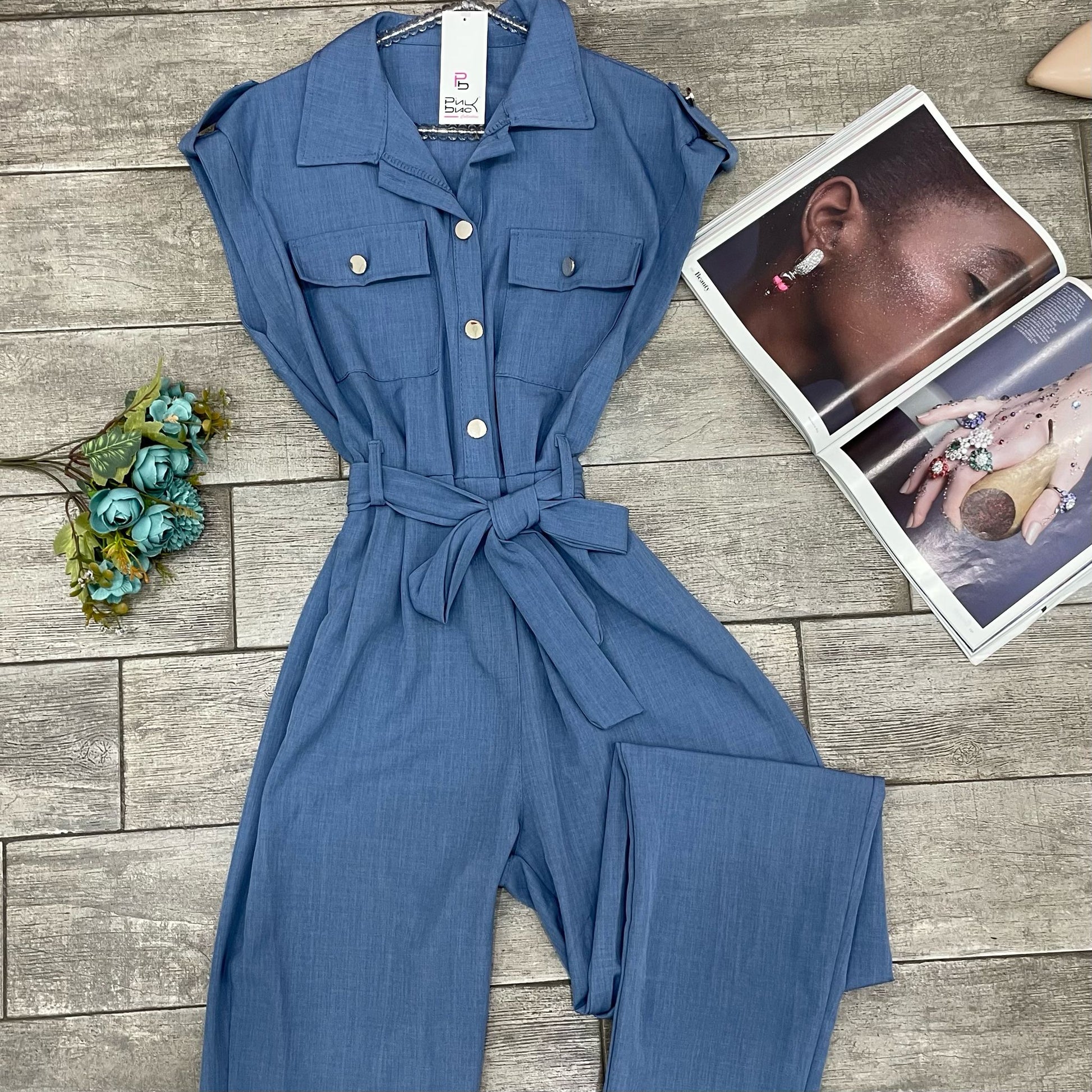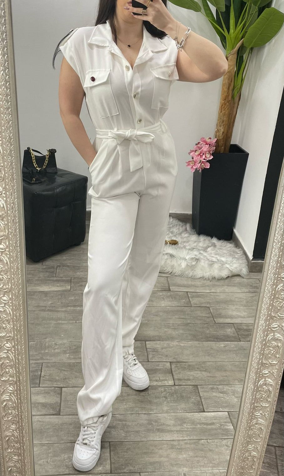 Tuta in tessuto strutturato con bottoni elastico in vita interno e cinturino in tessuto incluso.