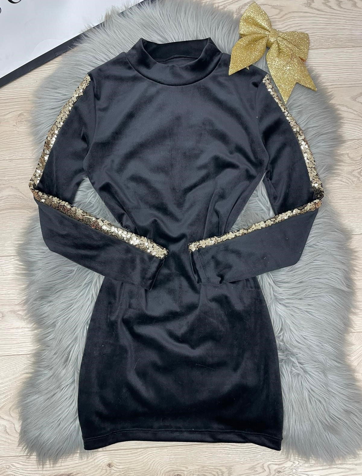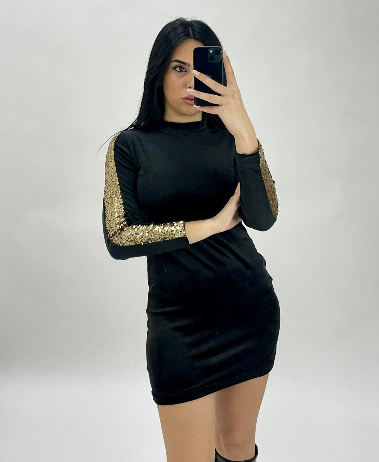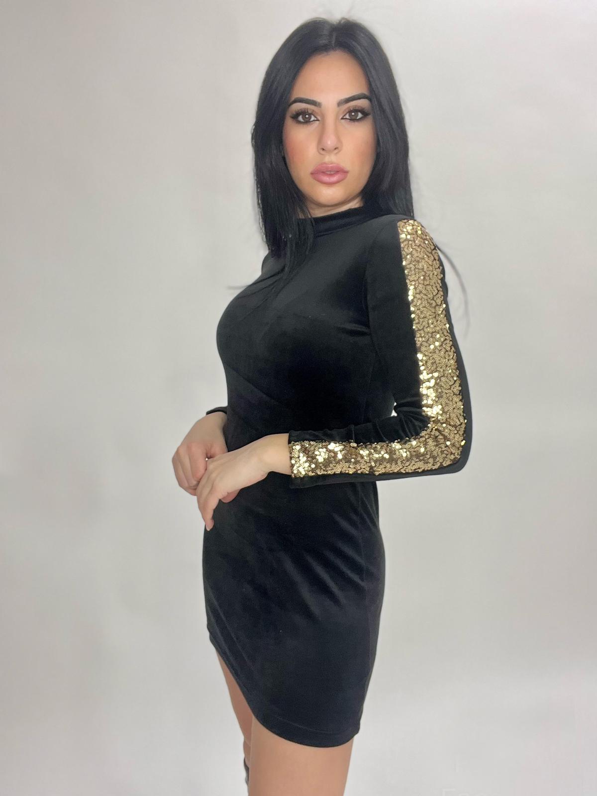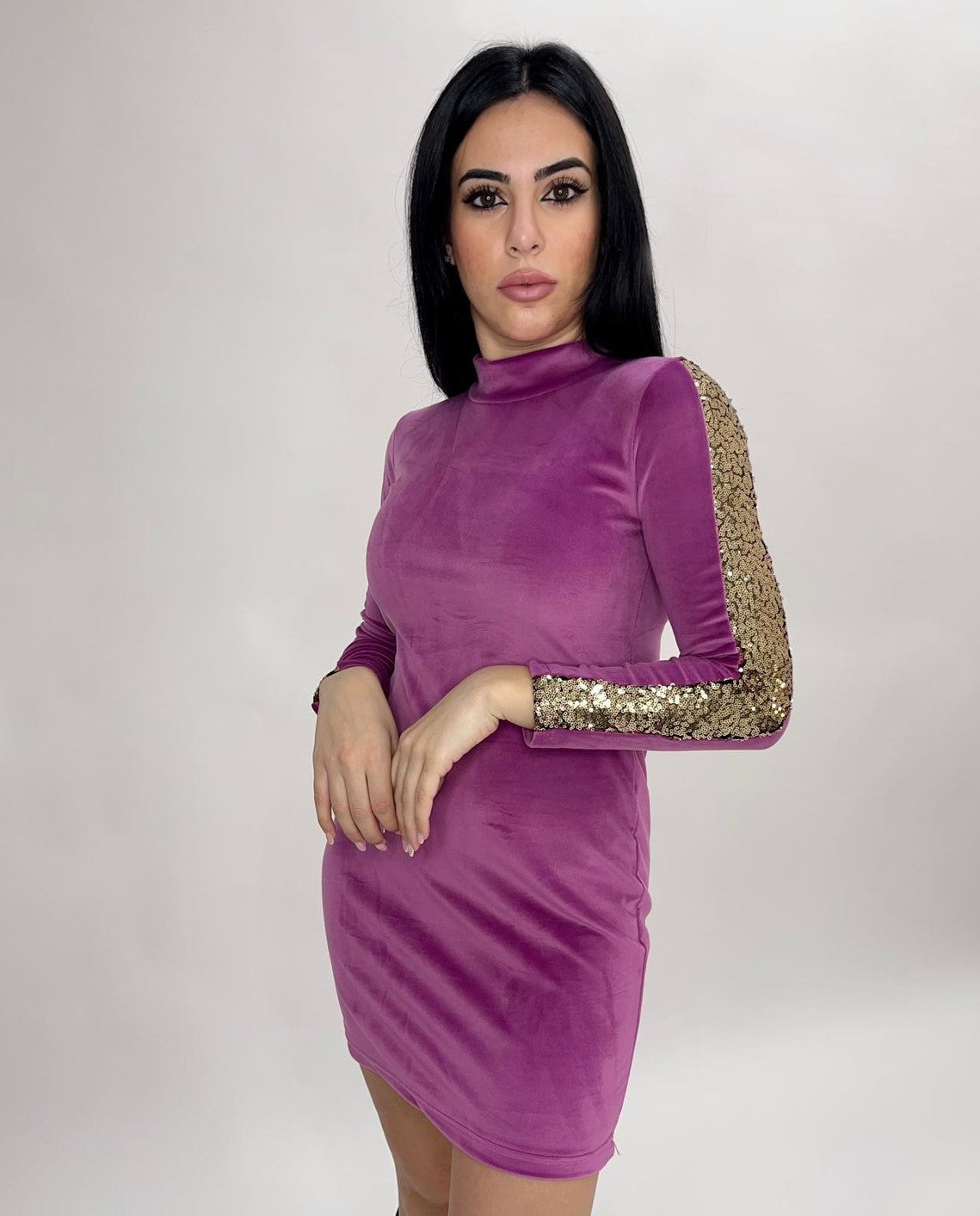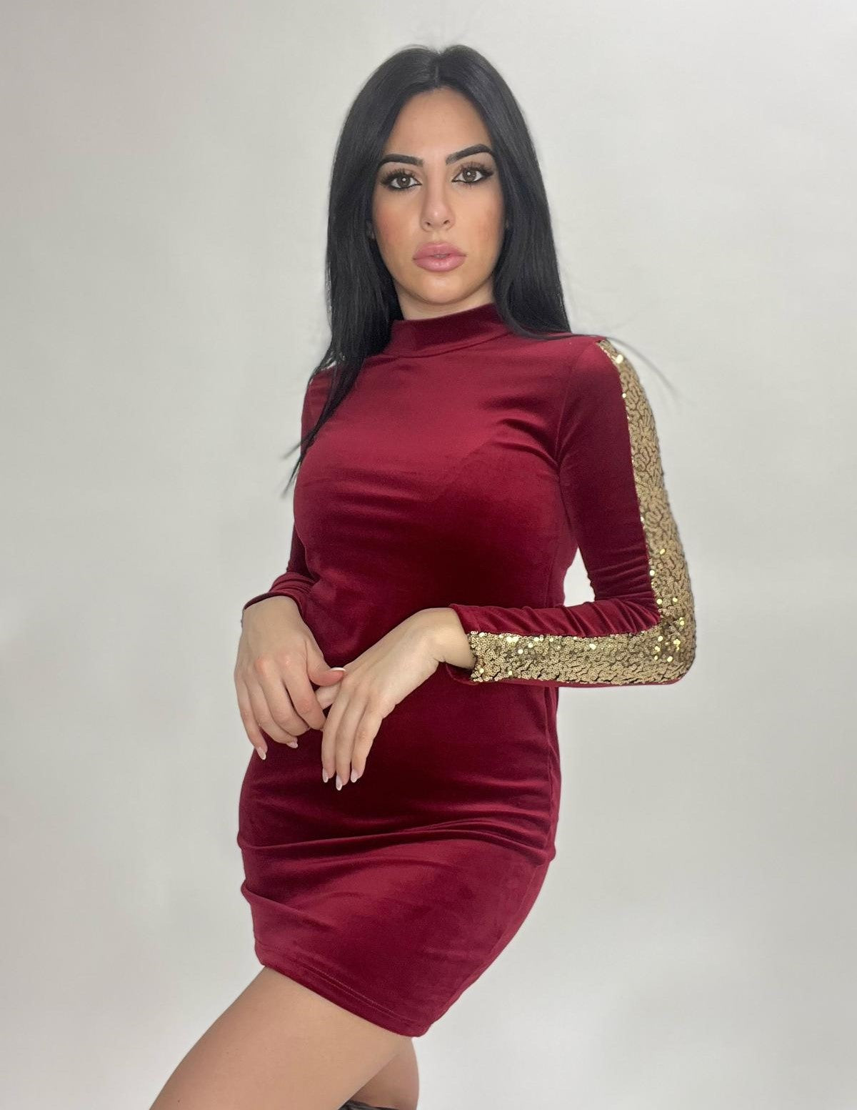 Abito in ciniglia con paillettes nelle maniche. Fabbricato in Italia.