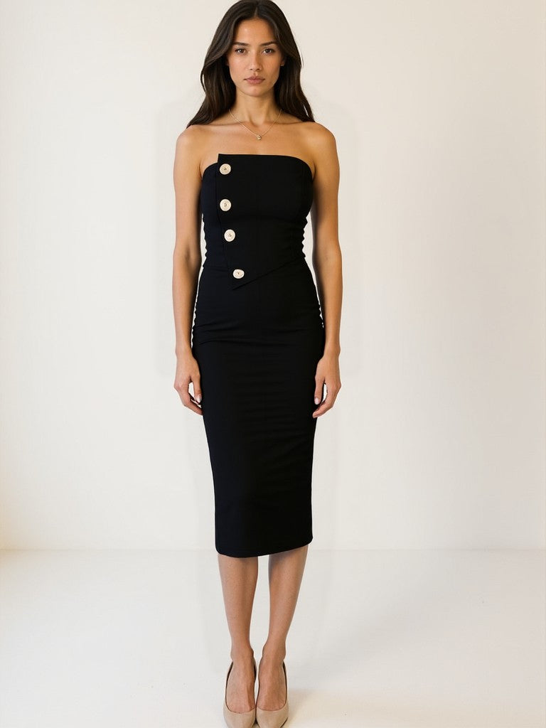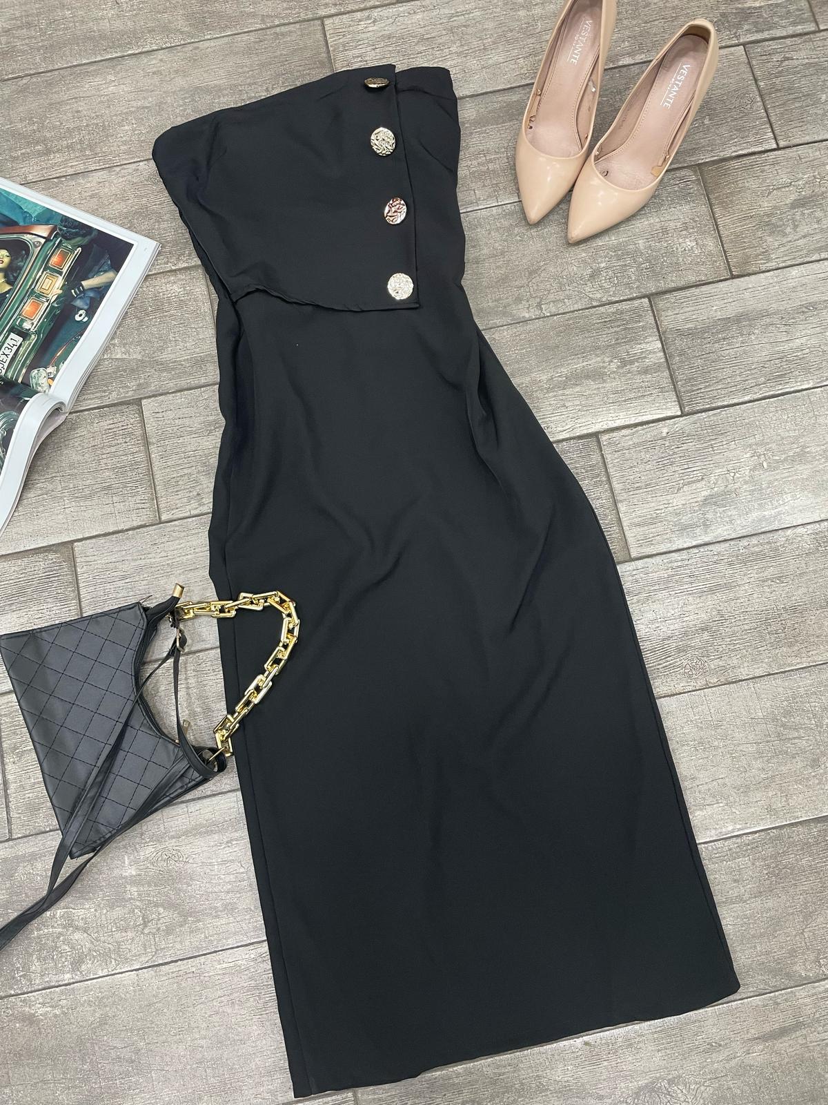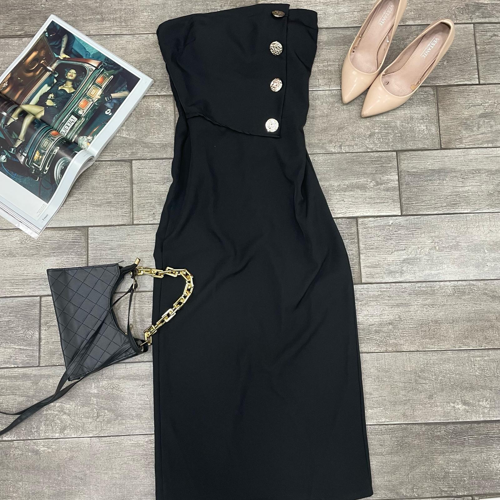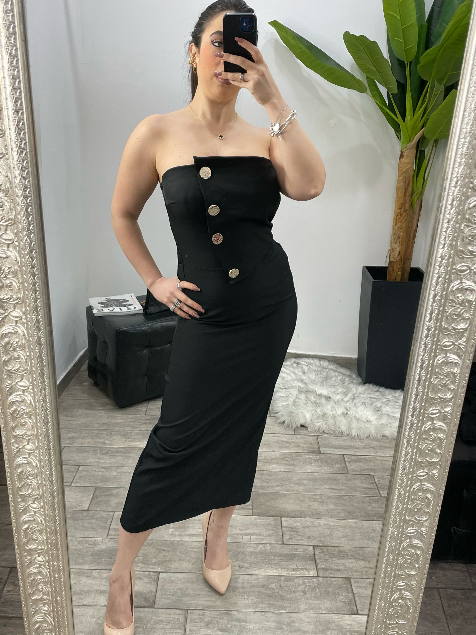 Abito lungo a fascia asimmetrica con bottoni oro , spacco ed elastico sul retro Fabbricato in Italia.