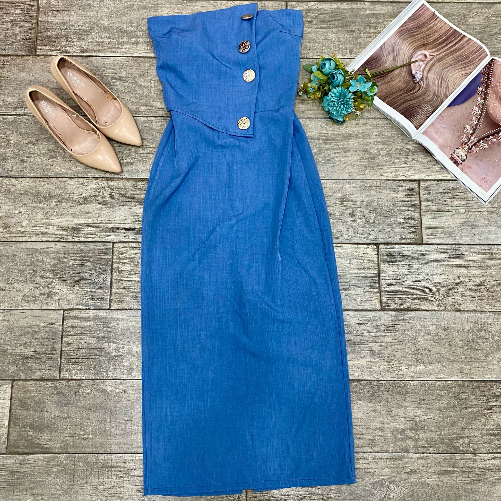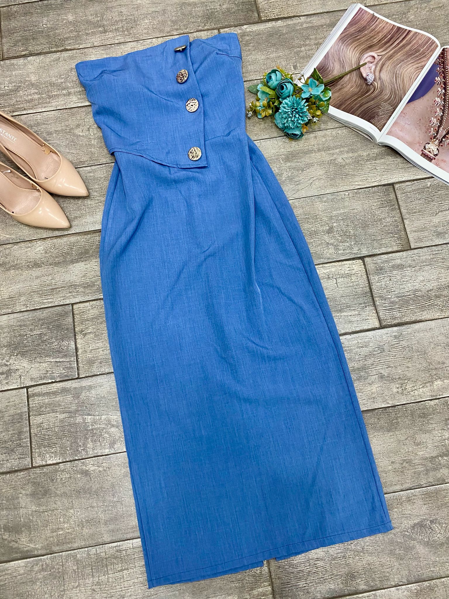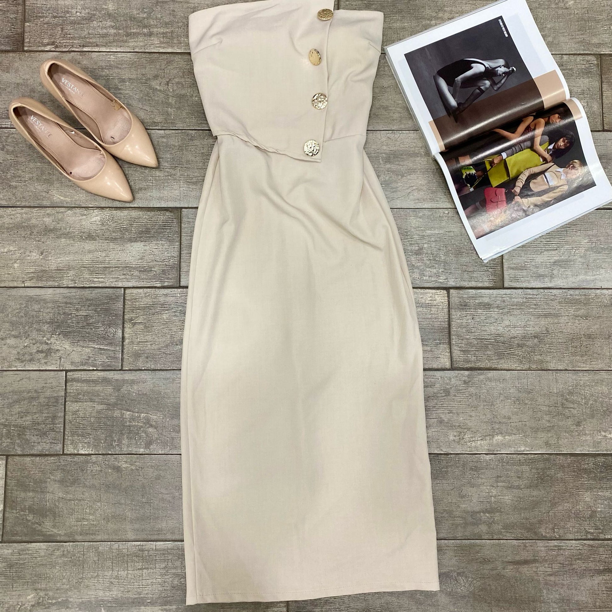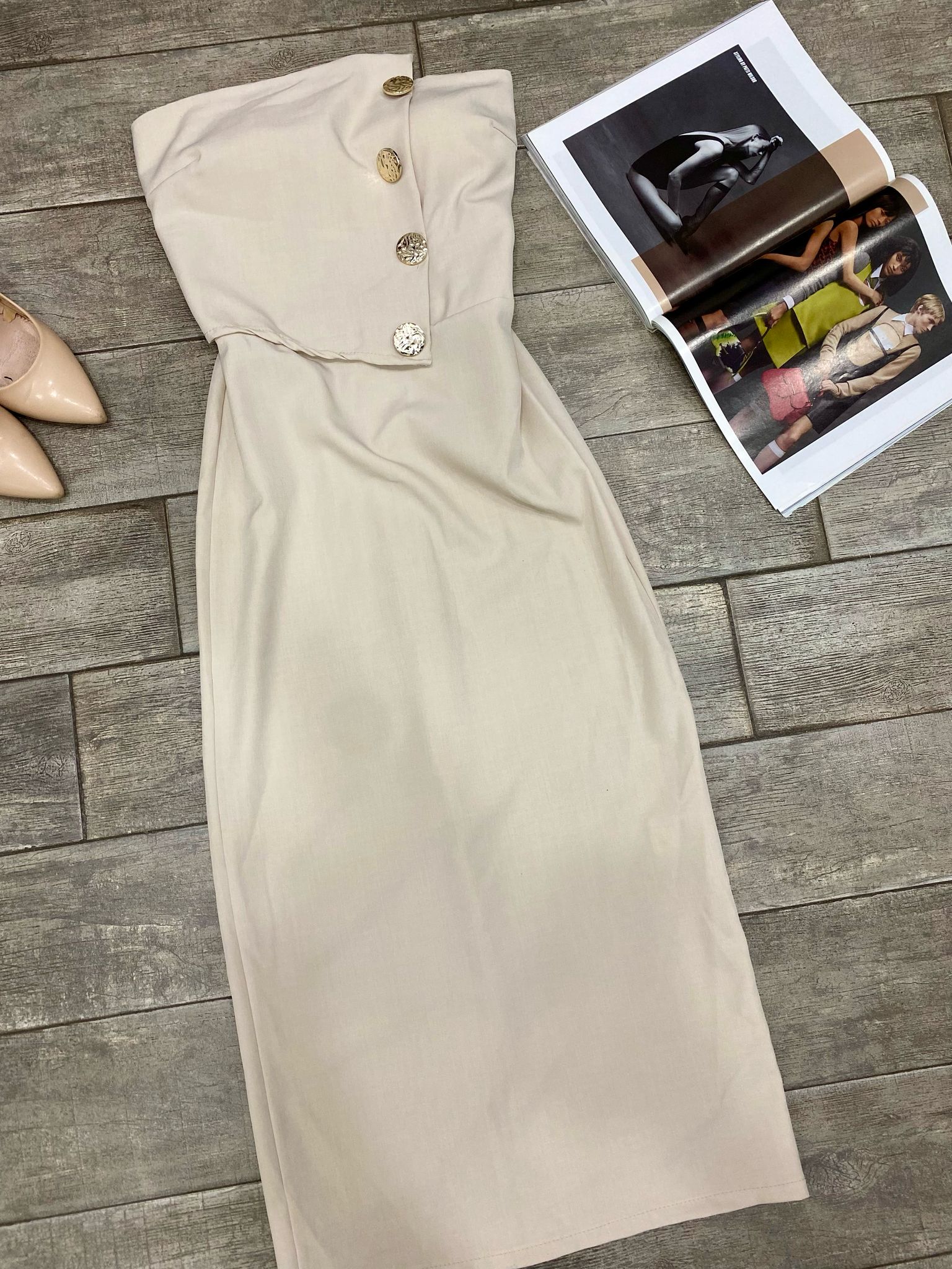 Abito lungo a fascia asimmetrica con bottoni oro , spacco ed elastico sul retro Fabbricato in Italia.