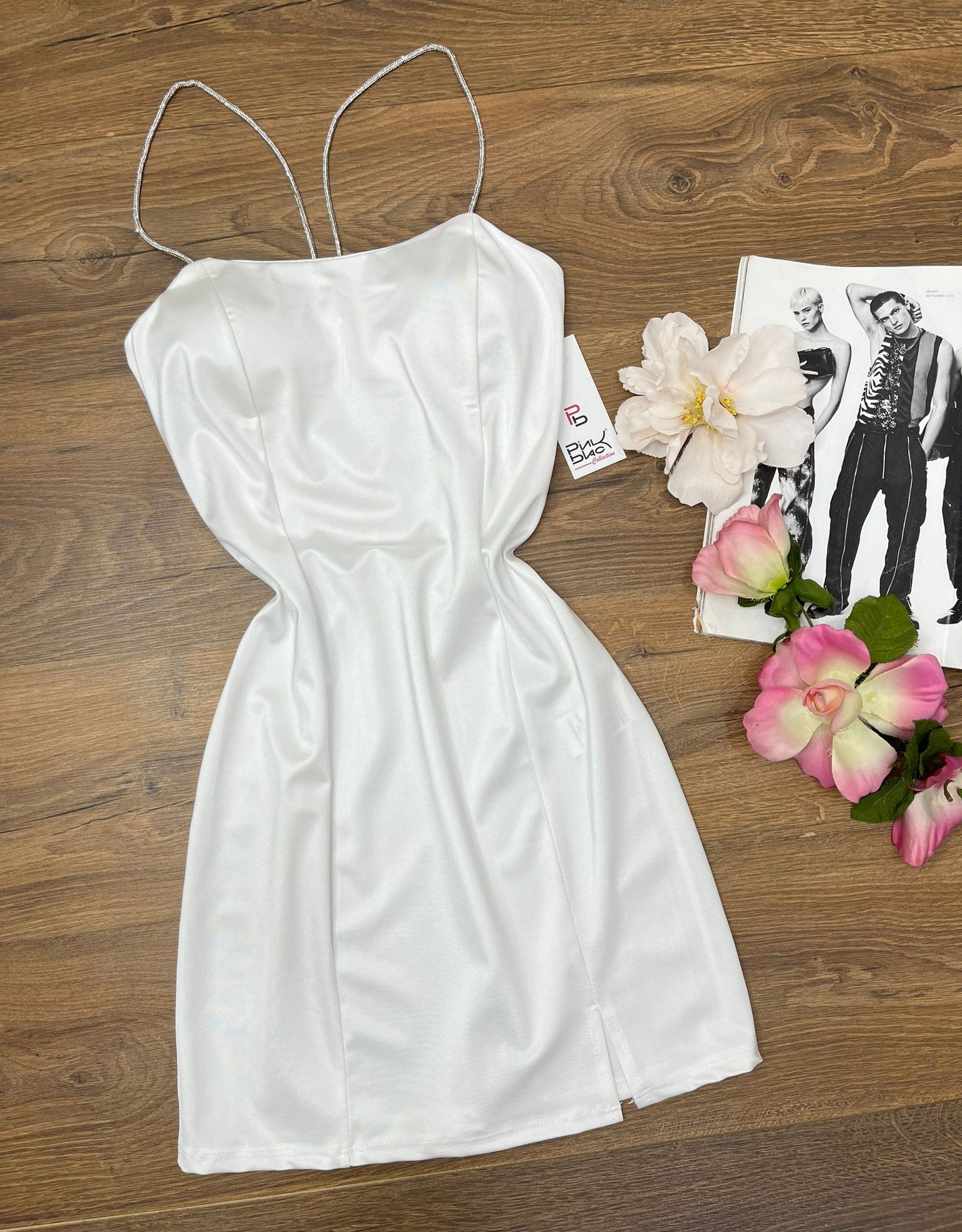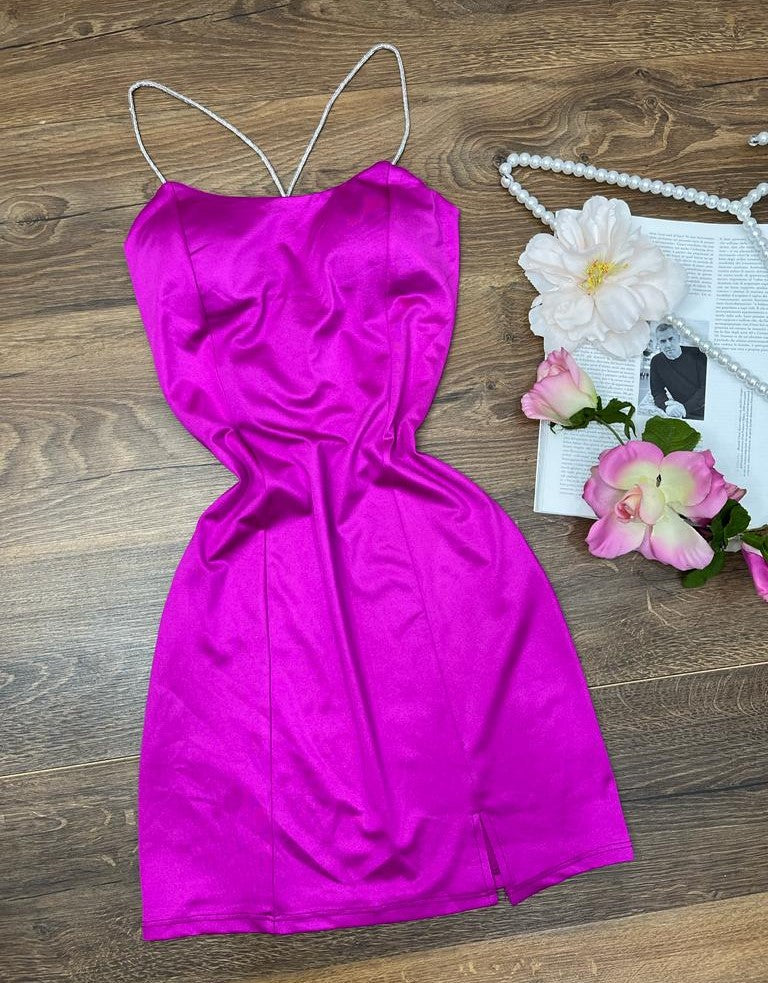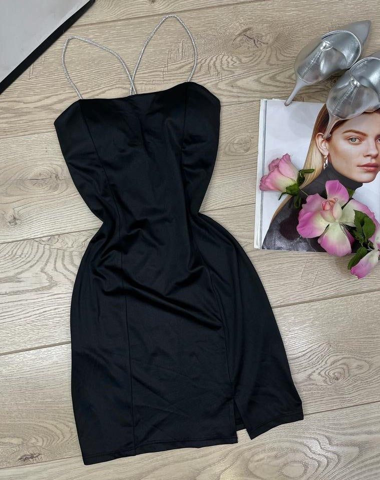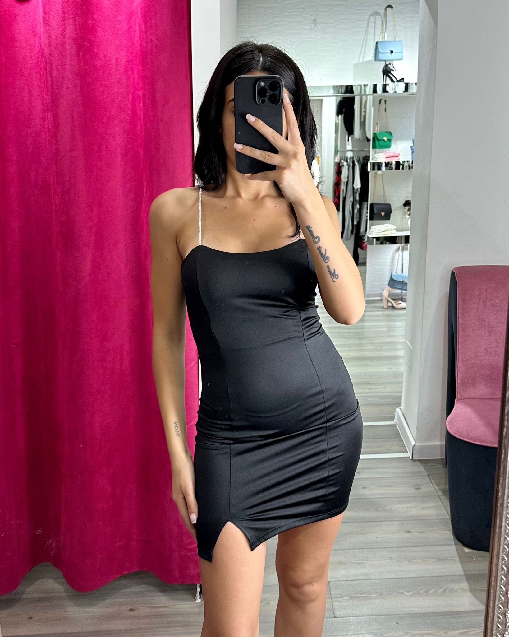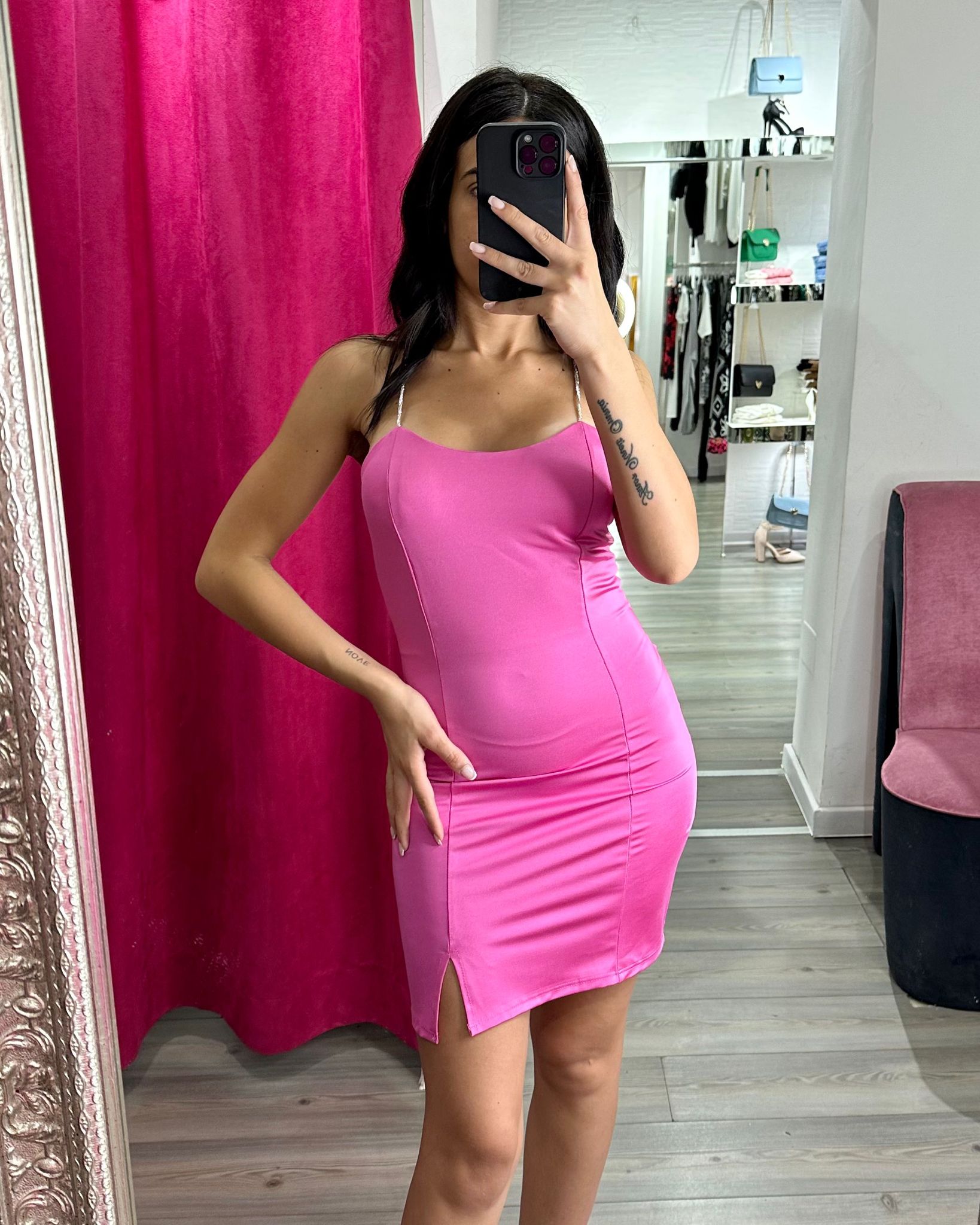 Abito in raso con coppe preformate e spalline con brillantini a incrocio. Fabbricato in Italia.