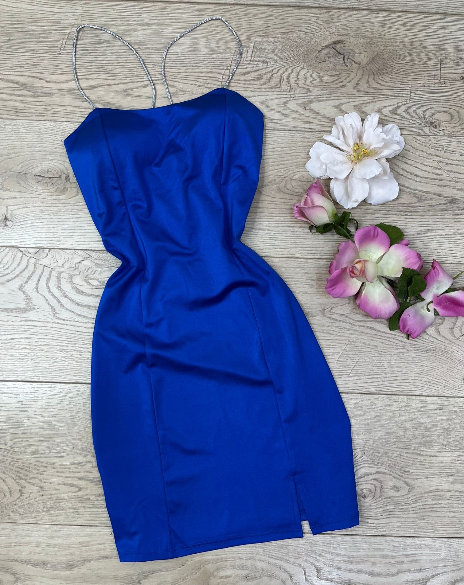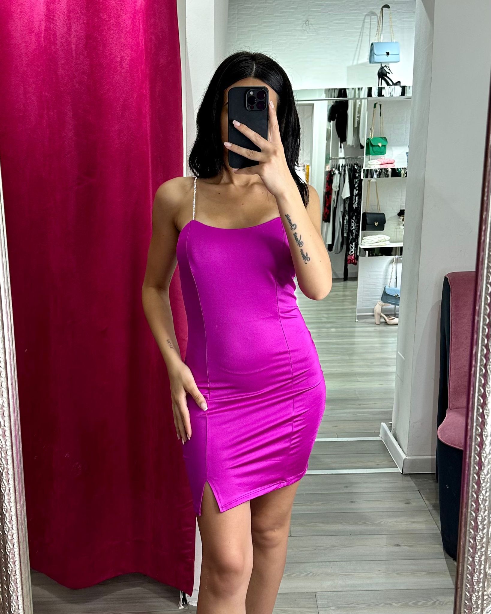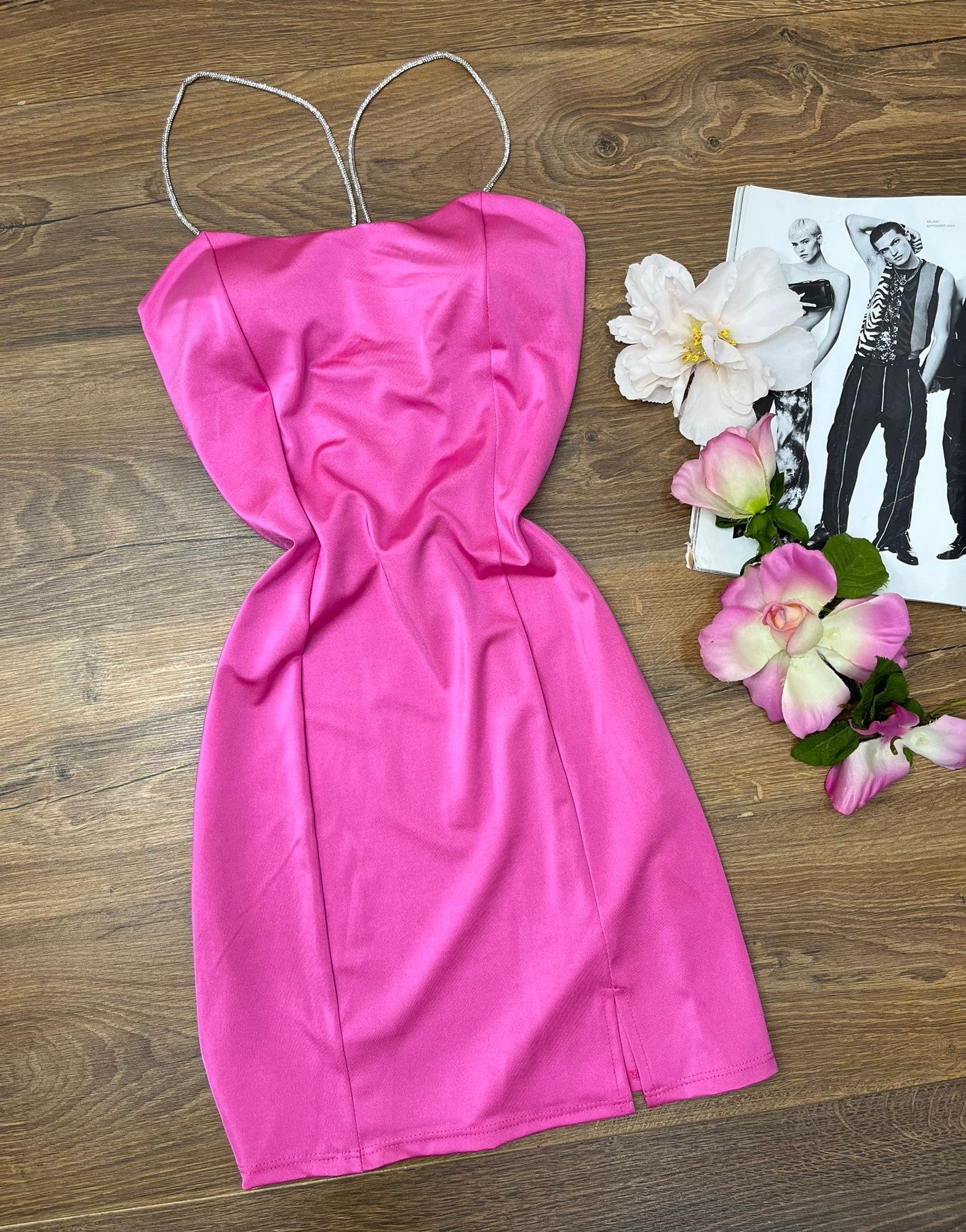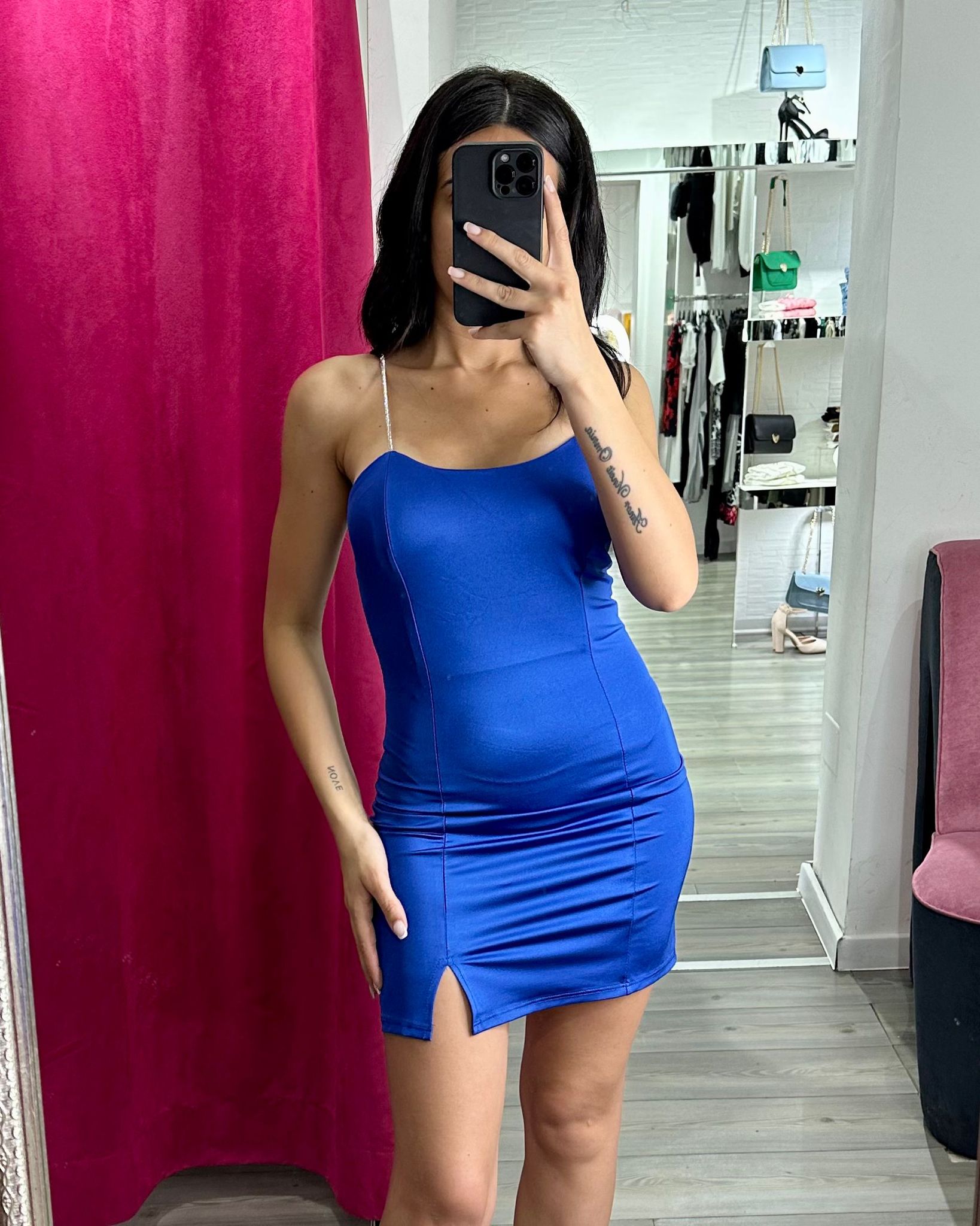 Abito in raso con coppe preformate e spalline con brillantini a incrocio. Fabbricato in Italia.