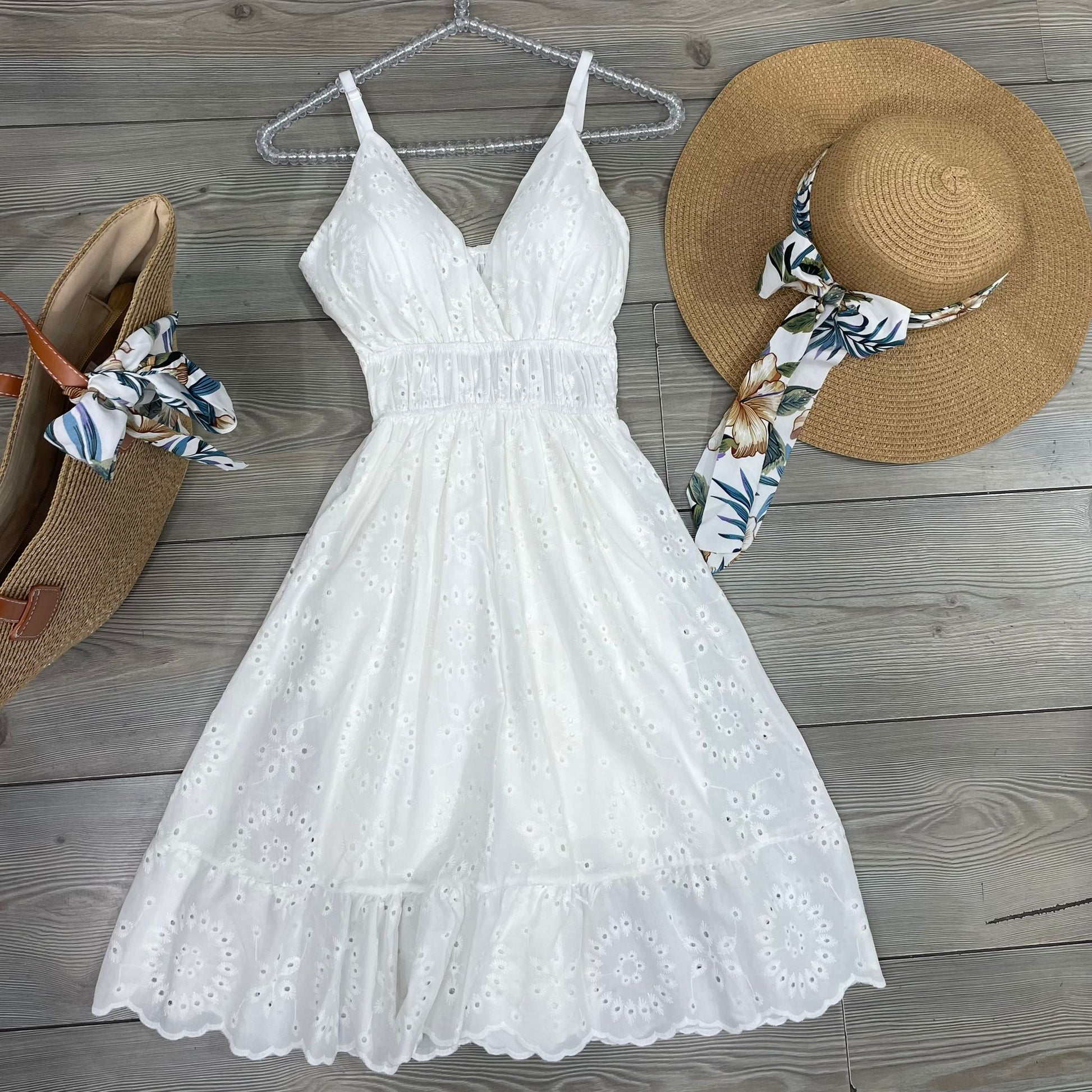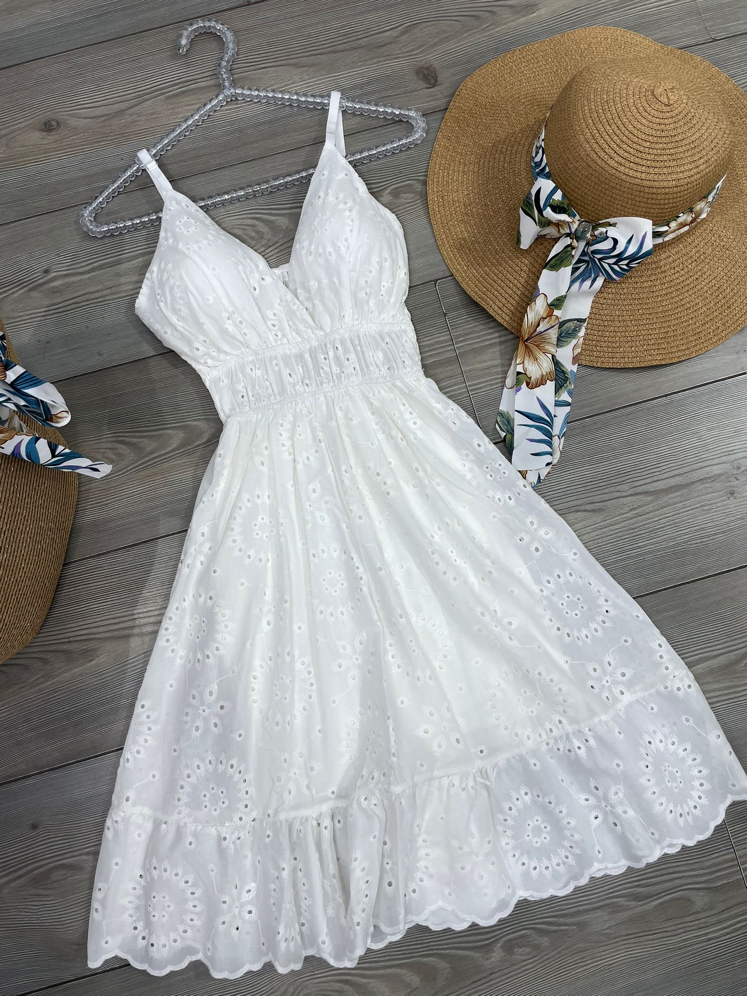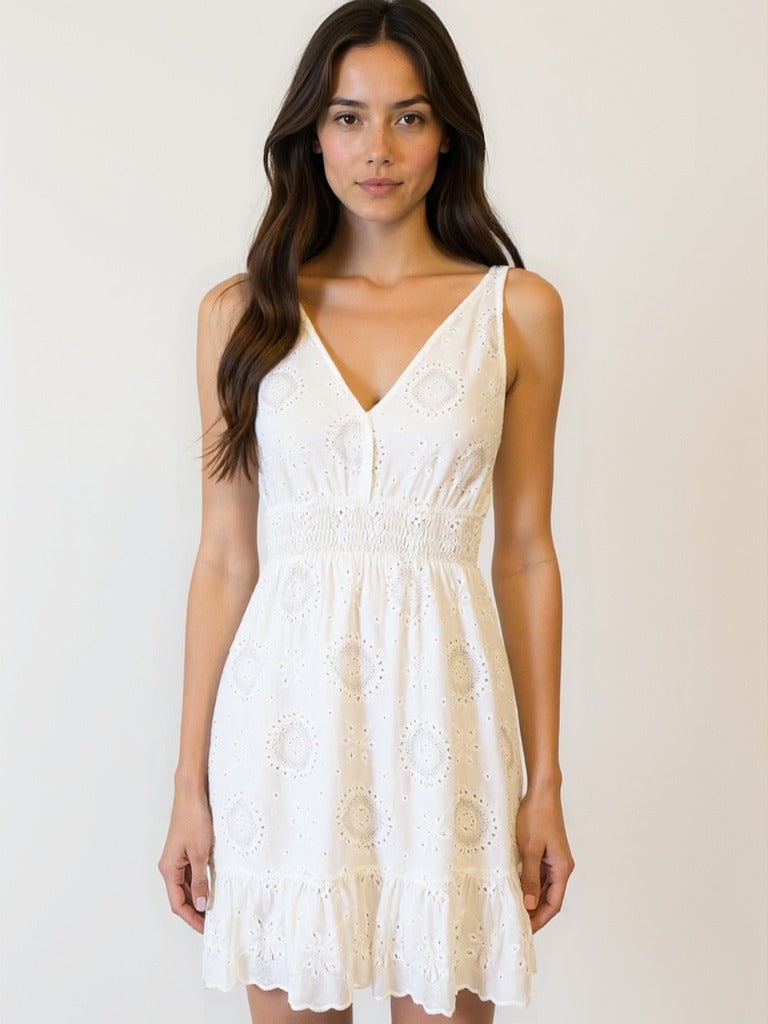 Abito corto effetto pizzo san gallo con coppette preformate spalline regolabili e fascia elastica sul retro.