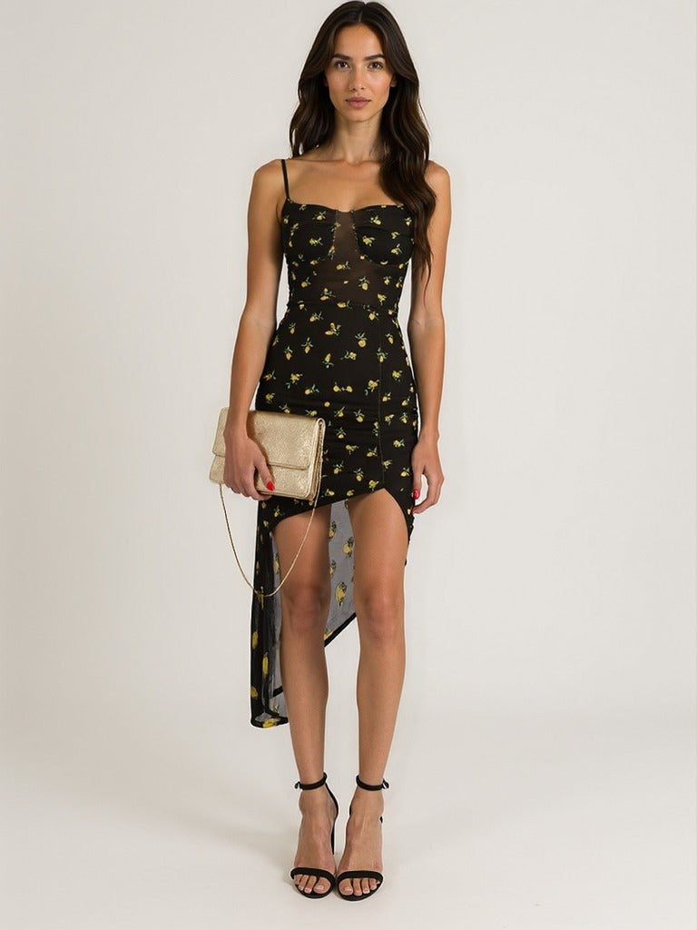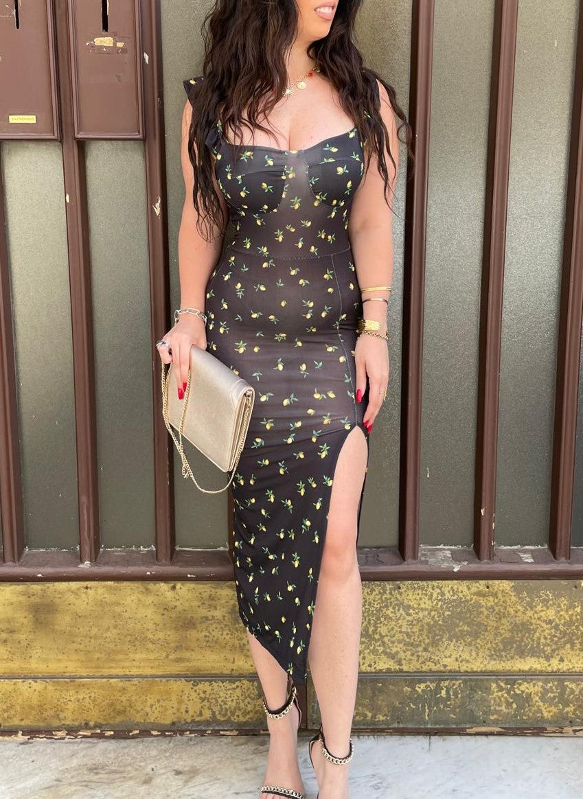 Abito lungo effetto lycra con fantasia, coppe preformate e spacco laterale