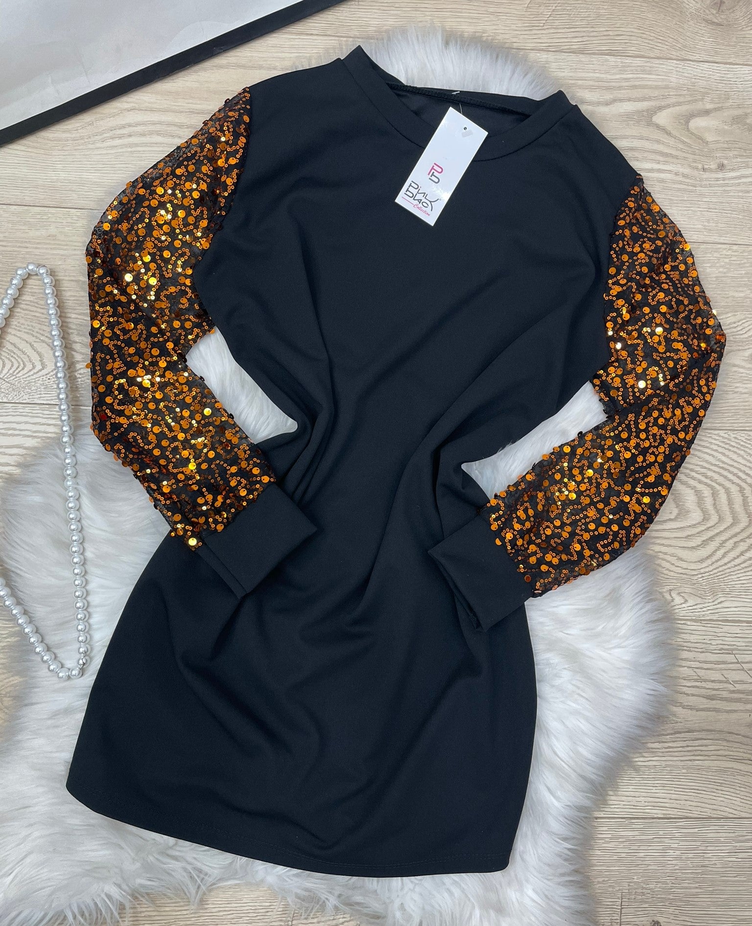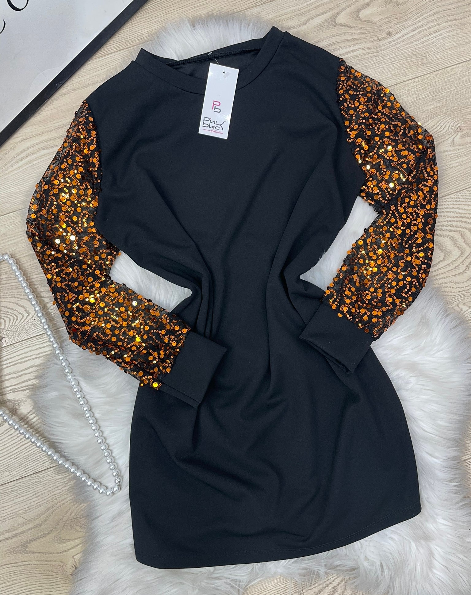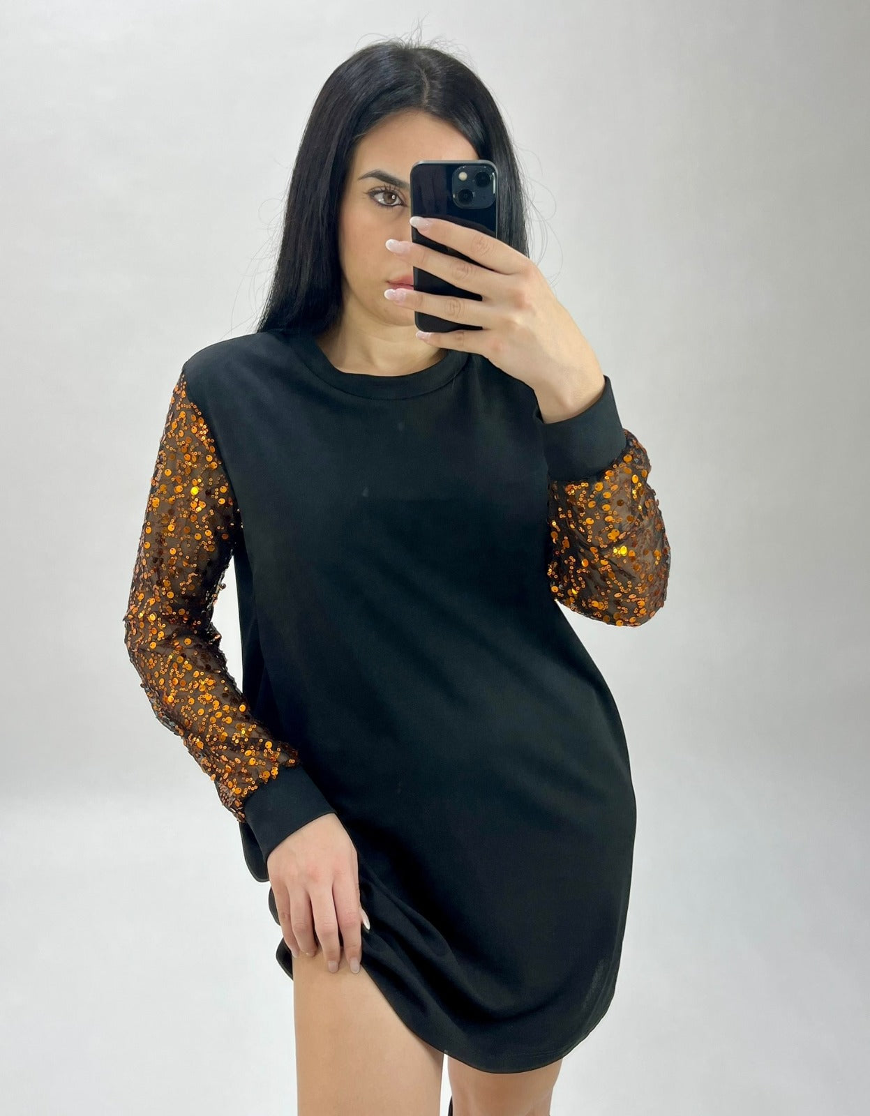 Abito iin tessuto strutturato effetto palloncino, con maniche velata con paillettes. Fabbricato in Italia.