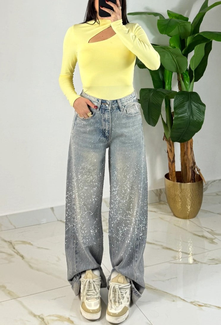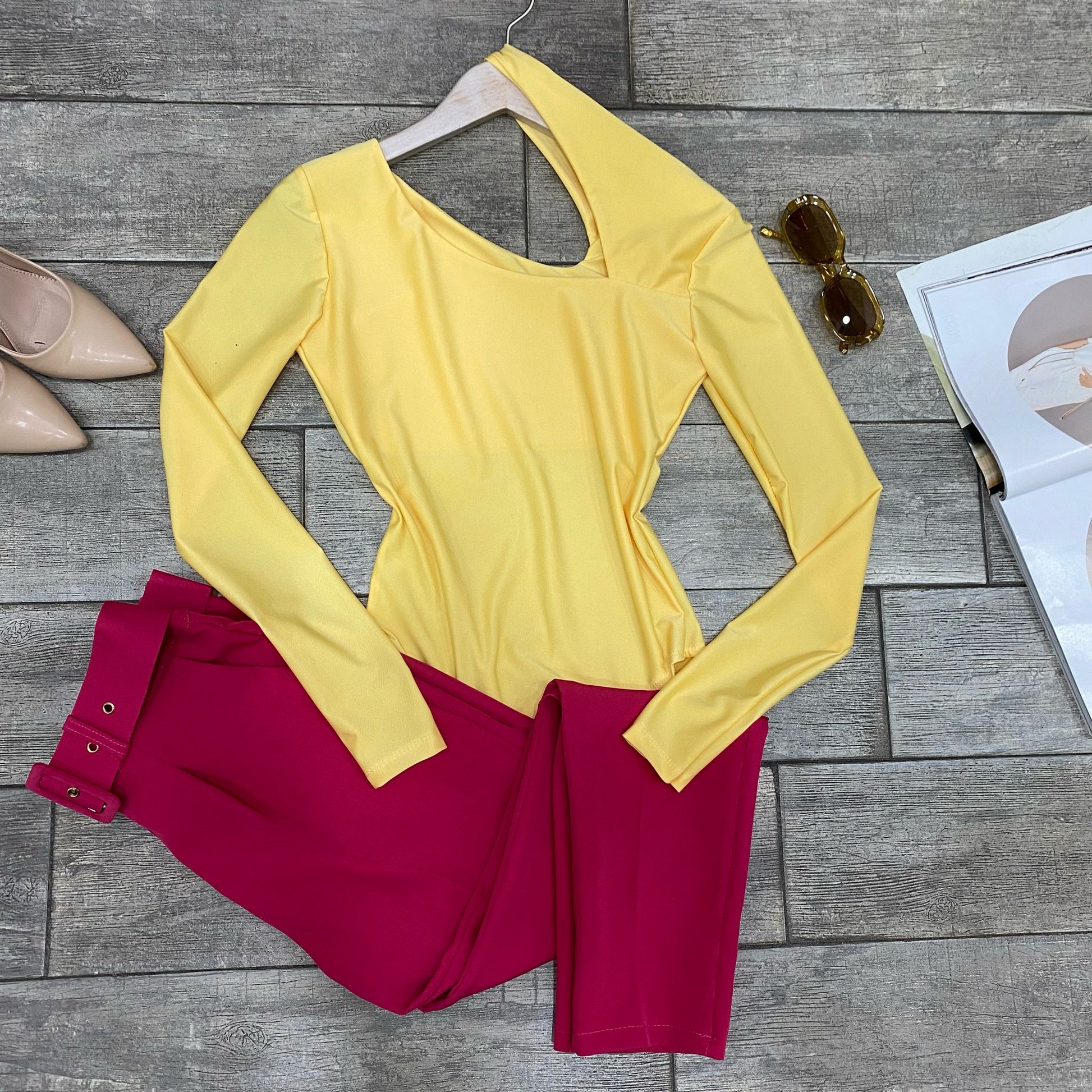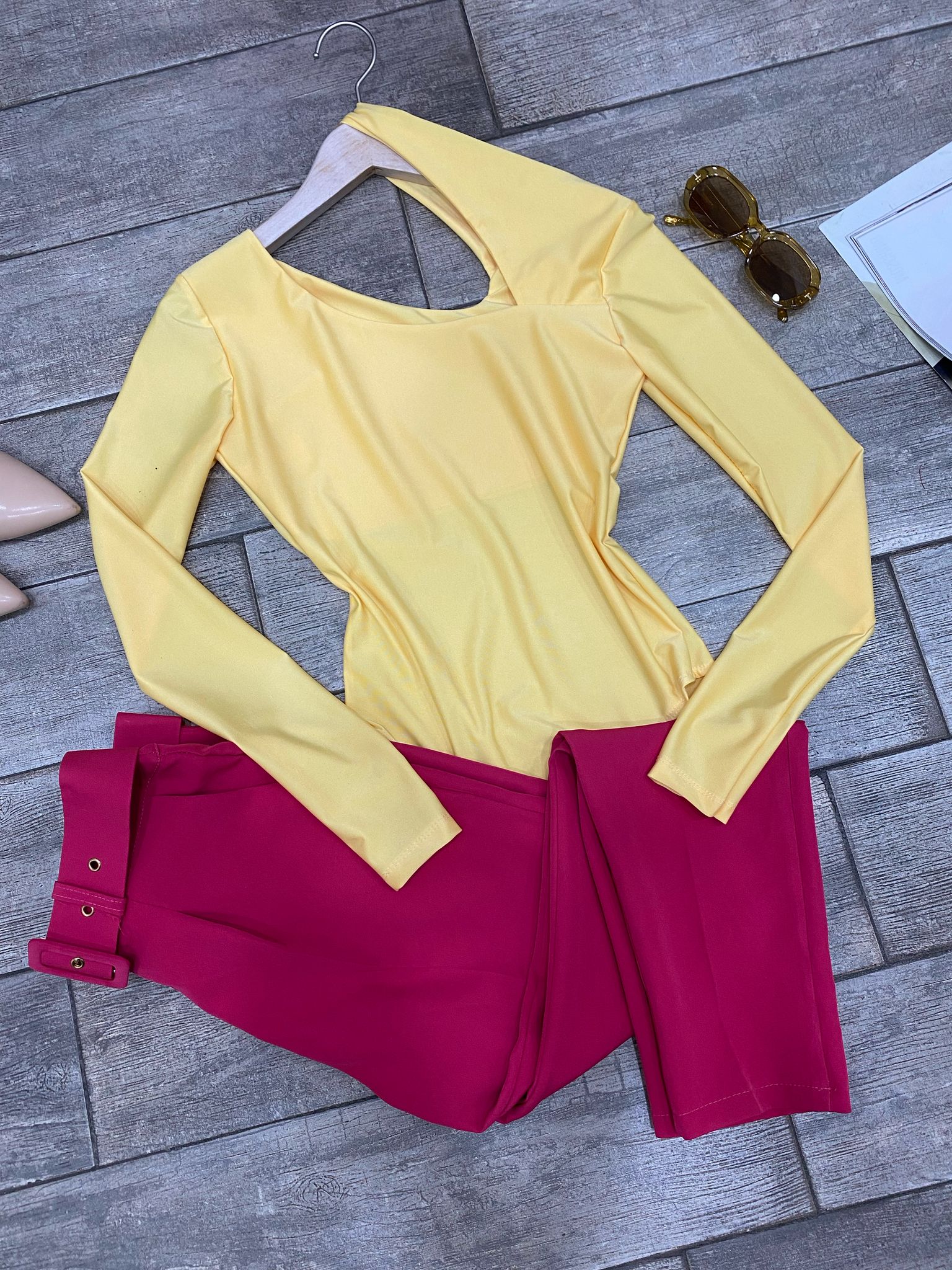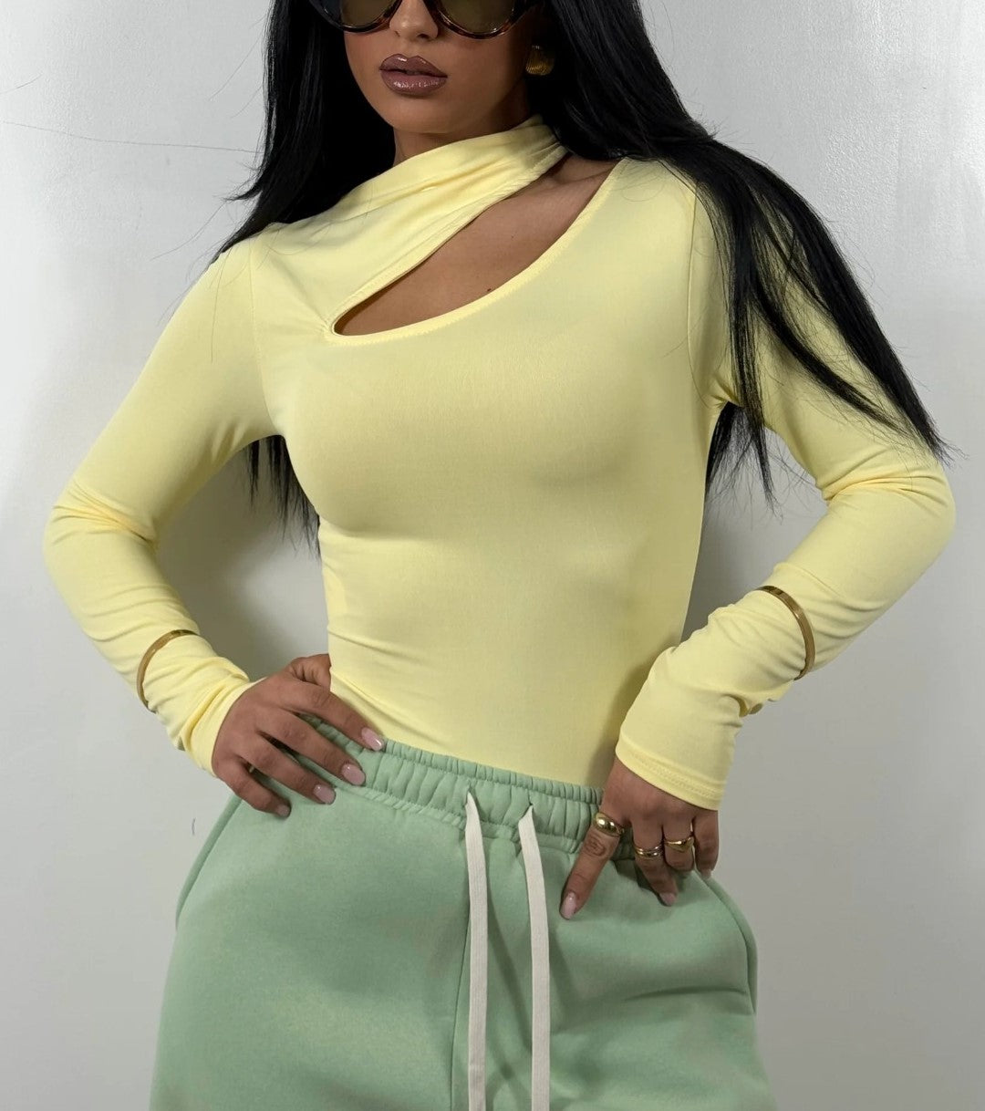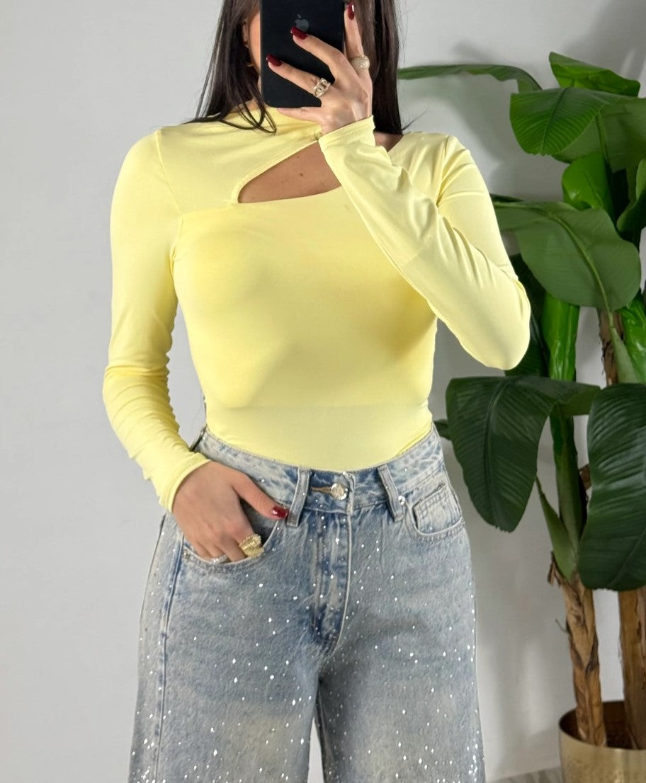 Body effetto lycra con scollatura asimmetrica e ganci sul cavallo