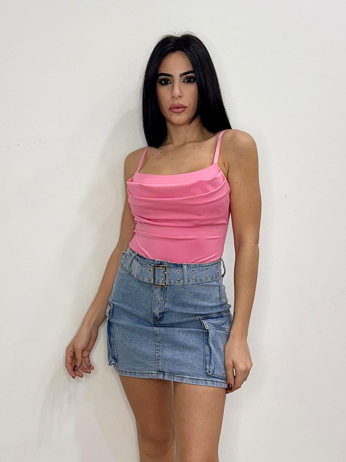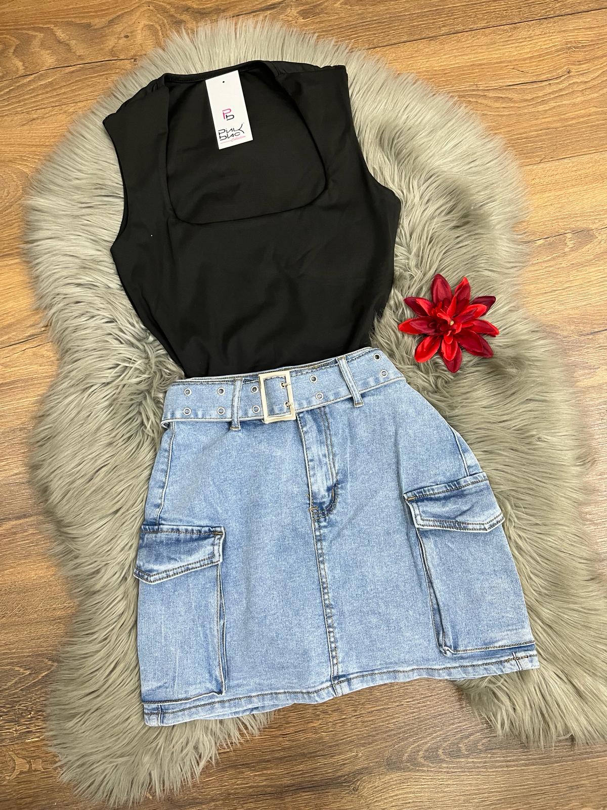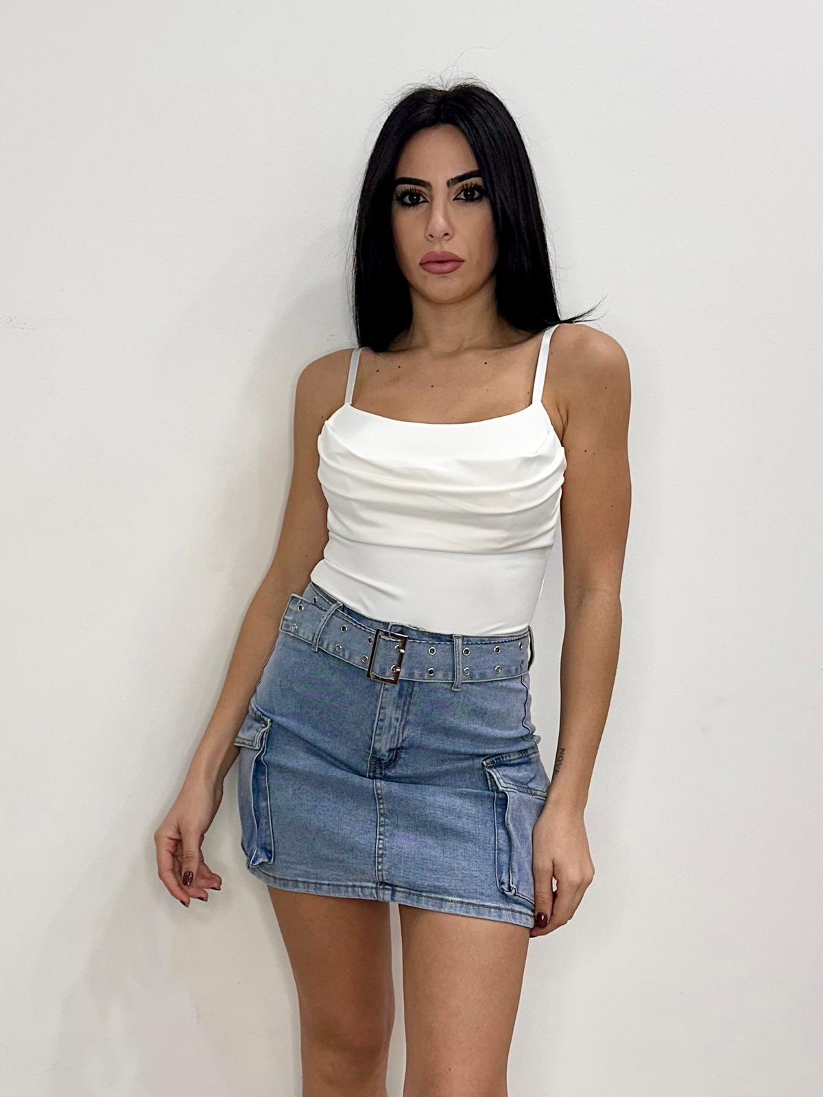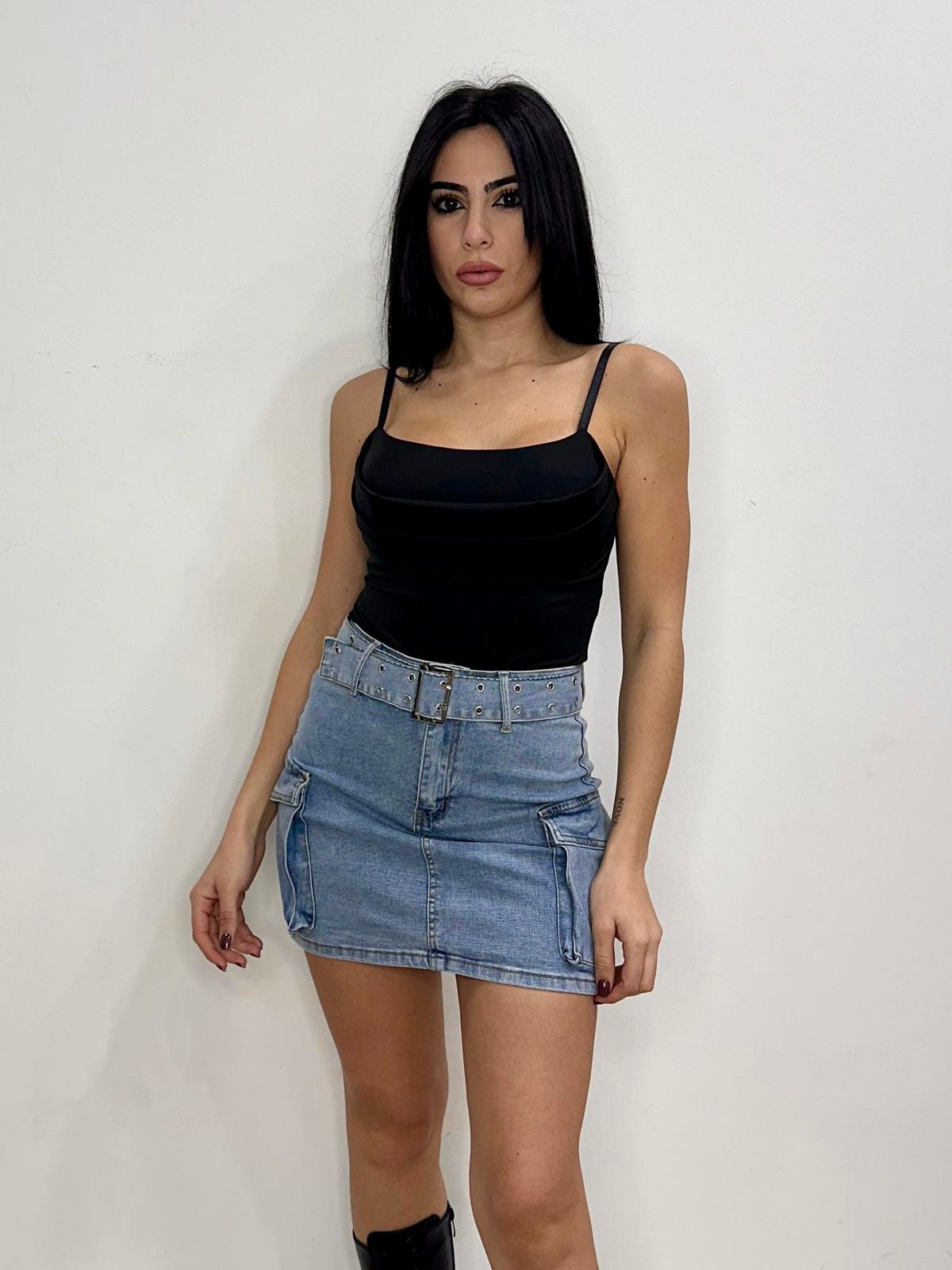 Gonna a jeans con tasconi e cintura inclusa. Fabbricato all'estero.