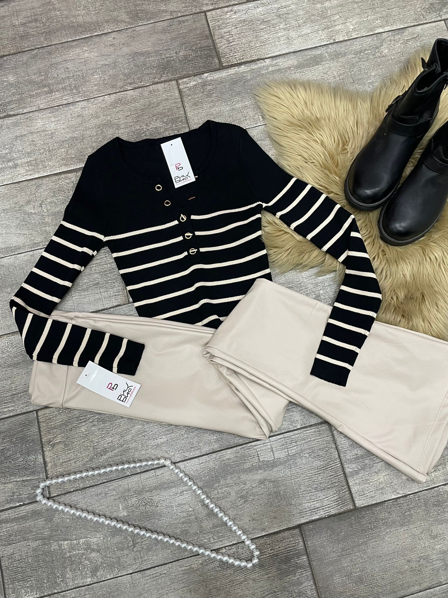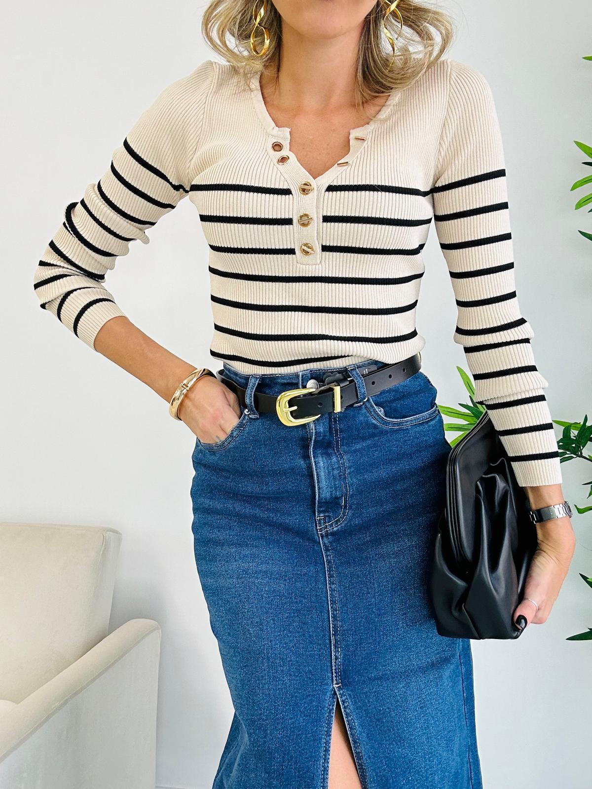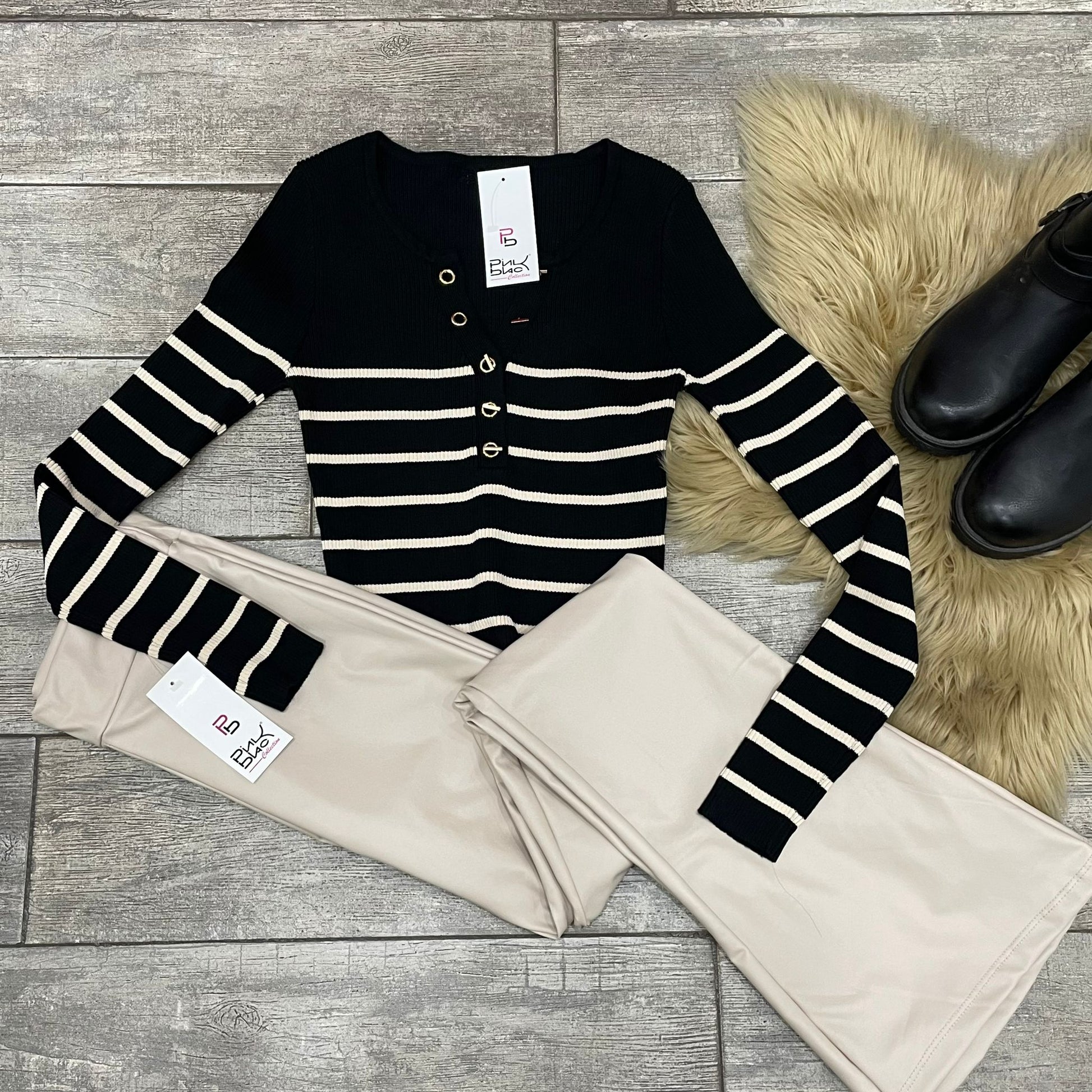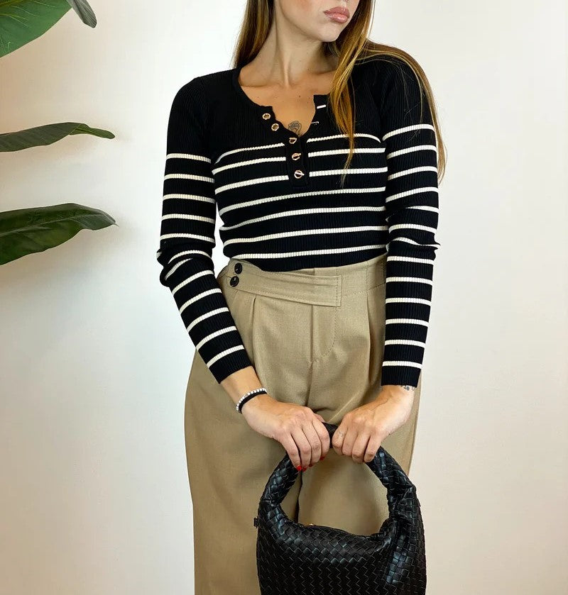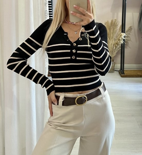 Maglioncino modello crop con design a righe e chiusura con ganci metallici. Fabbricato all'estero.
