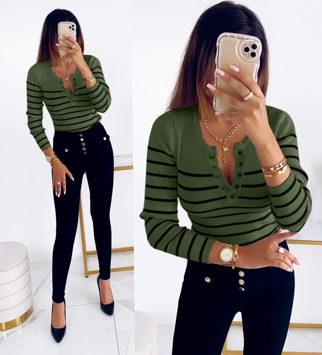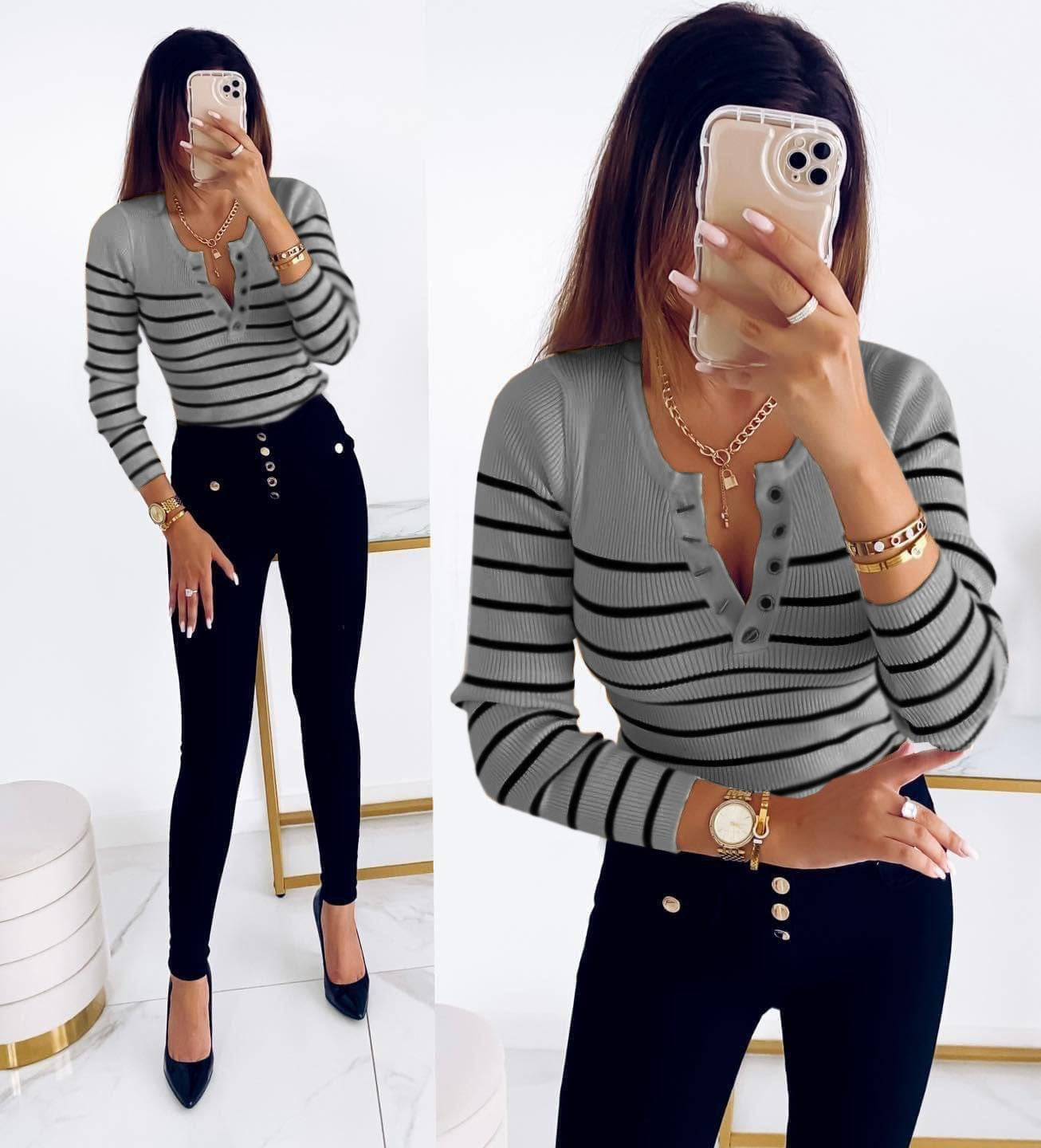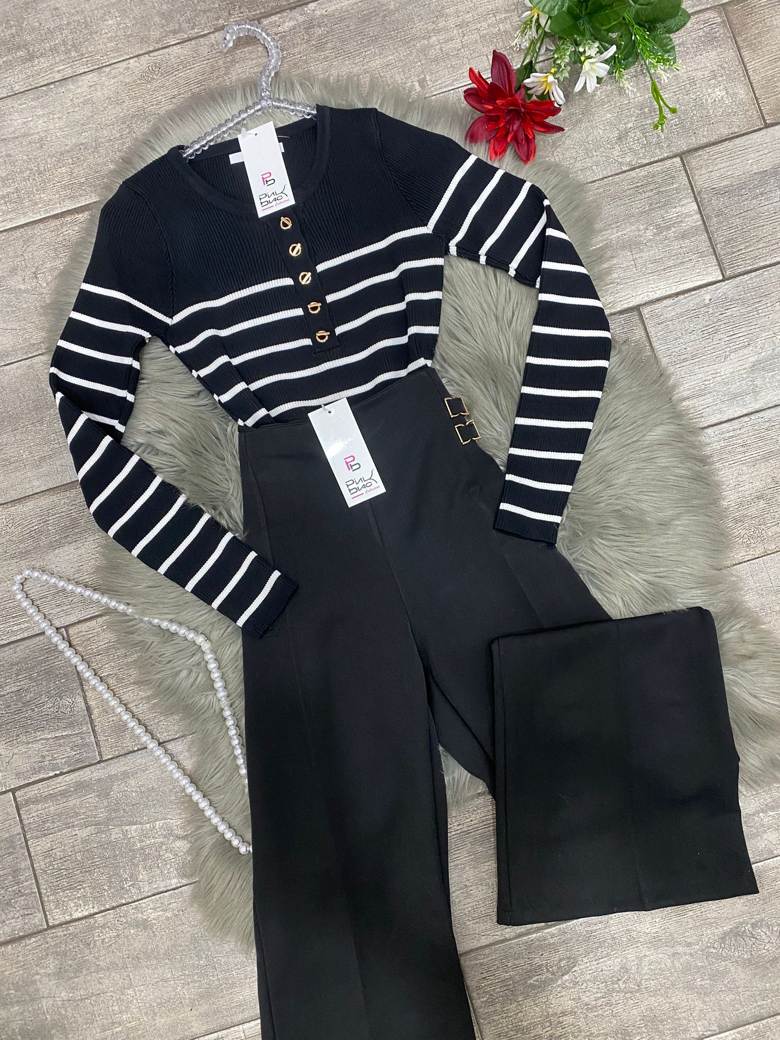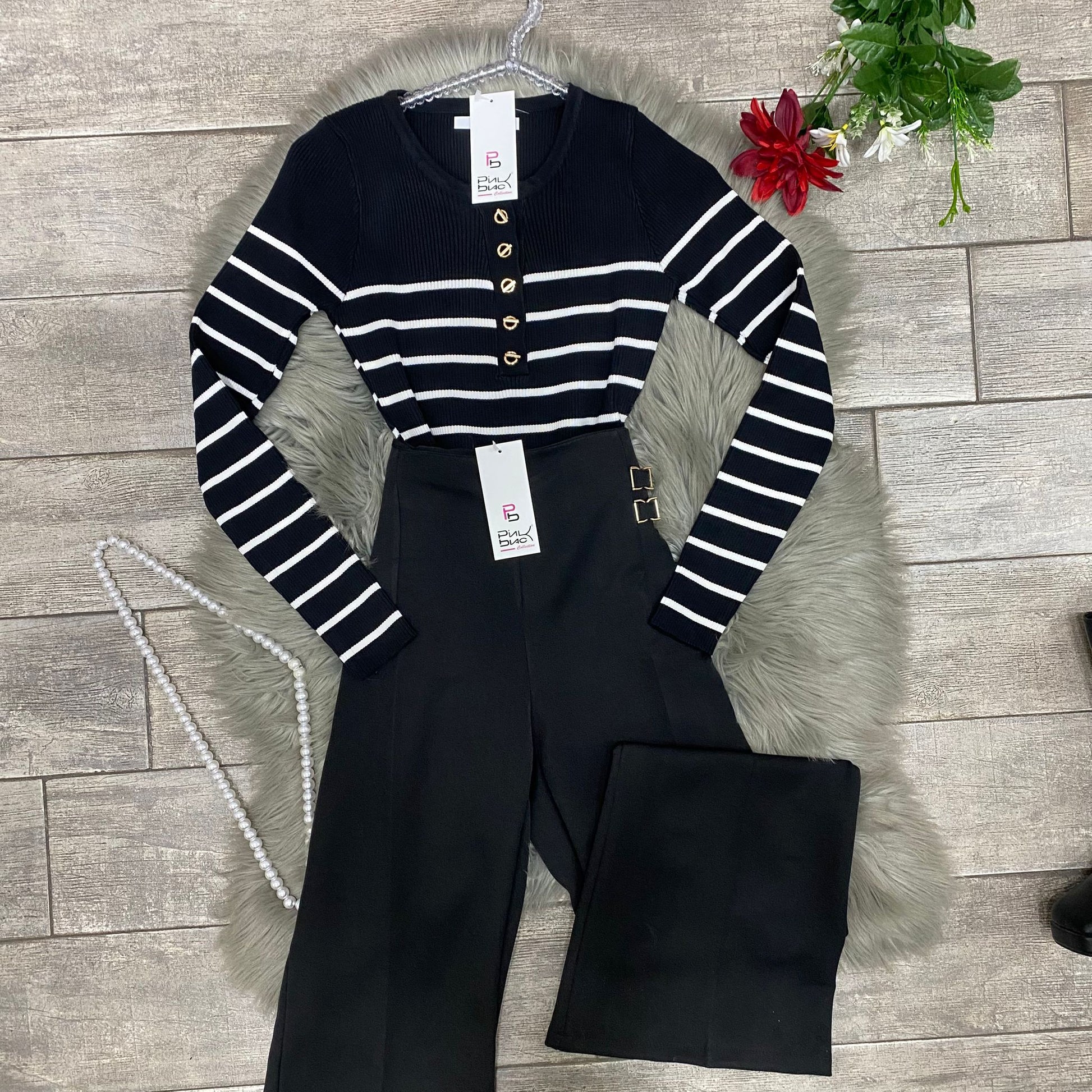 Maglioncino modello crop con design a righe e chiusura con ganci metallici. Fabbricato all'estero.