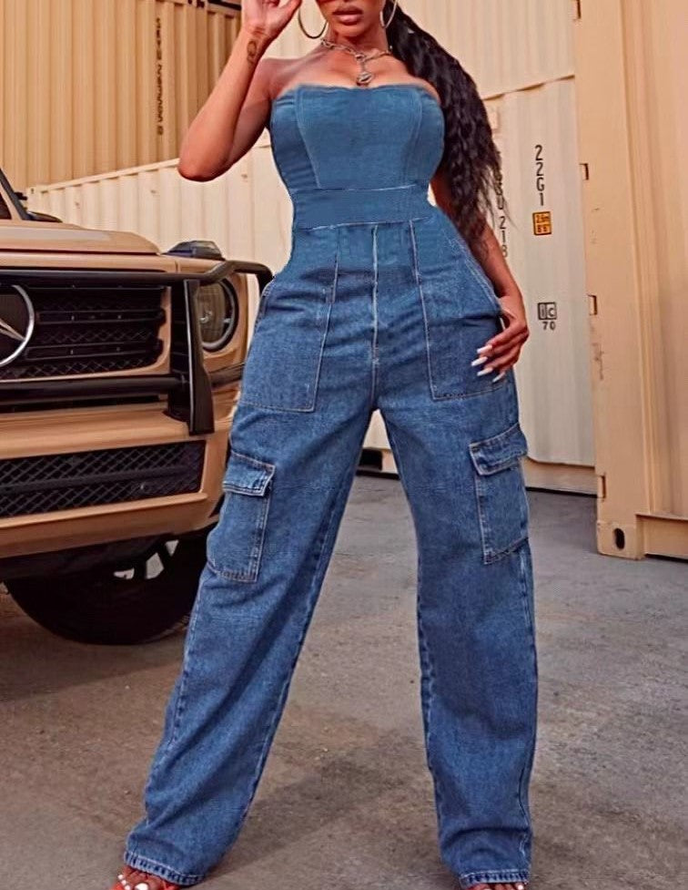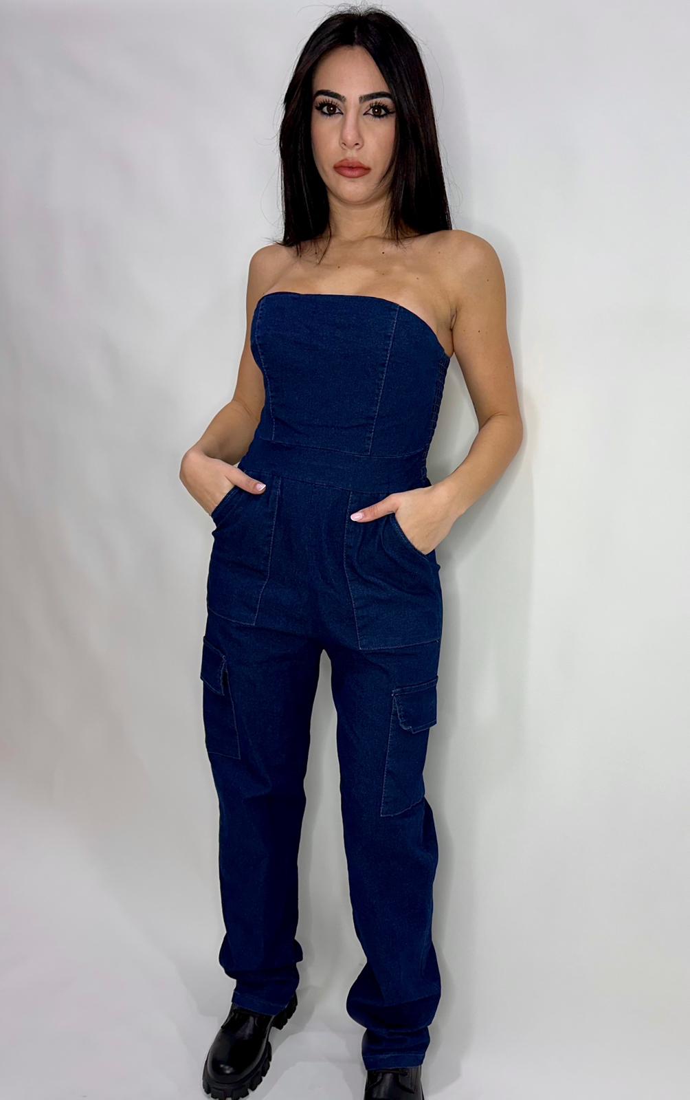 Salopette in denim modello cargo con elastico sul retro . La vestibilità delle taglie risulta regolare. Fabbricato all'estero.