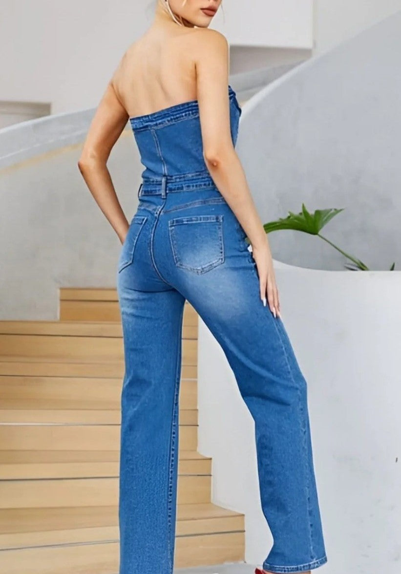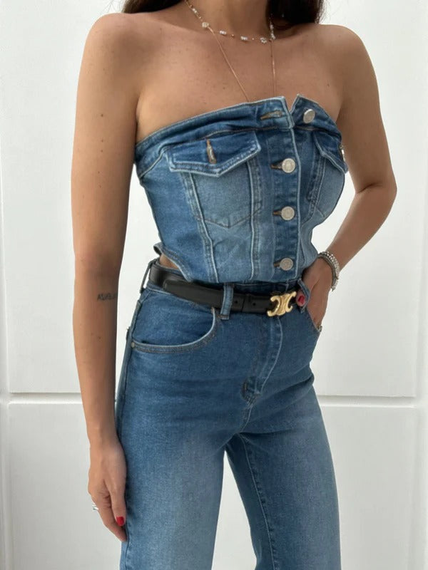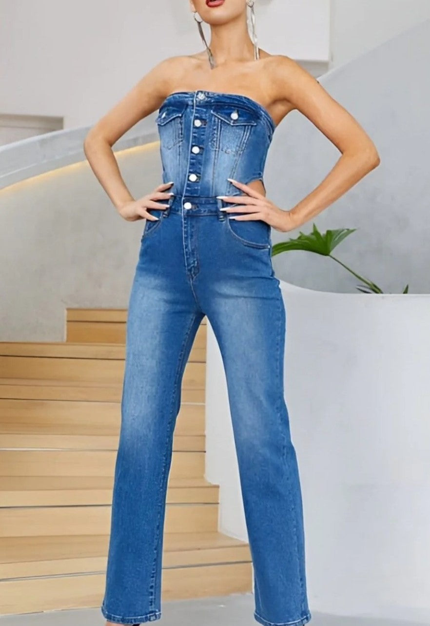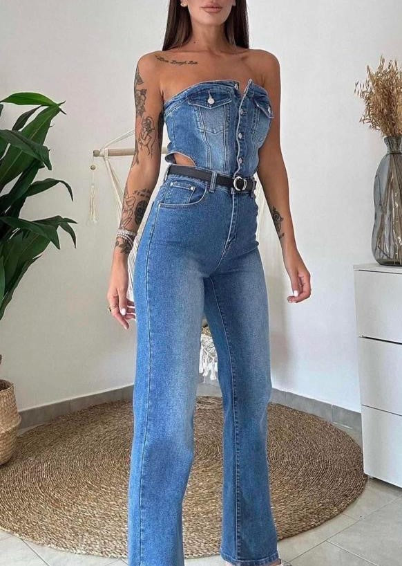 Salopette in denim cut-out con bottoni e tasche. La vestibilità delle taglie risulta regolare. Fabbricato all'estero.