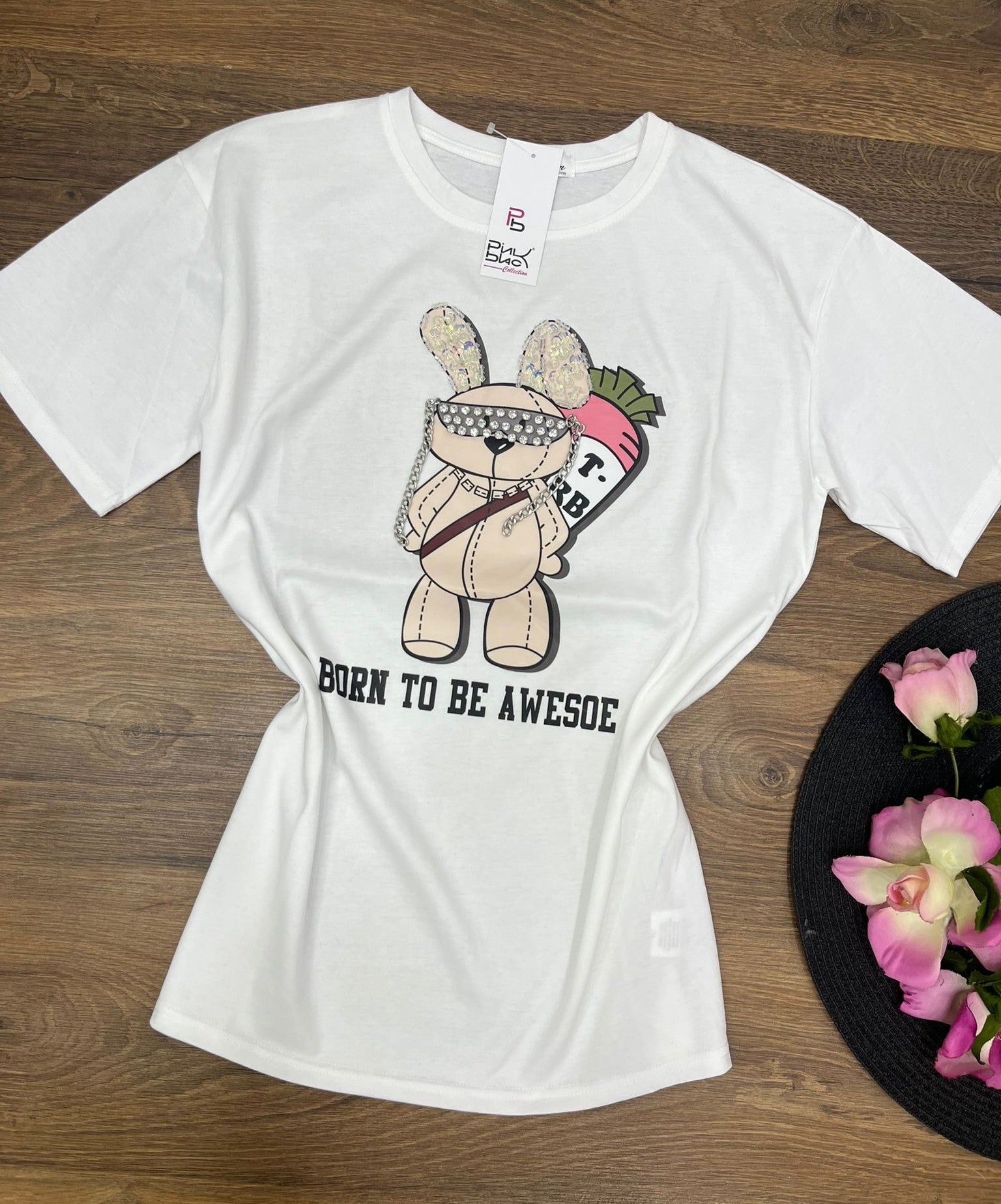 T-shirt con stampa, pietre e strass. Fabbricato all'estero.
